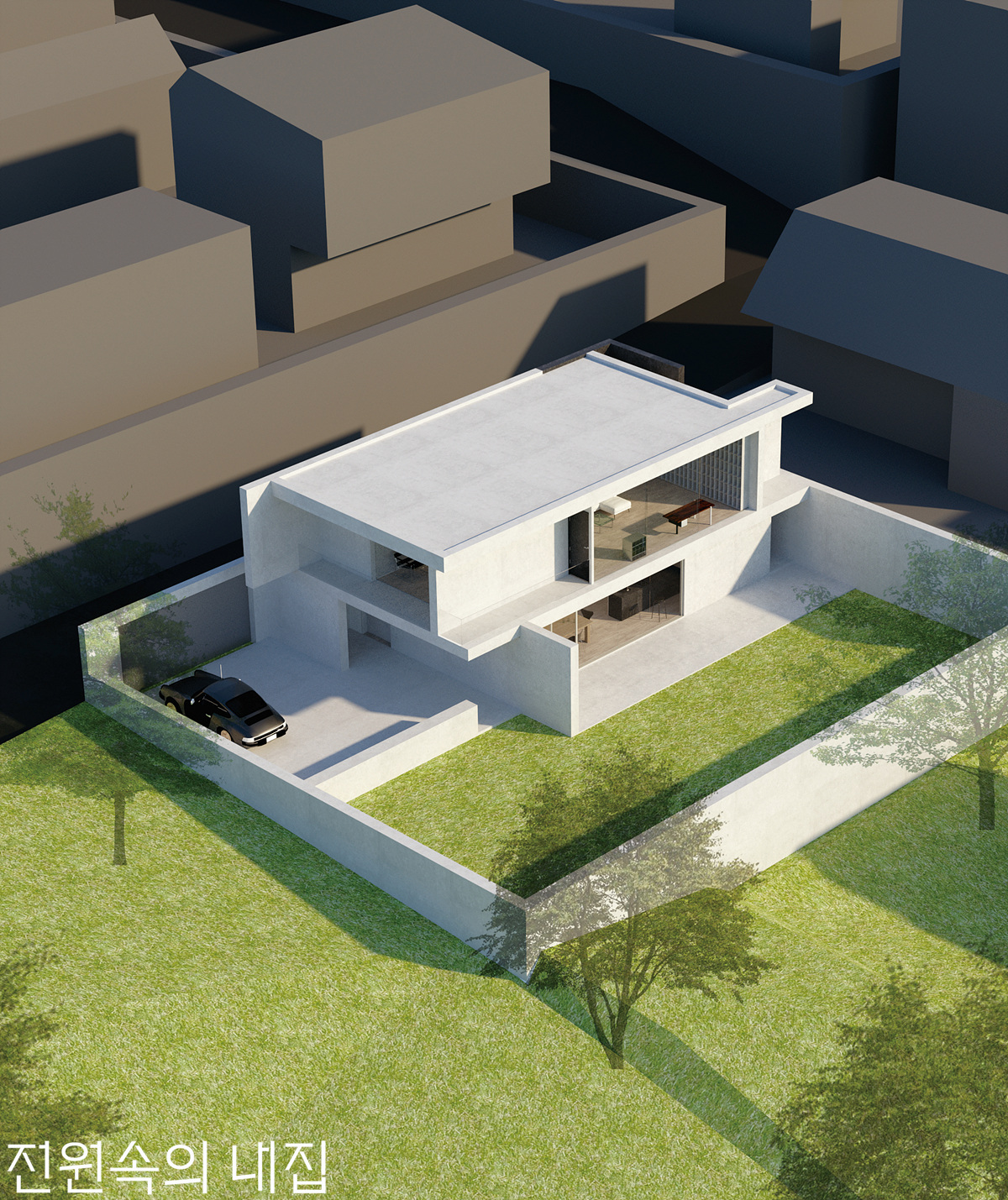 집에 머무는 시간이 적은 건축주 부부에게 필수적인 요소로만 구성한 소형 주택이다. 바쁠수록 잠깐이라도 집 안에서 이루어지는 삶의 중요도가 더욱 높아진다고 판단했고, 이를 위해 거주자가 자신의 삶을 스스로 분석하고 필요한 공간을 직접 조닝할 수 있도록 유도했다. 간결한 형태와 재료로 매스와 외피는 단순하지만, 큰 창을 통해 주변 풍경이 액자처럼 담긴다. 침실, 드레스룸, 욕실 등은 단 하나의 공간(2층)에 집중시키고, 1층에 주방 겸 거실과 작업실을 두어 공간을 분리했다.