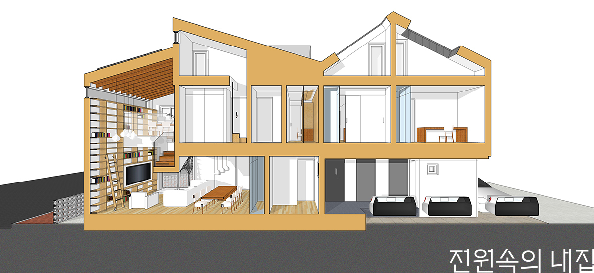 주인 세대, 원룸, 투룸 이렇게 세 가구의 독립적인 생활이 가능하도록 수직 방향으로 가구를 분리하였다. 여기에 가구별로 따로 쓸 수 있는 마당 및 옥상 정원 등 외부 공간을 구성했다. 그러나 건물 외관은 마치 한 채의 집으로 보일 수 있게, 연속된 경사지붕을 통해 독특한 조형감을 부여하였다.