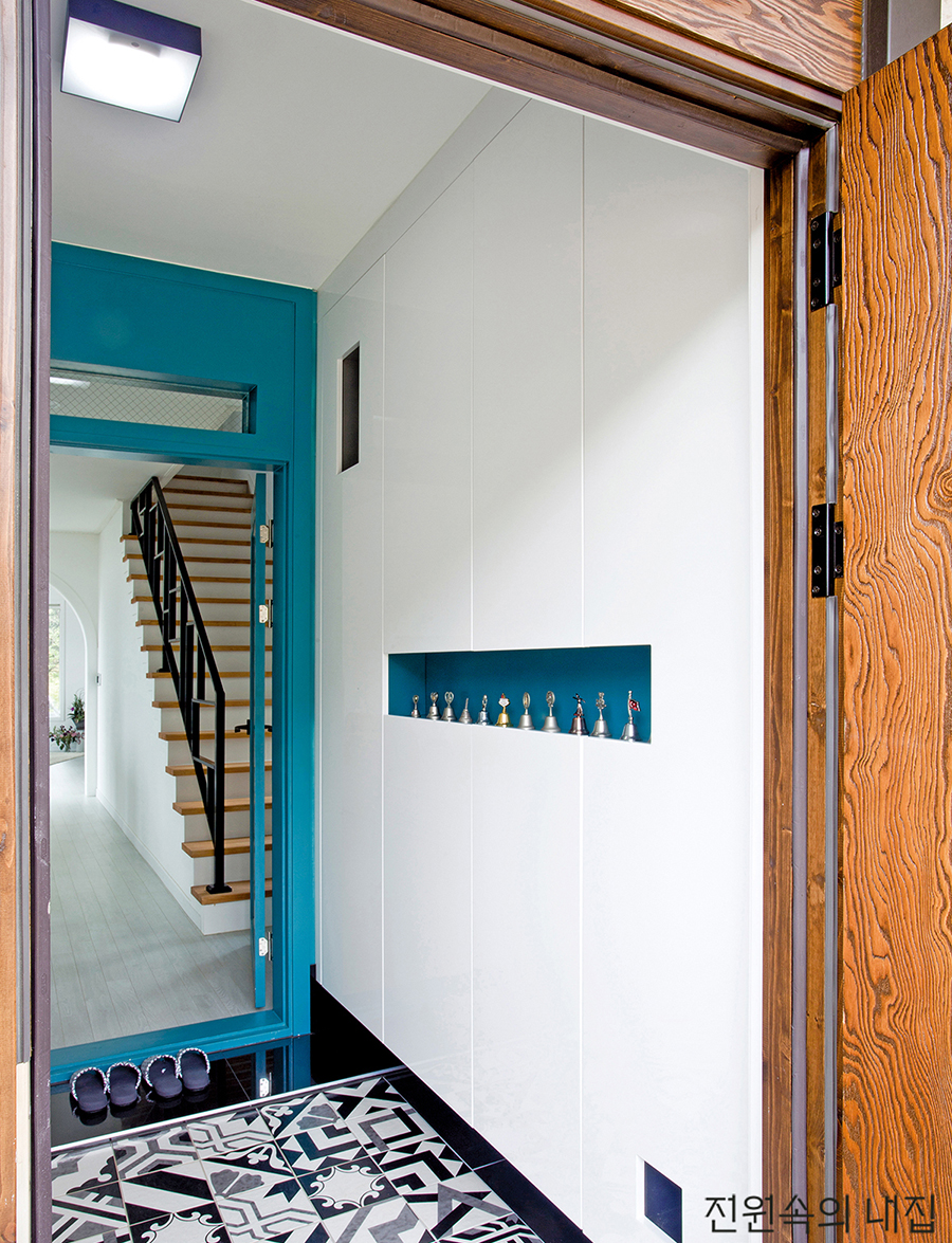 기성 신발장은 선반 사이즈와 문 모양만 골라서 배열하듯이 제작된다. 이런 신발장은 오로지 기능적인 부분만 강조된 형태일 수밖에 없다. 오른쪽 사진은 현관 중문과 동일한 컬러로 신발장 오픈 부분에 포인트를 주어 중문과 신발장이 한 몸처럼 보이도록 디자인했다. 중앙에서 손잡이를 대신하는 오픈 부분과 위·아래로 장식 효과가 있는 오픈 부분을 만들어 기능과 디자인을 모두 살렸다. 이 공간은 장식장 역할도 겸할 수 있다. 신발장은 공중에 띄워서 바닥이 더 넓어 보이게 하는 효과를 더했다.