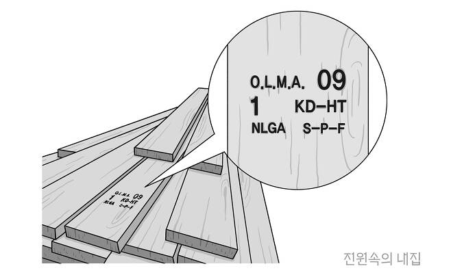 5번은 구조재의 건조 방식이나 상태를 가리키는 것입니다. ‘KD-HT’에서 KD는 인공건조라는 뜻이지만, 목재 수분(함수율)이 19% 이하라는 뜻을 갖기도 합니다. HT는 해충을 죽일 수준의 열처리가 되어있다는 것으로, 이 자리에는 S-Dry, S-GRN가 적히기도 하는데, S-Dry는 자연 또는 인공건조로 함수율 19%로 맞춘 목재, S-GRN은 함수율 19%를 초과하는 건조되지 않은 목재를 가리킵니다.