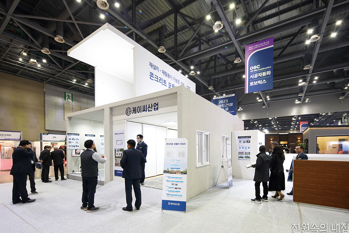 빈틈없이 채워진 행사 스케줄로 가득한 킨텍스 전시장. 신속하고 간편한 설치와 해체가 곧 미덕인 이곳 전시장에 ‘2023 스마트 건축 엑스포’를 맞아 케이씨산업 부스에 2층 규모의 철근 콘크리트 구조물이 세워졌다. 통상적인 철근콘크리트 구조물이라면 철근 배근과 거푸집 설치, 타설과 마무리 작업까지 몇 주는 걸렸을 일이다. 하지만 케이씨산업의 구조물은 설치에 걸린 시간이 몇 시간에 불과했다. 이런 철근 콘크리트 구조물을 하루 만에 만들 수 있는 이유는 공장에서 모듈을 제작해 현장에서는 설치만 하는 콘크리트 모듈러 공법이기 때문이다. 해체와 재사용도 거의 그대로 옮겨가면 되기에 행사가 끝나고 순식간에 끝났다.
