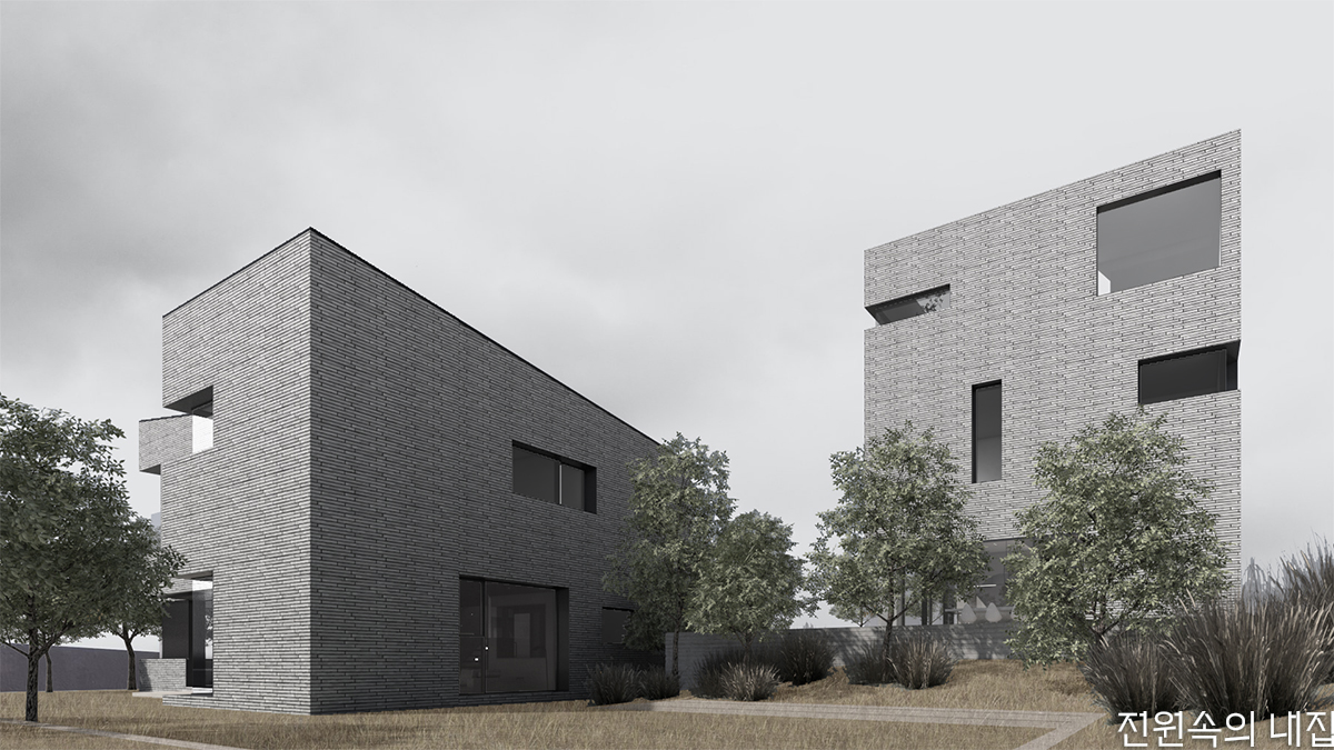 전원주택 단지의 위쪽 끝자락 필지로, 산자락 아래의 단지 풍광을 누리는 훌륭한 전망을 가졌다. 큰 대지를 친척과 함께 구매한 후 분할해 총 두 개의 주택을 만드는 프로젝트였다. 대지 위에 들어설 친척의 집과 이미 자리 잡은 주택이 서로 간섭받지 않으면서 각자의 풍광을 최대한 즐길 수 있도록 하는 것이 프로젝트의 주안점이 됐다.
