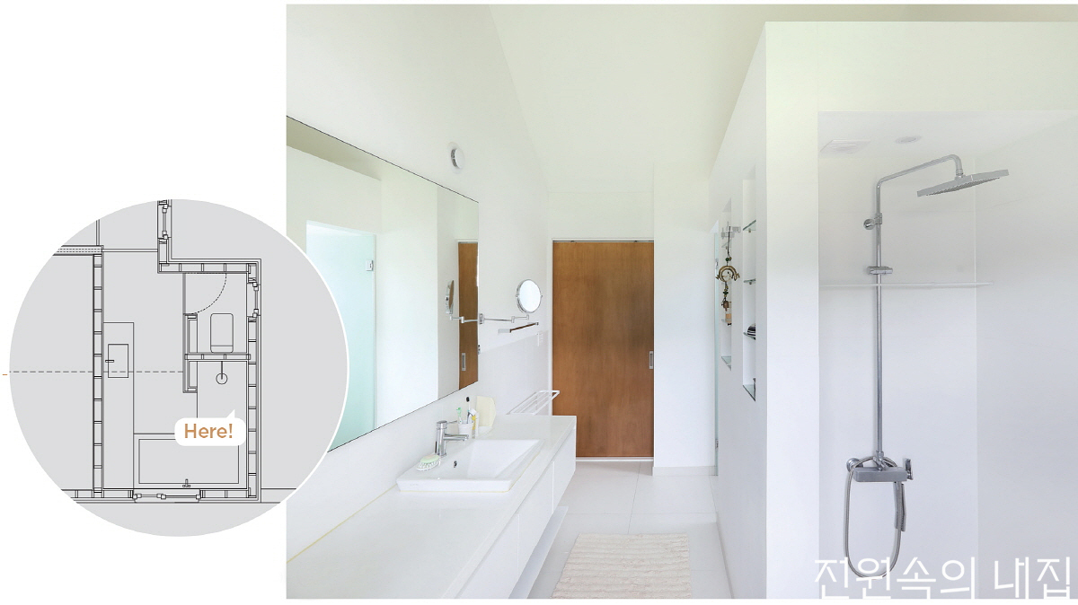 바쁜 아침에도 무리 없도록 2개의 세면대와 2개의 샤워실을 구축해 동선이 겹치지 않게 했다. 더존하우징