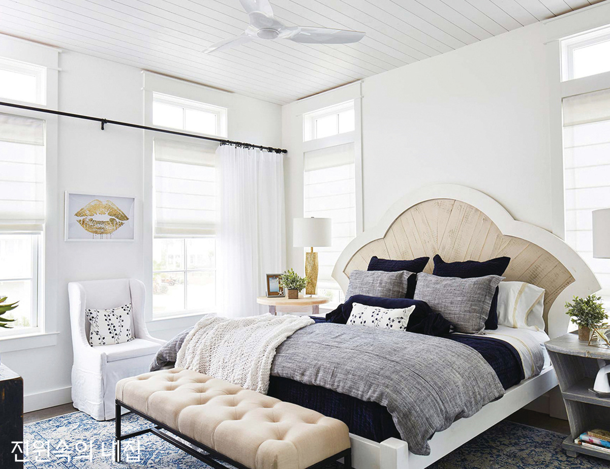 층고가 높지 않은 침실은 커튼, 베딩, 침대 헤드 등 기존의 포인트 컬러를 고려해 실링팬의 색상을 선택한다. 수면에 방해되지 않는 무소음 모터인지도 확인한다.