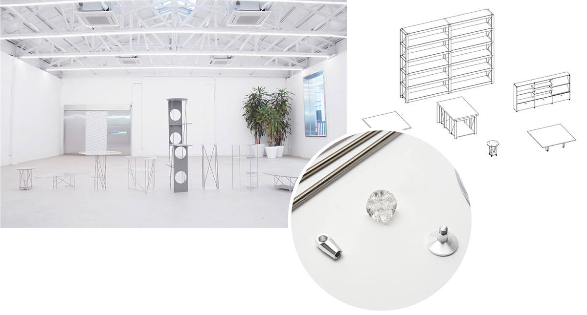 알루미늄 패널과 브래킷, 와이어, 고정 볼트 등의 조립을 통해 원하는 크기, 형태의 선반 시스템을 구현한다. 서랍, 도어, 디바이더를 추가하면 구성은 더욱 다양해진다. 몬스트럭쳐
