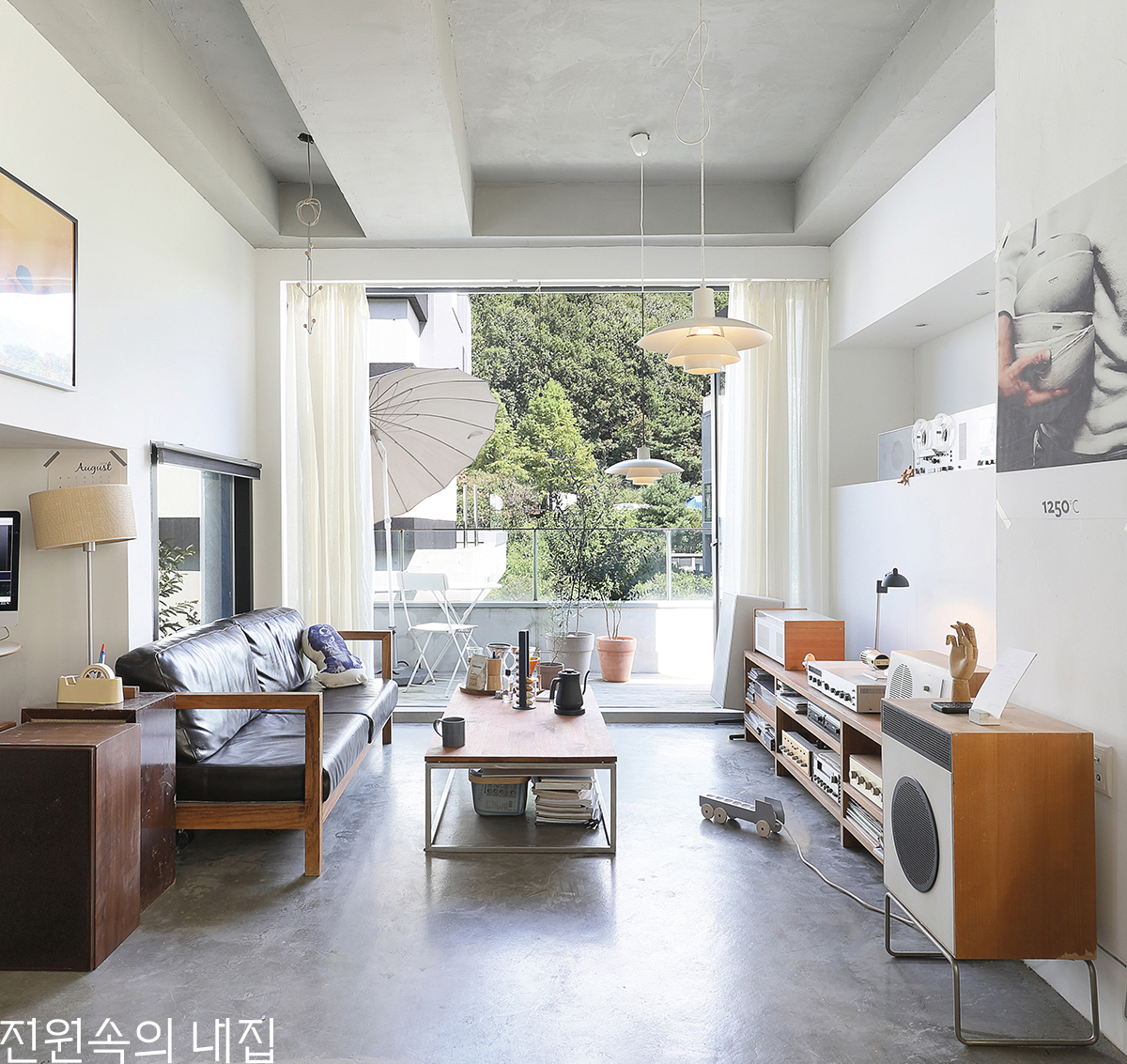 테라스 너머 풍경을 즐길 수 있는 작은 휴식 공간. 심진태 작가가 가장 좋아하고 자주 머무는 공간으로, 빈티지 오디오에선 늘 음악이 흘러나온다.
