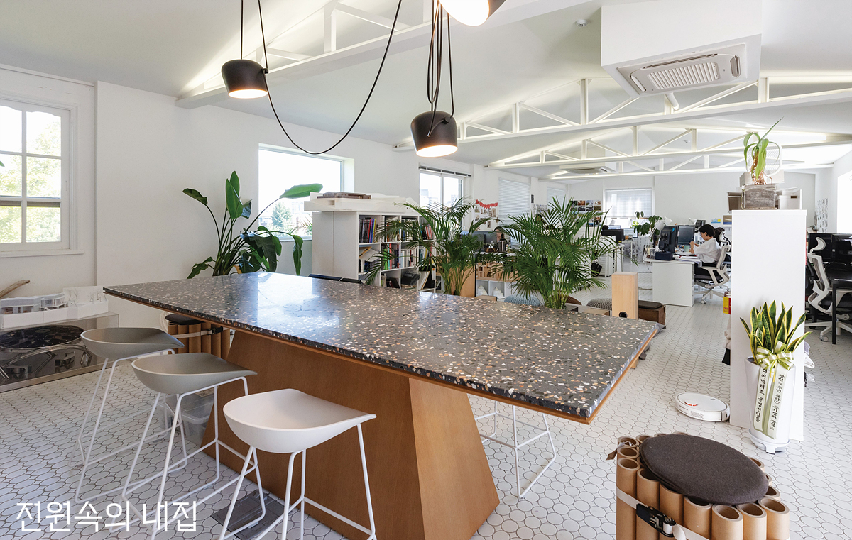 테라조 1판으로 상판을 마감한 테이블에서는 도면을 펼쳐 놓기도 하고 가끔 탁구대로도 쓴다.