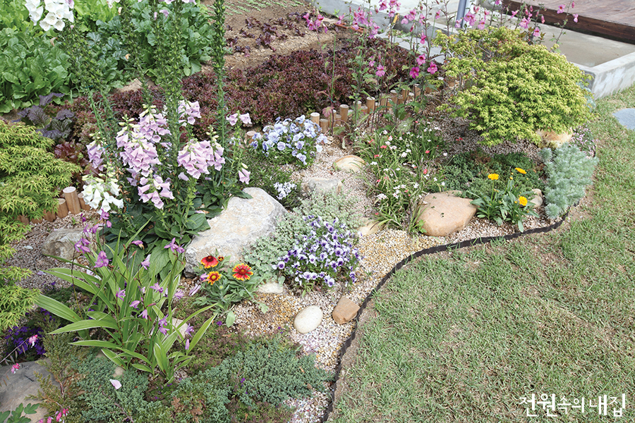 중앙의 잔디밭을 기준으로 대문과 벤치가 놓인 양 옆으로는 동선을 따라 디딤석을 길게 배치했다. 집 뒤쪽으로는 텃밭을 꾸려 하루에 두 번씩 물을 주는 게 정원주의 중요한 일과가 되었다. 계절마다 색색의 꽃을 피우기 위해 조경작업이 완료된 이후로도 5일장이나 인근의 화원을 꾸준히 방문하며 새로 심고 가꾸느라 그의 하루는 오늘도 분주하다.