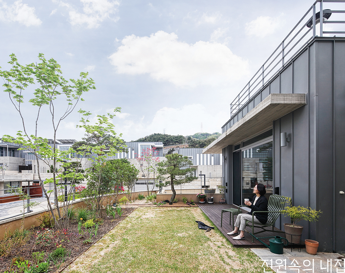 비슷한 타운하우스 정원들 속, 개성을 살리는 동시에 시원하게 트인 정원을 바라보며 차 한 잔의 여유를 가질 수 있는 공간이 탄생했다. 정원은 크게 세 파트로 구분되는데, 메인 정원은 소나무 한 그루와 일부 식물을 제외하고 기존의 나무들을 대부분 들어냈다. 대신 계절의 변화를 한껏 느낄 수 있는 관목과 그라스, 초화를 적절하게 심어 개방감을 느낄 수 있게 했다. 관목과 그라스류는 또한 관리하기 편리하다는 장점도 있다. 코너에는 산단풍을 놓아 메인 정원에 특별함을 더했다. 타운하우스 바깥 도로쪽에서 보이는 정원은 바위를 중심으로 음지식물을 적극적으로 활용해 메인 정원과는 또 다른 분위기를 연출했다. 현관문 위쪽, 광장을 향해 있는 정원은 가침박달과 진달래를 중심 라인으로 바위와 함께 단정하게 꾸몄다.
