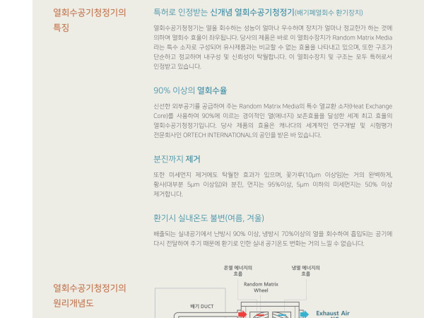열회수공기청정기의원리개념도실내 실외열회수공기청정기“당신과, 사랑하는 이들의 건강까지 생각합니다.”- 초미세먼지까지 잡아주는 열회수 공기청정기 SSK -환기시 실외온도 유입기능(봄, 가을) | 버튼 하나로 외부 온도를 실내로 유입시키는타제품에서는 찾을 수 없는 BY PASS 기능을 가지고 있습니다.냉, 난방 비용 절감 | 환기로 인한 에너지 손실이 거의 없기 때문에 일반 공조장치를 통해환기를 할 경우에 비해 에너지비용이 40% 이상 절감됩니다.양방향 환기방식으로 환기효과 | 일반 환풍기(FAN)의 경우 공기를 밖으로 내보내기만하는 단방향 환기방식이기 때문에 내부로 유입되는 공기는 문틈을 통해 들어올 수 밖에 없어환기에 소요되는 동력에 비해 환기효과는 저조할 수 밖에 없습니다. 열회수공기청정기는 배기구와흡기구가 구분되어 있는 양방향 강제환기 방식으로 환기효과가 우수합니다.공기청정기의 치명적인 단점을 보완 | 공기청정기는 실내의 공기를 재생하여 깨끗하게한다는 개념이나 실내의 CO2, 포름알데히드, 라돈 등의 유해물질을 제거하지 못할 뿐더러 신선한산소를 공급할 수도 없습니다. 열회수공기청정기는 담배연기, 먼지 등의 눈에 보이는 오염물질 뿐아니라 눈에 보이지 않는 유독가스를 제거해주고 외부의 신선한 공기를 충분히 공급해줍니다.오염된 외부공기를 여과하여 신선한 공기를 공급 | PRE-Filter 및 Random MatrixMedia 를 통과해 공기가 유입되는 이중 여과 시스템으로, 오염된 도심에서도 마음 놓고 환기할 수있습니다.