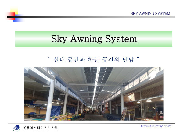 실내 공간과 하늘 공간의 만남SkY Awning System은 천장 개폐식 어닝으로 강력한 자외선 차단과 비바람을 막아주고 공간 활용을 높여 줍니다.• 강력한 자외선 차단효과 - 페라리(프) 시온, 히라오까 멤브레인 암막원단사용• 가이드 프로파일 고강도 알미늄바 사용• 직선 및 아치형 프로파일 작업가능(돔슬라이딩 특허적용 국산화로 원가 down)• 교회/성당 옥상, 매장&식당 , 휴게공간, 주택테라스 설치㈜동아스페이스시스템