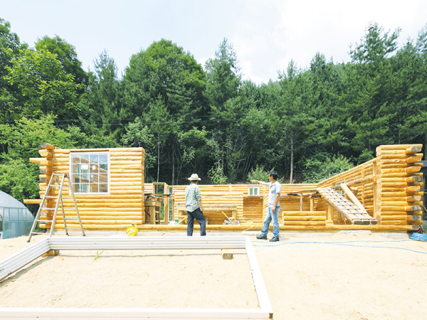 홀로 두 달 만에 통나무집을 뚝딱 지은 국중모 씨, 그리고 그 뒤를 이어 각각 다른 방식으로 통나무집을 짓고 있는 진상돈, 정우상 씨. 같은 통나무집이지만 저마다의 개성이 뚜렷하게 담긴, 건축 초보 세 남자의 좌충우돌 집짓기 이야기가 펼쳐진다.취재 조고은 사진 변종석 좁은 산길을 따라 한참 올라가니 우거진 나무들 사이로 아담한 통나무집이 한 채 보인다. 이 집에 모인 세 남자 에게 집 짓는 이야기를 들으러 간 참이다. 굽어보는 산세가 절경인 마당의 정자에 둘러앉았다. 두런두런 담소를 나누는 시간이 마치 신선놀음하는 기분이다. “저희 셋은 집 짓다 친해진 사이예요.” 세 사람의 관계에 대해 묻자 중모 씨가 먼저 입을 열었다. 가장 먼저 집을 지은 중모 씨가 자신의 경험을 바탕으로 이웃인 두 사람의 집짓기를 돕고, 상돈 씨와 우상 씨는 서로의 현장에 품앗이하며 도움을 주고 받는다. 그렇게 통나무집을 짓는다는 것 하나만으로 생면부지의 세 남자가 만나 친구가 됐다. 사실 세 남자는 건축과는 전혀 관계가 없던 사람들인데 말이다. 세 사람 집은 모두 멀지 않은 거리에 있다. 겉보기에는 세 채 모두 비슷한 통나무집인 것 같아도, 짓는 이를 닮아 그런지 자세히 보면 저마다 다르다. 집을 앉힌 자리만 봐도 그렇다. 꽤 깊은 산 중턱에 있는 중모 씨의 집과 달리, 우상 씨의 집은 큰 도로변에 외따로 떨어져 있다. 상돈 씨의 집은 뜻을 함께하는 20가구가 모인 집터에 자리 잡았다. 각자의 색깔이 뚜렷한 세 사람의 집이 점점 더 궁금해질 즈음, 중모 씨가 내어온 차를 마시며 본격적인 이야기가 시작됐다. ▲ 한창 벽체를 올리는 중인 우상 씨네 집 ◀ 주인공인 세 남자 ▶ 중모 씨가 만든 그네 너머로 보이는 통나무집 국중모 씨 _ “내 한 몸 누일 작은 통나무집이면 되지요” 중모 씨는 세 사람 중 가장 먼저 통나무집을 지었다. 인천에서 타이어 대리점, 오디오 전문점, 카센터 등을 하던 그는 하던 일을 정리하고 2012년 3월, 이곳 평창에 땅부터 덜컥 계약했다.“가족들은 모두 반대했는데, 오직 제 고집으로 주말주택 삼아 내려왔어요. 집안 어른들은 ‘네가 무슨 집을 짓느냐’며 걱정도 많이 하셨죠.” 그러나 한번 시작하면 끝을 보는 성격의 그는 같은 해 5월 집짓기에 착수해 단 두 달 만에 집을 지었다. 매일 새벽 5시에 일어나 6시부터 밤 9시까지 쉬지 않고 작업했다. “나는 하루에 4시간 일하자는 주의인데, 형님과 일하다 보면 좀 쉬자고 할 수밖에 없더라”는 상돈 씨의 증언이 이어진다. 기초 콘크리트 타설, 전기설비 등은 전문가에게 맡기고, 통나무의 껍질을 벗기고 그라인더로 표면을 손질할 때는 아들, 딸이 틈틈이 와서 도왔다. 12자(약 3.6m) 길이의 통나무를 혼자 들어 올리기 어려워 지인에게 도움을 청해 둘이서 벽체를 쌓고 지붕을 마무리했다. 그러기를 두 달, 12평의 아담한 통나무집 한 채가 뚝딱 만들어졌다. 그가 집 짓는 데 쓴 돈은 3천5백만원이다. “집이 작기도 작지만, 구조도 복잡할 게 없어서 더 쉽게 지을 수 있었던 것 같아요. 방 하나에 거실 겸 부엌, 다락이 전부거든요. 딱 필요한 공간만 있으니까 유지비도 적게 들고, 겨울엔 난방을 조금만 해도 금방 훈훈해져요.” 한데, 마당을 가꾸며 집 주변을 정리하고 3평짜리 찜질방을 완성하기까지는 1년도 더 걸렸다. 트럭도 없이 SUV 자가용만으로 작업하느라 벽돌 등의 자재를 조금씩 사다 나르고, 강가에서 대야 한가득 돌을 주워와 마당과 찜질방 외관을 장식했다. 힘은 들지만, 매일 아침 새소리를 듣고 평상에 앉아 음악을 즐기며 사는 삶이 이를 모두 잊게 한다. ◀ 평소 음악을 즐긴다는 중모 씨 ▶ 세 남자의 모임 현장. 중모 씨는 직접 만든 정자에 오디오와 스피커도 설치했다. ▲ 상돈 씨는 모든 나무를 직접 손으로 다듬는다. ◀ 조금씩 형태를 갖춰 가는 상돈 씨의 통나무집 ▶ 온돌방 바닥에 황토벽돌을 깔았다. 벽돌 사이로 난 길을 따라 온수관을 배열할 계획이다. 진상돈 씨 _ “저에겐 집짓기가 놀이예요” 이제 막 통나무집의 지붕을 올린 상돈 씨. 그 역시 카센터를 운영한 경력이 있고, 이곳으로 오기 전까지는 서울에서 재활용 목재로 가구를 제작하는 사회적 기업에 몸담았다. 그리고 약 1년 전, 20가구가 모여 산 땅에서 가장 먼저 집짓기를 시작했다. 단출한 중모 씨의 집과 달리, 이 집은 25평의 널찍한 면적에 2층이나 다름없는 다락이 있다. 시간이 걸리더라도 처음부터 끝까지 모든 과정을 내 손으로 하자 마음먹은 그는 기초공사를 위한 거푸집도 직접 짜고 철근도 손수 묶었다. 나무를 다듬어 벽체를 올리고 지붕을 얹는 것은 물론, 창틀 제작과 전기배선공사도 직접 했다. 마침 건설기계 면허가 있어 포클레인을 한 달 임대해 직접 운전하며 작업하기도 했다. 이로써 얻는 가장 큰 장점은 당연히 ‘건축비 절감’이지만, 그의 더 깊은 속내는 따로 있었다. “제 아버지나 할아버지 시절만 해도 동네 사람들이 모여 집을 지었지만, 지금은 기술자, 전문가가 맡아서 하죠. 그러다 보니 ‘전수’가 이루어지지 않는 문제가 있는 것 같아요. 내로라하는 장인들도 처음엔 다 시행착오를 거치잖아요. 집도 처음부터 완벽하게 