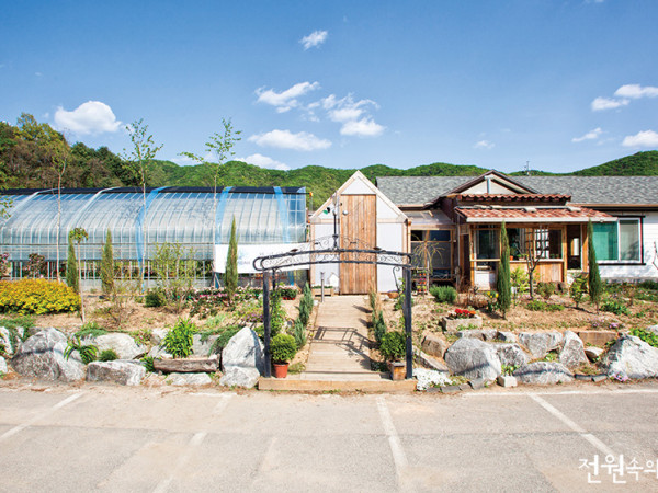 경기도 양평, 마음 맞는 이들과 함께 편안한 시간을 보낼 수 있는 작은 정원이 있다. 자연스레 어우러진 꽃과 사람, 시간의 향이 은은하게 풍기는 그곳으로 살며시 당신을 초대한다.취재 조고은 사진 전성근양평 문호리, 큰 길가에서 박공지붕에 하우스 정원이 있는 수상한 꽃집을 만났다. 꽃도 팔고 커피도 팔고 핸드메이드 소스도 팔지만 절대 ‘플라워카페’는 아니라는 이곳. 한마디로 콕 집어 정의할 수 없는 ‘THE VERANDAH(더 베란다)’는 진진, 연채임 씨 부부가 작년 3월부터 조금씩 손수 꾸려온 작은 정원이자 작업실, 사람들과 함께 생각과 마음을 나누는 모임 공간이다.“도시에서는 뭐하면서 노세요?”진진 씨가 대뜸 물었다. 이에 영화 보기, 쇼핑, 아니면 술자리… 몇 가지를 늘어놓다가 결국 말끝을 흐리고 만다. ‘온통 소비하며 얻는 즐거움뿐’이라는 그의 말이 맞았다. 온전히 내가 주체가 되어 만들어가는 삶. 아무래도 도시에서 그런 삶을 누리기에는 한계가 있었다. 광고 촬영감독인 남편 진진 씨와 영화연출, 디자인을 전공한 아내 채임 씨가 서울 한복판의 집을 정리하고 농촌 마을로 내려온 것 역시 그런 이유다. 채임 씨는 5년 전쯤, 6살 아들과 함께 남편의 독일 출장에 따라나섰더랬다. 마침 오빠네 가족이 독일에 살고 있었고, 이참에 여행이나 좀 해보자는 생각이었다. 그곳에서 만난 삶의 풍경들은 서울의 것과는 달랐다. 자연 속의 조용한 동네, 대지 위 자유롭게 뛰노는 아이들. 두 달이면 그리 긴 시간도 아닌데, 서울 토박이인 그녀가 낯선 여행지에서 보고 들은 것들은 삶을 완전히 바꾸어 놓았다. 한국에 돌아와 둘째를 가진 것을 알게 됐고, 도시의 소음과 번잡함이 견딜 수 없게 느껴졌다. 아이들을 이런 곳에서 키울 수는 없겠다는 생각도 들었다. 결국 그녀는 남편에게 선언했다. ‘나 도저히 서울에선 못 살겠어.’ ▲ 꽃에 물을 주는 채임 씨 모습. 하우스 정원에는 식물의 씨방을 본뜬 모양으로 직접 벽돌을 깔았다.▲ 살림집 건물은 작업실로 쓰고, 그 앞에 차 한잔 할 수 있는 공간을 마련했다.시골에서 나고 자란 진진 씨는 사실 오래전부터 양평을 점찍어 두었었다. 서울을 오가며 일하기에도 멀지 않고, 자연 속에서 아이들을 키울 수 있는 몇 안 되는 곳 중 하나였다. 그렇게 만삭의 아내, 아들을 데리고 문호리로 내려왔다. 처음 몇 개월은 큰 양옥집에 딸린 방 두 칸짜리 별채에 세를 들어 살았다. 그러다 그곳도 복잡하다 싶어 차로 15분 정도 더 들어간 정대리에 있는 아담한 시골집으로 이사했다. 더 베란다는 서울에서 디자인 작업실을 본격적으로 꾸려보려던 차에 이곳으로 오게 된 아내의 공간으로 마련한 곳이다.“소박한 삶의 기본 원칙 가운데 하나는 ‘불필요한 것들’을 소비하기 위해 ‘돈’을 버는 대신, ‘꼭 필요한 것들’을 구하기 위해 ‘일’을 하는 것이다”- 윌리엄 코퍼스웨이트 <핸드메이드 라이프> 중에서남편은 아내를 ‘시골 완벽 적응자’라 부른다. 작은 화분 하나도 집에 들여 본 적 없던 그녀가 이제는 직접 땅을 일구고 각종 채소, 꽃을 심고 가꾸는 건 물론이요, 장아찌도 담그고 소스도 만든다. 이곳에서 꽃이 지고 열매가 맺히는 광경을 태어나 처음 봤을 때, 신기하다며 한참 호들갑을 떨었던 건 그야말로 옛일이다.“처음에 여기 왔을 땐, 아들이랑 둘이 할 게 없잖아요. 서울에 있었으면 분명 백화점 문화센터를 다녔을 거야(웃음). 심심하니까 이웃집 할머니들이 주는 나물로 장아찌를 담그기 시작했고, 그러다 텃밭도 가꾸게 되고… 그렇게 할 수 있는 일이 점점 늘어났죠.”소비자에서 생산자가 된다는 건 참 놀라운 일이었다. 더 베란다는 그런 놀라움과 기쁨을 소박하게 담아낸 작은 공간이다. 채임 씨는 작업실을 구하다 살림집이 딸린 이 오래된 화원을 발견했고, 1년이 넘도록 손수 집을 고치고 흙을 보살피며 정원을 가꿔왔다. 목공은 남편이, 정원은 아내가 맡았다. 다른 곳에 쓰였던 나무를 재활용해 하나하나 다듬어 썼고, 하우스와 살림집 건물 사이에 박공지붕의 테이블 공간도 꾸몄다. 분재를 주로 팔던 하우스 정원의 땅이 꽃을 키울만한 토질은 아니었던 터라, 식물을 심고 키우는 것이 처음인 그녀는 좌충우돌할 수밖에 없었다. 지난겨울엔 수국 등을 옮겨 심었더니 대부분 말라 죽고 난방비만 엄청 나와 한동안 손을 뗐다고 했다. 대신 그동안 허브를 말려 차를 만들고, 직접 만든 소스를 들고 양평 문호리리버마켓에 참가했다. 봄을 기다리며 꽃과 허브들의 씨를 받아 두는 것도 잊지 않았다.◀ 테이블 공간은 조금 서툴더라도 내 마음대로 만들고자 했던 남편의 손맛이 묻어난다. ▶ 따뜻한 사람들과 함께하는 시간을 위해 소박한 만찬을 준비 중이다.◀ 유기농 재료로 만든 바질 페스토, 발사믹 소스, 타르타르 소스를 곁들인 요리들 ▶ 큰아들이 나무를 깎아 만든 새총. 문호리리버마켓에서 엄마와 함께 팔기도 한다.“그래도 기특하게, 봄이 되니까 살아나는 아이들이 있더라고요.”더 베란다는 매일 조금씩 풍성해지고 있다. 유기농 비료를 아낌없이 쓰며 쏟은 정성 덕분인지 땅도 점점 비옥해져 간다. 기름진 땅이 아니면 잘 자라지 않는