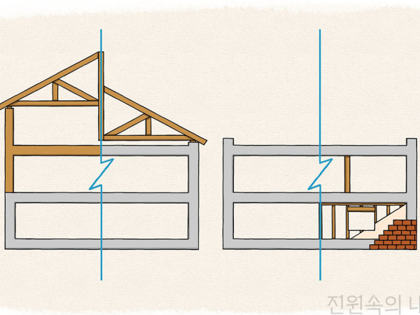 최근 오래된 주택가의 단독주택을 리모델링해 사는 사람들이 늘고 있다. 치솟는 전세금과 큰 차이 없는 예산으로 도심 속에서도 작은 마당의 여유를 누릴 수 있고 층간소음 걱정 없이 살 수 있다는 것이 노후주택 리모델링의 가장 큰 매력. 하지만 꿈에 부풀어 무턱대고 주택을 샀다가 오히려 신축보다 돈이 더 들어 배보다 배꼽이 큰 경우도 적지 않다. 주거용 리모델링을 염두에 두고 있다면, 구옥을 매입할 때 꼭 확인해야 할 것이 무엇인지 짚어본다. 단독주택은 건물 가격이 거의 포함되지 않은 집, 즉 보통 20년 이상 된 주택을 구매하는 게 유리하다. 그래야 저렴하게 매입할 수 있고, 훗날 재테크를 위해 이익을 남기고 팔기에도 유리하다. 이 외에도 노후주택을 매입하기 전 몇 가지 유념해야 할 사항들이 있다. - 인접도로 최소 3m 이상 도로와 인접해 있어야 추후 증축, 개축이 쉽다. 물론 더 넓은 폭의 도로와 가까이 있을수록 좋다. 하지만 도로변보다는 골목 안에 있는 집이 더 저렴하고 주거의 안정감도 있다는 사실도 기억하자. - 대지면적 가급적 넓은 평수를 노려라. 대지가 165㎡(약 50평) 이상이면 나중에 빌라, 원룸 등으로 개발할 수 있기 때문이다. 물론 평생 살 집을 생각한다면 예산에 맞추어 주택 크기를 결정해야 한다. - 불법 건축물 만약 주택에 무단으로 증축, 개축된 불법 건축물이 있다면 추후 관공서로부터 철거 대상으로 간주해 강제 이행금이 부과될 수도 있다. 건축물대장을 열람해 등재 여부를 꼭 확인하자. - 마당 단독주택의 핵심은 바로 ‘마당’. 이 때문에 단독주택을 선택한다고 해도 과언이 아닐 정도다. 필자 또한 단독주택을 고를 때 마당의 크기를 가장 중요한 가치로 둔다. - 주차장 주차 공간이 있는 집은 대체로 가격대가 높다. 하지만 최근 담장을 없애고 주차 공간으로 활용하는 사례가 늘고 있고, 구청에서 지원금을 주는 곳도 많으니 꼭 확인하자. - 도시가스 만약 도시가스를 설치할 수 없는데 아주 좋은 집이 나타났다면, 단열공사에 크게 신경 써야 한다. 그래야 여름과 겨울에 냉·난방비를 줄일 수 있다. - 정화조 종말처리장을 가진 하수가 있는 구역 외에서는 오수를 정화조로 정화 처리한 후 하수도에 방류한다. 종말처리장으로 바로 가는 직관이 있다면 좋겠지만, 개인이 바꿀 수 있는 사항은 아니다. - 수압 수도꼭지를 틀어서 수압을 확인하자. 대체로 수압은 물탱크 방식보다는 직수가 좋다. 어떤 방식이든 수압이 약하다면 가압펌프라도 사용해야 한다. - 난방 바닥 난방과 보일러 상태를 확인한다. 바닥 난방파이프의 연수는 보일러 분배기에 연결된 파이프 상태를 보면 쉽게 확인할 수 있다. 만약 구조변경을 포함한 공사를 해야 한다면, 어차피 난방 공사는 필수이기 때문에 굳이 확인하지 않아도 된다. 신축보다 오히려 비용이 더 들면 어떡하죠? 리모델링은 건축물의 노후화 억제 또는 기능 향상 등을 위하여 대수선 또는 일부를 증축하는 행위를 말한다. 하지만 일반적으로 알고 있는 리모델링의 의미는 기존 골조를 최대한 살리고 나머지 부분들의 공사를 모두 진행하는 것이다. 결국, 리모델링과 신축의 결정적 차이는 ‘기초공사와 골조공사를 하는가, 하지 않는가’에서 온다. 그렇다면 어떤 집이 신축보다 리모델링 비용이 더 들겠는가? 당연히 골조 부분에 대한 보수를 많이 해야 하는 집이다. 골조보수공사에 엄청난 비용이 드는 집이라면 차라리 신축하는 것이 나을 수 있다. 따라서 리모델링을 위한 노후주택을 매입할 때는 흔히 내력벽, 기둥, 바닥, 보, 지붕틀, 주 계단 등을 일컫는 ‘주요 구조부’를 중심으로 살펴야 한다. - 준공연도 준공연도는 건축물대장에 표시되어 있다. 대체로 준공연도가 너무 오래된 건물은 가치가 없다. 하지만 주택의 구조와 지붕 상태에 따라 그 사용가치는 달라질 수 있다. - 구조 구조변경이 쉬운 가변형 주택으로 만들려면 기존의 벽이 하중을 받는 벽식구조(벽 자체가 기둥과 보의 기능을 하는 구조. 벽체가 위에서 내려오는 하중(힘)을 받는 내력벽이기 때문에 함부로 허물면 안 된다.)보다는 라멘구조(세로로 서 있는 기둥과 가로로 걸쳐 있는 보로 이루어진다. 벽체가 단순한 칸막이 역할을 하는 비(非)내력벽이라 내부구조 변경이 비교적 자유롭다.)로 지어진 집이 좋다. 하지만 이미 지어진 주택의 구조를 바꿀 수는 없을뿐더러, 불행히도 오래된 단독주택은 대부분 벽식구조로 되어 있다. - 골조 재료 단독주택은 철근콘크리트, 시멘트벽돌, 시멘트블록, 경량목재, 경량스틸, ALC 등의 재료를 사용한다. 철근콘트리트와 시멘트벽돌로 만든 주택은 내구연한이 비교적 긴 편이다. 다른 재료는 부분철거 후 강도측정을 해 봐야 한다. 특별히 시멘트블록조는 이미 벽체가 약해진 경우가 많고, 목조는 구조 목재가 해충 등의 영향으로 약해진 경우도 많다. 기존 구조 전체를 보강해야 하는 상황이라면 차라리 신축이나 개축을 하는 것이 현명할 수 있다. - 균열 외벽의 균열을 확인한다. 특히 가로로 생긴 균열은 건물 전체를 무너트릴 수도 있기 때문에 조심해야 한다. - 지붕 평지붕은 우레탄방수 처리로 누수를 거의 잡아낼 수 있다. 