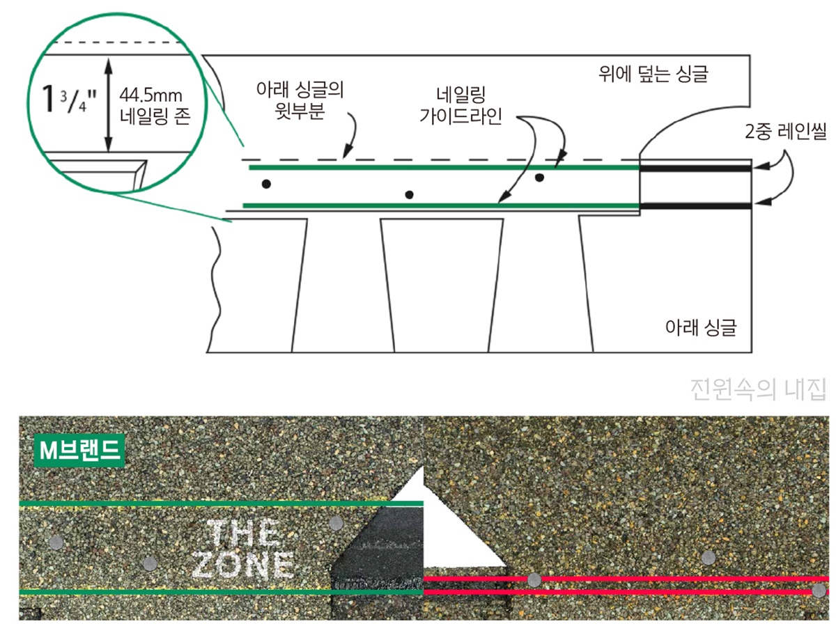 아스팔트싱글은 못만 있으면 공사가 가능할 정도로 시공이 까다롭지 않습니다. 브랜드와 모델별로 정도의 차이는 있지만, 대부분 자착식으로 태양 복사열만으로도 잘 붙습니다. 다만, 시공 부위가 지붕이기 때문에 누수에 만전을 기해야 합니다. 누수 하자는 복잡하고 어려운 시공 과정에서 실수로 인해 생기기보다는, 가장 간단해 보이는 못박기 과정 같은 작은 오류에서 시작될 수 있습니다. 처음부터 물이 콸콸 흘러나오는 것이 아니라 아주 조금씩, 그리고 꾸준히 누수가 발생하면서 곰팡이나 부식을 일으키고 결국 지붕 단열재가 물에 젖어 단열이 깨지는 문제가 생기게 됩니다. 어느 부분이든 어떤 정도이든, 목조주택에 누수는 치명적일 수 있습니다. 그렇다면 아스팔트싱글에 못을 박는 공정에서 왜 누수가 생기는 걸까요? [그림 1]을 보면서 설명 드리겠습니다. 아스팔트싱글에 못을 박을 때는 ‘네일 라인(Nail line)’ 혹은 ‘네일링 존(Nailingzone)’이 매우 중요합니다.