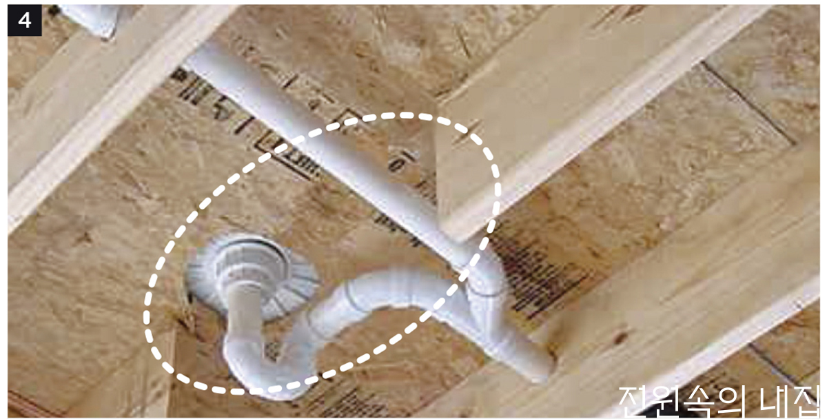 - 화장실과 같은 설비 배관이 있는 곳에서는 배관의 위치를 고려하여 바닥 장선을 설치해야 한다. 배관과 바닥 장선에 간섭이 생겨 장선이 절단되는 경우도 종종 발생하는 잘못된 사례다(사진 4).