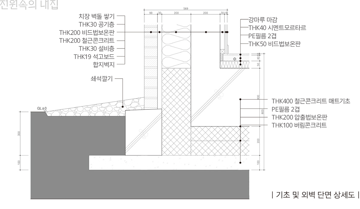 기초 하부와 측면은 수분에 강한 압출법보온판을 사용하는데, 압출법보온판은 수분에 대한 저항력은 좋지만 미장 마감 시 접착력이 문제가 될 수 있기 때문에 전용 미장재를 써야 하며 상부 외벽에서 흐르는 우수 처리 디테일을 적용해야 한다.