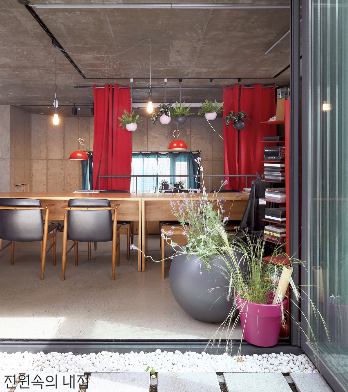 단차가 있고 천장이 높은 사무실 공간은 진한 레드 커튼이 파티션 기능을 하며 포인트가 되어준다. 진한 그레이와 빈티지 핑크의 원형 행잉 바스켓은 수태와 바크만 넣어 무게감을 줄이고, 잎의 색과 선이 아름다운 식물을 심는다.