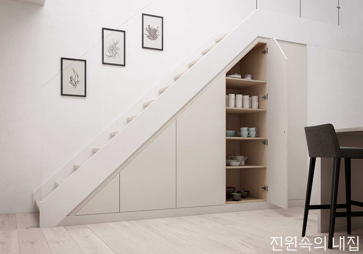 ▶ 계단실 옆 오픈된 주방을 배치했다면 계단 아래 데드스페이스를 적극 활용하자. ‘Under-stair Storage System’은 공간을 효율적으로 활용하고 부족한 수납을 확보할 수 있도록 도와준다. 기성 주방가구가 아니더라도, 벽장을 짜 넣고 주방가구와 동일한 마감재의 도어를 제작해 다는 것도 방법이다. Daval ‘Finsbury’