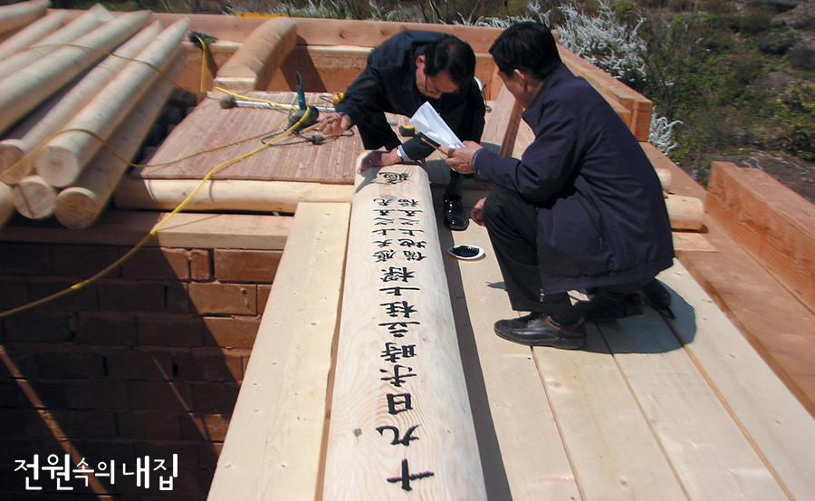 한옥, 흙집뿐만 아니라 요즘 많이 짓는 경량목조주택을 지을 때도 집의 뼈대가 어느 정도 갖추어지면 상량식(上樑式)을 치르는 모습을 볼 수 있는데요. 여기서 ‘상량(上樑)’은 기둥과 대들보가 다 설치된 다음에 최상부 부재인 마룻도리(종도리)를 올리는 것을 말합니다. 상량식은 집짓기에서 하나의 큰 고비를 넘기며 지금까지의 노고를 축하·격려하고 새로운 과정을 시작하는 다짐의 자리이지요. 오전에 건축주 가족과 건축에 참여한 목수들이 모여 상량식을 치르고 나면, 오후에는 대개 공사를 쉬고 이웃들에게 술과 음식을 대접합니다.