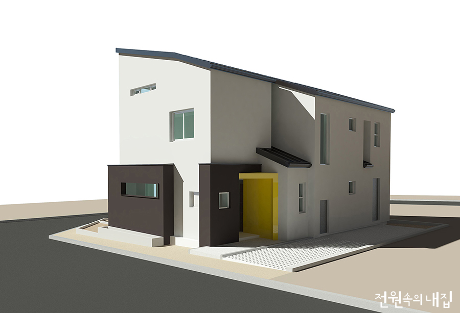 가족의 편의성을 배려해 주차를 하고 현관으로 직접 진입할 수 있는 위치에 출입로를 계획했다. 건축물의 얼굴이라 할 수 있는 현관은 방범과 안전의 측면에서 도로에서 보았을 때 문이 보이지 않도록 했으며, 현관임을 암시하는 노란색 강판으로 마감했다.