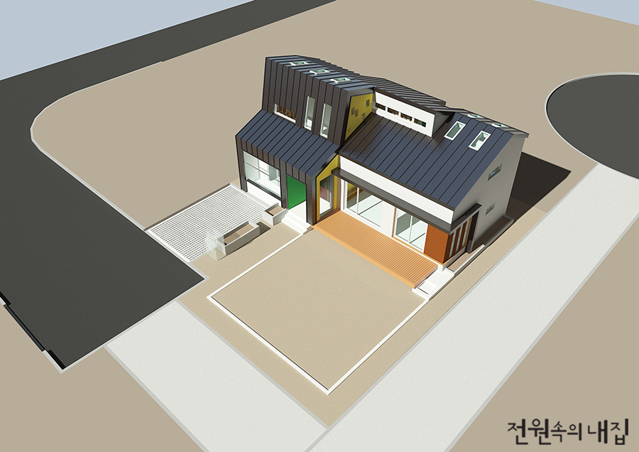 흰색 바탕에 돌출된 벽 부분만 노란색 스터코로 마감하였다. 현관과 요철부분의 일부는 녹색 스터코로 칠해 입체감을 더하였고, 지붕은 디자인 형태를 가장 돋보이게 표현해 줄 수 있는 재료인 컬러강판을 선택해 모던한 느낌을 살렸다.