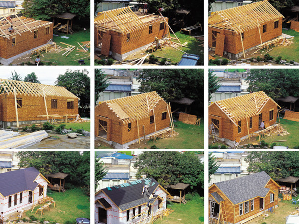 목조주택의 시공은 일반적으로 골조는 아래에서 위로, 마감은 위에서 아래로 진행된다. 이에 근거하여 전체 공정을 6단계로 간략하게 정리하였는데, 되도록 목조주택의 전형적인 공정과 일치하도록 구성하였다. 아울러 소개되는 시공과정은 반드시 목조주택의 원칙시공이라 할 수 없음을 앞서 밝혀둔다. 목조주택의 공정별 시공은 주택의 규모와 환경, 구조의 복잡성, 사용 자재의 종류, 시공자 등 여러 가지 변수에 따라 달라질 수 있기 때문이다. 이를 감안해 목조주택 공법의 주요 공정에 근거하여, 일반적인 시공법을 설명하는데 중점을 두었다. 취재 편집부 사진 임병기 PROCESS 3. 지붕 골조공사- 지붕 골조공사는 크게 천장 장선(Cellingjoist)과 서까래(Rafter), 용마루(Ridgevent) 부분으로 나누어 진행된다. 시공은 세워진 벽체 위에 장선을 시공하고, 그 위에 용마루를 세운 뒤 서까래를 시공하는 순서로 이루어진다. - 각 샛기둥은 시공될 합판이나 석고보드 등의 정해진 모듈에 맞춰 간격을 두고 시공한다. 샛기둥의 하단부에는 밑깔도리(Bottom plate)를 상단부에는 위깔도리(Top plate) 및 이중깔도리(Double plate)를 설치하고 문이나 창호 등의 개구부 윗부분은 상부의 하중을 지지하기에 충분한 폭의 끝막이보(Header)를 설치한다. - 벽체를 시공할 때 주의할 점은 벽체의 직각 상등의 벽덮개(Wallsheating)를 먼저 시공한 뒤 세우고, 세워진 벽체를 수직계(Level)로 수직을 맞춘 후 가새(Temporary bracing)로 임시 고정해야 한다는 점이다. - 지붕구조에서 지붕은 일반적으로 트러스(Truss)나 서까래를 사용하는데, 트러스는 공장에서 제작된 것을 사용하고 현장에서 제작할 경우 구조적 성능 및 접합방법에 관한 충분한 검토가 요구된다. 서까래로 지붕을 구성하는 경우 서까래의 구조적인 배치 방법과 환기방식 등을 신중히 고려해야 한다. 여러 형태의 지붕 가운데 현장에서 시공하기에 가장 간단한 것은 박공지붕이다. 모든 서까래를 패턴에 맞게 같은 길이로 절단하면 되므로 간소한 지붕 골조라 할 수 있는데. 박공지붕의 변형체 중에는 채광, 천장 높이기, 환기가 목적인 지붕창(Dormers)이 있다. 그러나 열 수 있는 창문과 열 수 없는 천창(Skylight)을 서까래 사이의 경사면에 부착하면 구조가 복잡하고 비용이 많이 드는 지붕창을 하지 않아도 채광과 환기를 할 수 있다. 다락방 혹은 경사천장을 구성하는 경우에는 각별한 주의가 요구된다. PROCESS 4. 외부마감 & 지붕공사- 골조가 완성되면 외부 벽 덮개에 방습을 위한 방습지(Building paper)를 붙인 후 창문과 출입문을 설치한다. 창문은 못이나 스크류를 사용하여 고정하고 나무 쐐기(Shim)를 사용하여 틀어짐을 막는다. 창문 주위의 누수 방지를 위한 후레싱(Flashing)과 실런트를 철저히 시공하여야 하고 벽과 창틀 사이의 공간은 단열재로 밀실하게 채워 열손실을 막아 주어야 한다. - 외벽마감재로는 사이딩(Siding),스터코(Stucco), 벽돌 등이 널리 사용된다. 사이딩으로는목재, 비닐재 및 성형제품 등이 많이 쓰이는데, 목재 사이딩은 오일스테인계의 도료를 칠하여 내구성을 높일 수 있다. - 지붕공사는 경사각에 따라 난이도 차이가 생기는데, 경사각이 30도 이상이면 작업용 발판을 별도로 설치하여야 한다. 지붕재로는 아스팔트 슁글이 널리 사용되는데, 다양한 패턴과 가볍고 저렴한 것이 특징이다. 또한 일정 수명 후, 그 위에 덧붙여 쉽게 재시공을 할 수 있는 이점도 있다. 그 이외의 재료로는 우드 슁글 등이 있다. - 지붕마감에서 주의할 부위는 우선 천장,굴뚝, 배기파이프 등 지붕을 관통하는 주위의 누수를 방지하기 위한 후레싱 시공이다. - 다음 지붕 속 자연 환기를 위해 처마 및 용마루의 환기구를 정확하게 시공해야 한다. 마지막으로 지붕에 떨어지는 빗물은 물받이 홈통(Gutter& Lead)을 설치하여 정해진 곳으로 흐르도록 처리해야 한다. 지붕 및 공간에 대한 결로 방지 지붕과 천장사이에는 지붕의 경사로 인한 공간이 생기고 경사천장으로 처리하는 경우에도 지붕 서까래의 두께로 인해 공간이 생긴다. 문제는 이 공간에 습기가 유입되고 지붕 위의 찬공기와 접촉하게 되면 지붕 구조 내에서 결로가 발생할 수 있다는 점이다. 그로 인해 목재의 함수율을 증가시키고 시간이 경과하면서 목재 구조부재 또는 구조용 판재가 썩는 결함이 발생할 수 있다. 이러한 습기 차단을 위해서는 실내 쪽에 방습지를 설치하고 천장에 생길 수 있는 구멍을 철저히 차단해야 한다. 그런데 구멍 주변에 대한 방습처리 역시 완벽하게 하더라도 외부로부터 들어오는 습기까지 완전히 차단할 수는 없다. 그래서 지붕 및 공간에 대한 결로 방지는 습기의 차단보다는 따뜻한 공기와 차가운 공기의 접촉을 방지하는 방법이 주로 사용된다. 일단 단열재로 서까래 사이 또는 천장 장선 사이의 공간을 철저히 채워 실내의 따뜻한 공기가 유입되지 않도록 유의해야 한다. 또한 지붕단열재는 냉난방 효율의 증대를 위하여 꼭 필요한 부분이므로 단열효과가 높은 R-30 이상의 재료가 사용되어야 한다. 처마환기구와 지붕마루까지 원활히 유통될 수 있도록 처리해야 찬 공기와 따뜻한 공기의 접촉으로 인한 결로를 방지할 수 있는 