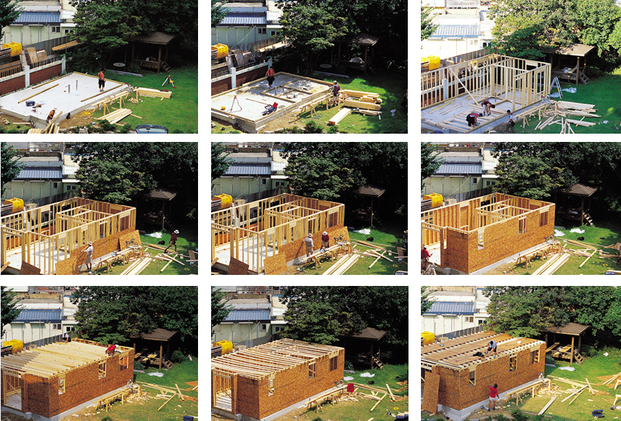 목조주택의 시공은 일반적으로 골조는 아래에서 위로, 마감은 위에서 아래로 진행된다. 이에 근거하여 전체 공정을 6단계로 간략하게 정리하였는데, 되도록 목조주택의 전형적인 공정과 일치하도록 구성하였다. 아울러 소개되는 시공과정은 반드시 목조주택의 원칙시공이라 할 수 없음을 앞서 밝혀둔다. 목조주택의 공정별 시공은 주택의 규모와 환경, 구조의 복잡성, 사용 자재의 종류, 시공자 등 여러 가지 변수에 따라 달라질 수 있기 때문이다. 이를 감안해 목조주택 공법의 주요 공정에 근거하여, 일반적인 시공법을 설명하는데 중점을 두었다.