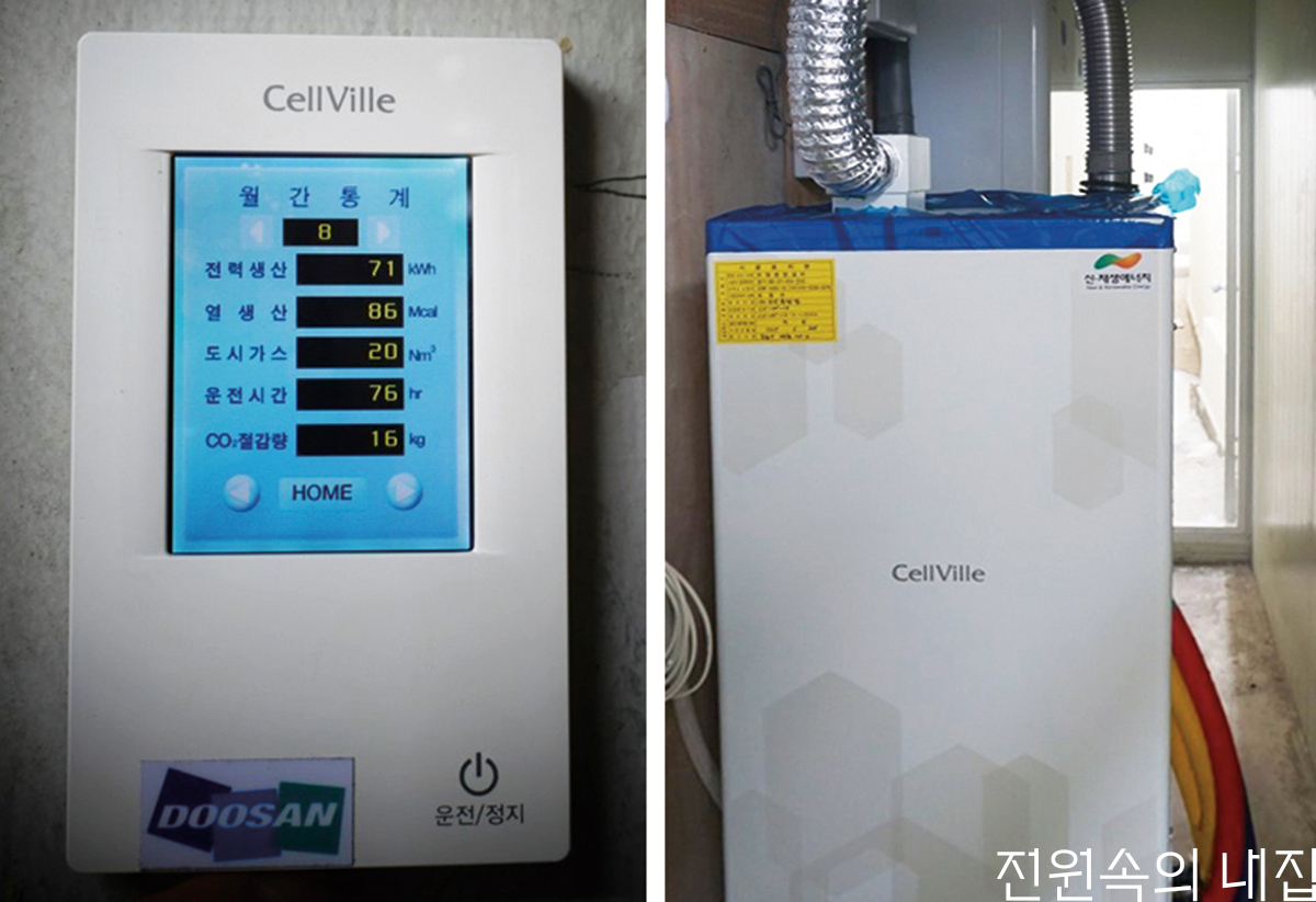 연료전지는 수소와 산소의 화학에너지를 전기 화학 반응에 의해 직접 전기에너지로 변환시켜 발전하는 방식이다. 주택용 연료전지 설비는 수소원으로 도시가스를, 산소원으로 공기 중의 산소를 사용한다. 연료가 공급되는 한 재충전 없이 계속해서 전기를 생산할 수 있고 전기와 열에너지를 동시에 얻을 수 있다는 장점이 있다. 도시가스 성분 내에서 수소를 발생시키는 개질기, 수소와 산소의 화학 반응이 일어나는 연료전지 스택 등으로 구성된다. 연료전지의 경우 약 2m2의 설치면적이 필요하다.