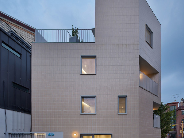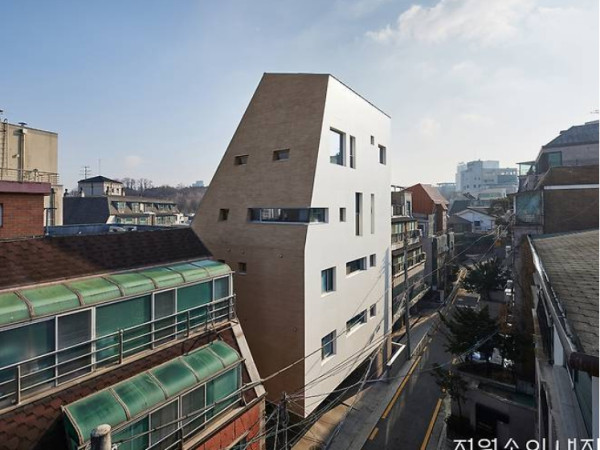 세라믹 패널, 콘크리트 벽돌 등 연갈색 톤 벽돌이 흰색 박판 세라믹 파사드와 보색을 이루면서 전면을 더욱 강조하는 역할을 한다.주차장과 사무공간이 자리한 1층. 필로티 기둥과 곡면의 벽면이 1층을 단조롭지 않게 만든다.마을에 녹아드는 디자인과, 대지의 한계를 극복하는 입체적인 공간 활용서리풀공원 근처 언덕. 이 집 자리에는 의뢰인의 가족들이 살던 오래된 2층 단독주택이 있었다. 가족의 보금자리는 부모의 자녀가 다시 부모가 되는 오랜 시간 동안 낡고 좁아졌다. 이제는 더 많아진 가족이 함께할 수 있는 새집이 필요했다.서래마을의 주요 거리와는 달리 이면도로의 주택가는 좁은 생활도로 사이로 공동주택들이 마주하는 전형적인 밀집 주택가의 모습이다. 그런가 하면 언덕 높이마다 켜켜이 뻗은 각 골목길 마다 각자 개성 있는 건물들과 집마다 가꿔 놓은 수목들이 어우러지며 동시에 차량이 붐비지 않는 한적함을 느낄 수 있는 동네이기도 하다. 이 동네에서 가족들과 계속 살아가길 원하는 의뢰인은 익숙한 동네 거리의 풍경에 신선함을 줄 수 있는 그런 새집을 짓고자 했다.SECTIONHOUSE PLAN대지위치: 서울특별시 서초구대지면적: 250.0㎡(75.62평)건물규모: 지하 1층, 지상 5층세대구성: 4세대 + 근린생활시설건축면적: 139.80㎡(42.28평)연면적: 451.37㎡(136.53평)건폐율: 55.48%용적률: 137.78%주차대수: 6대최고높이: 20.45m구조: 철근콘크리트단열재: 준불연 경질우레탄폼보드 110㎜(벽), 130㎜(지붕)외부마감재: 외벽 – 로코파트너스 박판 세라믹 패널, 두라스택 콘크리트 벽돌 / 지붕 –컬러강판담장재: 두라스택 콘크리트 벽돌창호재: 위드지스 알루미늄 창호/ 현대알루미늄 방화창호열회수환기장치: 잡자재 컴포벤트에너지원: 도시가스외부 바닥재: 두라스택 콘크리트 벽돌전기·기계·설비 설계: ㈜세원엔지니어링구조설계(내진): 바른구조엔지니어링㈜시공: 쓰리스퀘어설계: 스페이스프라임 건축사사무소 옥윤종, 오민주‘하얀얼굴집’의 디자인 콘셉트는 디자인을 위한 불필요한 건축장식 요소를 배제하고 매스 본연의 스케일감과 형태적 특성이 가지는 가능성을 기반으로 했다. 여기에 재료의 색상과 질감의 분리만으로 개성 있는 아이덴티티를 충분히 이루어 내는 것을 목표로 했다. 좁은 도로임에도 일조가 양호한 남측의 전면 창호들은 프라이버시 확보가 불가능한 아파트식 통창보다는 각 실의 용도별로 내외부 간의 적정한 개방성과 일조량 그리고 인접 건물 창의 위치를 고려하여 크기와 형태 그리고 위치를 정했다.도심 속 흰색은 재료와 관계없이 재도색과 재시공 등 지속적인 유지비가 필요하고 시간이 지나면서 결국 방치되는 경우도 많다. 그래서 초기 비용이 높아도 내후성이 좋고 세정도 가능한 박판 세라믹 패널을 전면에, 전면을 제외한 모든 면은 동네의 주요 재료인 벽돌을 적용했다. 더불어 전면은 비정형의 바운더리와 다양한 형태의 창문으로 무거운 매스감을 가볍게 바꿔주었다.주인세대인 5층의 식당과 주방. 화이트 바탕에 우드톤으로 내추럴한 분위기를 연출했다.일조사선제한으로 인한 경사가 엿보이는 4층 침실.4층과 5층의 복층형태인 주인세대의 5층 모습. 5층은 향후 가족 구성원의 변화와 침실 및 가족실 등의 확장을 염두에 두고 건식 방음벽체로 계획했다.PLAN이 집은 지상 5개 층과 지하층으로 구성되었다. 대지는 높은 언덕의 경사지로 후면의 일조사선제한을 많이 받아 법정 연면적을 모두 활용하기 어려웠다. 이 때문에 가족의 공간 수요와 비교했을 때 여유 있는 공간구성이 다소 제한적이었지만, 도시형 생활주택 구성으로 1개 층을 더하고, 지하층, 복층, 다락 등을 활용하여 층별, 용도별, 세대별 공간 가용성을 극대화해 대응했다. 지하층과 1층은 의뢰인 사무실로, 2층은 두 세대의 투룸형 주거, 3층은 한세대 주거, 4층과 5층은 복층형 한 세대 주거로 구성된다. 일조사선제한으로 4, 5층을 합쳐 복층으로 약 28평의 볼륨을 가지게 되는 주거공간은 다락과 함께 4개의 침실로 구성했다.개별실 면적은 제한적이지만 식당과 가족실 등의 공용공간은 높은 층고로 여유 있는 공간감을 가진다.복층 형태의 주거공간에서는 입체적인 동선의 고려가 중요했다.아이방으로 꾸며준 4개의 침실 중 하나.INTERIOR SOURCE내부마감재: 벽 – 벤자민무어 친환경페인트 / 바닥 –지복득 마루 / 천장 – 벤자민무어 친환경페인트욕실·주방 타일: 포세린 타일(욕실), 세라믹 상판(주방)수전 등 욕실기기: 아메리칸스탠다드 + 더죤테크주방 가구: 주문제작 조명 : 폴라베어 다운라이트 외계단재·난간: 오크집성목 + 철제난간현관문: 예림도어 중문 : 위드지스 ALU-SD방문: 예림도어 히든도어붙박이장: 주문제작 데크재 : 페데스탈 코리아주거자의 실제 만족을 위해, 유한한 건축 자본을 효과적으로 활용하기 위해, 건축가 스스로 자부심을 가질 수 있는 결과를 이루기 위해 매번 여러 주제에 대해 준비하고 답을 만들어 내지만 그 노력을 건축가 혼자만 하고 있다면 좋은 결과는 나올 수 없다. 하얀얼굴집은 가족 구성원들의 관심과 참여가 충분히 뒷받침되어 주어진 상황 속에서 모두가 만족하는 결과가 나오게