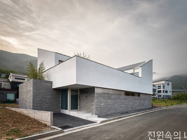 하나둘 집들이 반듯하게 채워져 나가는 새로운 도시의 마을.그곳에 도시만큼 단정한 선으로 중정을 품은 한 주택이 지어졌다.넉넉한 채광과 시각적 개방감으로 일상과 풍경이 다채로운 집이다.전면과 측면, 가로와 세로의 긴 틈새를 통해 집 안에서의 빛이 스며들듯 새어나온다.김해 율하 신도시에 자리한 부지는 서쪽으로는 대단위 아파트 단지가 조성되어 있고, 동쪽으로는 택지와 연결된 국도 너머로 산자락이 병풍처럼 펼쳐진다. 집과 빈 부지가 서로 뒤섞이며 주거 인프라가 모양을 갖추는 모습이 신도시의 초기 단계를 여실히 보여준다. 그 옆으로는 또 다른 신규택지가 산자락을 향하여 뻗어 나가고 있다.건축주는 이곳에 3명의 가족과 반려묘를 위한 소소한 보금자리를 원했다. 실내에는 밝은 빛이 드리우며 주변의 시선으로부터는 자유롭기를 소망했다. 도심지처럼 주거의 밀도가 높은 곳에서의 프라이버시와 채광에 대한 고민은 그 어떠한 미사여구나 건축 사조보다 설득력 있다.중정에는 긴 벤치를 두고 실내와 바닥 레벨 및 컬러를 유사하게 적용해 실내 공간의 확장처럼 연출되었다.하부는 그레이 톤의 노출콘크리트를, 상부는 화이트 톤의 스터코로 마감해 진중하고 차분하다.보는 각도에 따라 달라지는 다채로운 매스감을 느낄 수 있다.1층은 건물의 기단으로서 회색 톤의 롱브릭으로 마감하여 적정한 무게감과 안정감을 주었다. 2층은 밝은 화이트 톤의 스터코 마감으로 기단 위에 가볍게 부유하는 느낌을 부여했다. 1층 매스에 띠를 두른 듯한 도로 쪽의 스테인리스 루버와 중정의 슬리트(긴 틈새)는 1층과 2층의 경계를 단정하게 정리해주고, 건물 외부와 내부의 바람의 통로가 되어 준다.2층 부부 침실의 창호로 자연스레 만들어진 남쪽의 날카로운 수직선은 2층 매스의 무게감을 줄이고, 남쪽 입면에 긴장감을 더한다. 또한, 각 층의 경계를 살며시 넘나드는 남쪽과 동쪽의 창호 끝단은 단조로운 볼륨에 리듬감을 부여한다.HOUSE PLAN대지위치 :경상남도 김해시대지면적 :235.7㎡(70.29평)건물규모 :지상 2층거주인원 :3명(부부, 자녀1)건축면적 :106.42㎡(32.19평)연면적 :167.15㎡(50.56평)건폐율 :45.15%용적률 :70.91%주차대수 :1대최고높이 :8.71m구조 :기초 - 철근콘크리트 매트기초 / 지상 – 철근콘크리트단열재 :외벽 – THK150 비드법단열재 / 지붕 : THK180 비드법단열재외부마감재 :모노타일, 스터코플렉스, 스테인리스 루버창호재 :이건 시스템창호 THK43 삼중로이유리에너지원 :도시가스전기설비 :대양이엔씨기계설비 :은성이엔지구조설계 :자연구조엔지니어링실시설계·감리 :FBL건축사사무소시공 :㈜아키진디자인 :아키리에INTERIOR SOURCE내부마감재 :벽·천장 – 벤자민무어 VP도장, 바닥 –아진세라믹 수입타일욕실 및 주방 타일 :아진세라믹 수입타일수전 등 욕실기기 :더죤테크, 아메리칸스탠다드주방가구·붙박이장 :한샘 맞춤 제작가구조명 :LED조명계단재·난간 :아진세라믹 수입타일 + 강화유리현관문 :이건 시스템도어중문 :이건 라움도어방문 :제작목문(도장 마감)데크재 :아진세라믹 수입타일벽으로 가려졌지만 긴 슬릿을 통한 외부 풍경은 중정을 갑갑하지 않게 만든다.주방과 거실은 단차로만 공간을 구분하고 계단도 투명한 유리로 난간을 두어 중정부터 실내까지 개방감이 풍부해졌다.인위적인 재료 대신 나무 식재를 통해 자연스럽게 시선을 거르고자 했다.자연스럽게 쉬어가는 포인트가 된 2층 홀.사생활을 보호하고 빛을 들이기 위해 도로 측에 크지 않게 중정이 만들어졌다. 내부의 조금 더 확장된 공간으로서 다양한 행위를 적극적으로 유도하기 위하여 중정 머리 위에는 처마를 두르고 처마 밑 벽체에는 앉아서 쉴 수 있는 벤치를 마련했다. 바닥에는 단차를 두어 거실 내부의 단차를 그대로 외부로 연장했다. 처마는 자연스레 작은 천장이 되고, 벤치는 소파가 되어 주며, 거실이 연장된 듯한 단차와 내부와 동일한 마감재는 내부의 일상을 외부로까지 확장시킨다.작곡가인 건축주를 위한 피아노방과 거실, 서재는 중정을 향하여 배치하여 각각의 공간이 한데 유기적으로 어우러지고 서로를 인지하도록 계획하였다. 프라이버시와 남향 채광 확보를 위해 미스트 유리로 계획되었던 원래의 주방 뒤편은 고심 끝에 투명 유리와 생울타리 식재로 대체되었다. 지금은 키가 작은 묘목이지만 조만간 성장하여 멋진 푸르름으로 주방을 장식하기를 기대한다.프라이버시를 위해 세로로 길게 낸 부부침실 창은 천창으로 이어져 독특한 시각적 개방감과 풍부한 채광으로 이어진다.부부침실 중정 방향으로는 바닥부터 천장까지, 벽부터 벽까지 통창을 냈다.아이방은 테라스와 이어지면서 화단과도 맞닿아 소소한 계절의 변화를 즐긴다.2층 복도 중간에 설치된 화단은 복도의 답답함을 줄여주고 화단을 통하여 아이 방에는 남향의 빛이 들어온다. 남쪽으로는 화단을 면하고 서쪽으로는 테라스와 이어지는 아이 방은 풍부한 채광과 개방감으로 밀도 높은 도심에서 작은 여유를 갖는다. 복도 끝단에 설치된 통유리로 마감된 홀과 테라스는 북쪽과 동쪽의 벽체를 가르며, 그 사이로는 뒤편의 산자락이 병풍처럼 펼쳐진다