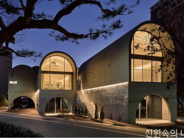 비정형의 땅 위에 나란히 올라선 건물들이 동그란 인사를 건넨다. 가족의 집에 특별함을 더하고 싶었던 건축주의 바람은 우아한 아치 지붕으로 완벽하게 실현되었다.(위, 아래) 매스를 인근 공원에 빗각으로 나열하여 걸으면서 상가와 공원이 관계를 만들 수 있게 했다. 도로에서는 상가 내부가 보이지 않는다. 공원과 도로 양편은 시선과 소음을 차단하기 위해 창을 최소한으로 열었다.프로젝트의 다양한 과제를 해결하며디자인측면까지 확실하게건축주 신상연, 오정미 씨 부부는 집짓기에 앞서 첫째로 독특한 건축 디자인을 원했다. 서로 닮아 있는 흔한 네모 모양의 집이 아닌, 랜드마크가 될 만한 집을 짓고 싶었다. 투닷건축사사무소는 건축주의 희망 사항을 반영해 두 가지의 설계안을 제안했고, 부부는 둥근 지붕이 인상적인 지금의 디자인을 선택했다. 근린생활시설이 복합된 다가구주택을 계획하며 크게 세 덩어리의 건물이 나란히 서는 그림이 완성되었다. 대지의 모양도 평범치는 않았다. 도로를 가르며 세모나게 뻗은 땅은 마을 초입에 위치해 눈에 뜨일 수밖에 없는 운명이었다. 땅과 주택의 개성 넘치는 형태가 맞아떨어져 지나가다 한 번쯤 다시 뒤돌아보고 싶은 특별한 외관의 집이 만들어졌다.투닷건축사사무소는 곡선이면서도 얇은 지붕 선을 구현해 내기 위해 지붕을 목구조로 택했다. 1층은 철근콘크리트 구조이고 2, 3층은 목구조인 하이브리드 주택이다. 공장에서 반원의 서까래를 제작해 현장으로 운반 후 설치가 이루어졌다. 날렵한 지붕 선과 들여진 창은 곡선을 한층 돋보이게 강조한다.SECTION건축주 세대의 주방. 거실과 단차를 주어 공간을 분리했다. 층고가 높아 충분한 길이의 펜던트 조명을 고르는 것에 어려움을 겪었다고 한다.거실과 방은 터널 같은 집의 양 끝단에 배치되었다. 사이드를 닫은 대신 전면과 후면은 창을 크게 열어 개방감과 반원의 매력을 함께 느낄 수 있도록 계획했다.건축주가 그다음으로 바랐던 것은 개방감이었다. 부부는 집 안에 들어왔을 때 가슴을 시원하게 열어줄 트인 공간을 원했다. 거실은 아치형 천장까지 6m가 넘는 층고를 지녔다. 거실에서 이어지는 전면부는 아치를 살린 거대한 창으로 구성되어 극적인 개방감을 형성한다. 여기에 실내 구조도 최대한 단순하고 명료하게 펼쳐지도록 만들었다.건축을 계획하기 전, 세모난 부지에는 포장마차 형식의 식당이 운영 중이었고, 건축주 가족은 부지 바로 옆에 위치한 주택에서 부모님 세대와 함께 살고 있었다. 13년을 살았던 집에서 가족이 독립을 결심하게 된 가장 큰 이유는 두 딸에게 각자의 방을 만들어주고 싶었기 때문이었다. 3층 두 딸의 방 역시 반원형의 지붕이 감성적이고 창의적인 분위기의 공간을 형성한다.HOUSE PLAN대지위치: 경상북도 문경시대지면적: 774㎡(234.14평)건물규모: 지상 3층 거주인원 : 4명(부부, 자녀 2), 임대세대 2가구, 근린생활시설 3호건축면적: 352.02㎡(106.49평)연면적: 658.09㎡(199.07평)건폐율 :45.48%용적률: 85.02% 주차대수 : 6대최고높이: 10.2m구조: 기초 – 철근콘크리트 매트기초 / 지상 1층 –철근콘크리트, 지상 2,3층 – 일반목구조단열재: 비드법보온판2종1호, 경질우레탄 2종2호외부마감재: 금속강판, 미장뿜칠창호재: 이건 알루미늄 시스템창호에너지원: 도시가스내부마감재: 벽 – 벤자민무어 친환경 도장, 제일벽지 베이직플러스 / 바닥 – 구정마루 강마루, 키앤세라 포세린타일 MARBLE STONE욕실 및 주방 타일: 키앤세라 포세린타일 MARBLE STONE수전 등 욕실기기: 아메리칸스탠다드, 라우체 www.lauche.co.kr주방 가구·붙박이장: 안나키친 디자인가구조명: 룩스몰계단재, 난간: 집성목+제작현관문: 성우스타게이트 방화현관문방문: 예림도어 ABS 슬림도어전기설비: ㈜천일엠이씨기계설비: ㈜한빛안전기술단구조설계(내진): 델타구조시공: ㈜KSPNC설계·감리: 투닷건축사사무소건축주 세대 내부의 나선형 계단. 화이트 톤으로 정리된 인테리어에 포인트가 되어 준다.3층 아이방. 벽으로 침실과 책상을 구분했다. 들여진 지붕 선 아래로 아늑한 발코니가 형성되었다.PLAN건축주 신상연 씨는 집짓기는 결국 설계와 시공팀을 잘 만나는 것이 가장 중요하다고 전했다. 회사의 포트폴리오와 재무제표를 꼼꼼히 확인하고, 나아가 서로 신뢰가 쌓일 정도의 깊이 있는 대화를 여러 차례 나누어 볼 것을 강조했다.입주한지 한달 남짓, 가족의 바람을 곳곳에 담은 둥근 집은 새로이 찾아올 추억들을 향해 동그란 품을 열어 두고 있다.(위, 아래) 임대 세대의 거실 모습. 마찬가지로 아치 지붕까지 층고를 열었고 3층은 보이드 공간을 주어 복층의 느낌이 난다.More about ‘barrel roof’지붕 서까래의 단면은 2×10이지만, 곡선의 형태를 연출하기 위해 2×12 부재를 사선으로 재단하며 구조물을 제작했다. 재단된 곡선 부재는 한 번 더 OSB 합판으로 엇갈려 보강 작업을 더했다. 공장에서 제작된 곡선 지붕재를 현장에서 고정하기 위해 하부에는 6각 피스를 사용하여 목구조 부재와 결합하였다.경제성과 미학적 요소에 의한 판단둥근 지붕을 구현하기 위해 오늘날에는 대부분 콘크리트나 철을 선택한다. 소규모 건축물에서는 철