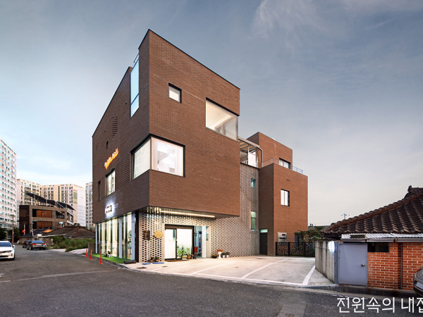 수익성만 강조한 특색 없는 상가건물은 시간이 지날수록 거주자의 만족도를 떨어트리며 결국 몇 년 지나지 않아 경쟁력을 잃고만다. 여기, 임대 수익과 좋은 디자인이라는 두 마리 토끼를 모두 잡은 상가주택이 있어 소개한다.어둠이 내려 앉은 시간, 조명이 켜진 건물은 동네 전체를 밝힌다.도시와 농촌의 경계, 광주광역시 서쪽 끝에 위치한 동네. 도심의 확장으로 도시화가 급속도로 진행되고 있는 이곳에 얼마 전 벽돌 옷을 입은 상가주택 한 채가 세워졌다.아파트 단지와 큰 건물들이 주변에 하나둘 생겨나고 있지만, 여전히 구불구불한 골목길이 있고 건물 앞으로 펼쳐진 논과 들판의 아름다운 풍경에 부부는 두말없이 이 땅을 선택했다.스케치업 이미지배치도두 사람이 주택을 짓게 된 가장 큰 이유 중 하나는 반려견과 함께하기 위해서였다.“복잡한 도심 생활에 지치기도 했지만, 아파트에 살다 보니 대형 반려견을 매번 사무실에 두고 퇴근해야 했어요. 아무래도 신경이 쓰이고 마음이 편치 않았죠.”결국 부부는 임대로 운영 중이던 사무실을 정리하고 반려견과 24시간 함께할 수 있는, 주거와 업무 공간을 통합한 건물을 짓기로 결심했다. 그리곤 처남의 소개로 ‘건축사사무소 이지’의 박호 소장에게 집의 설계를 맡겼다.골목길에서 바라본 건물 모습정면 뷰. 다양한 크기의 창이 건물에 표정을 만들어준다.단면도일단 1~2층은 임대공간의 확장성 및 융통성을 고려하여 철근콘크리트 라멘조로 결정하고, 3층 주택은 주거생활의 안정성과 쾌적성을 생각해 철근콘크리트 벽식구조를 적용하였다.3개 층의 각 공간을 조건에 따라 층별로 두 개 실까지 임대할 수 있도록 계단을 중심으로 두 공간으로 직접 진입이 가능케 하고, 임대공간이 분리될 경우를 대비해 화장실은 층마다 2개씩 계단실에서 직접 출입할 수 있게 했다.그리고 1층 부지 가장 안쪽에는 건축주의 사무실을 두었다. 이곳은 전용 출입구를 별도로 설치해 마을 안길로 연결되도록 하였고, 사무실과 맞닿은 놀이마당에서 뛰노는 반려견과 방문객의 동선 및 시각적 교차를 최대한 분리하였다.건물 측면 / 외장재는 세월이 흘러도 변함이 없고 천연 소재인 벽돌을 사용하자는 데 설계자와 건축주의 이견이 없었다. 시공사와 각종 자재선정 및 시공방법에 대한 의견이 상충되면 되도록 기존 건물 중 유사 사례를 방문하여 상호 간의 입장에서 장단점을 충분히 논의한 다음 자재선정 및 시공할 수 있도록 노력하였다.1층에 마련된 건축주의 사무실은 추후 임대인의 인테리어 컨셉을 고려하여 별도의 마감을 하지 않고 최소한의 마감을 제외한 나머지는 골조 자체를 마감재로 사용하였다.. 사무실에 면하여 반려견을 위한 조경이 있는 놀이마당을 계획했다.-----------------------------------------------------------------------------SPACE POINT. 계단실이 건물의 중심이며, 가장 중요한 계단은 외부 환경과 석양에 대응할 수 있도록 실외로 계획하였다. 서향에 면하는 계단실 벽체를 벽돌 패턴 쌓기로 해 빛을 선택적으로 통과시켜 기하학적인 그림자 연출로 독특한 공간이 되길 바랐다.-----------------------------------------------------------------------------계단을 올라 2층은 모두 임대공간으로 사용 중이며, 마지막 3층은 서쪽 석양을 조망할 수 있는 거실과 반려견의 활동 마당까지 더한 거주 공간을 마련했다.특히 주택은 별도의 인테리어 콘셉트를 고려하기보다는 자연환경에 거슬리지 않으며 친환경적으로 깔끔하게 정돈했다.아담한 거실 전경. 코너창을 통해 아름다운 마을 풍경이 펼쳐진다.목재 가구와 푸른 빛 타일 벽면이 잘 어우러진 주방PLAN①주차장 ②현관 ③근생 ④거실 ⑤안방 ⑥주방 ⑦침실 ⑧다용도실 ⑨드레스룸 ⑩화장실 ⑪복도 ⑫보일러실/세탁실 ⑬탕비실 ⑭발코니 ⑮테라스 ⑯툇마루 ⑰옥상마당 ⑱다락 ⑲반려견 활동공간 현관을 중심으로 좌측은 거실과 주방 등 공용 공간, 우측은 침실 등 사적 공간이 자리한다. 특히 두 공간 사이에는 단 차이를 주어 자연스레 성격 다른 두 영역을 분리해주었다.부부가 머무는 곳인 만큼 두 사람이 사용하기에 넘치지 않는 적당한 면적으로 평면을 알차게 계획했다. 넓은 마당이 없는 상가건물이다 보니 부족할 수 있는 외부공간은 동향 테라스와 다락을 통한 옥상을 연계해 다양한 용도에 따라 접근이 쉽게 하였다. 이 공간들은 부부의 야외 활동을 돕는 장소이기도 하지만, 반려견의 생활공간이기도 하다.공용 공간과 사적 공간 사이에는 단 차이를 주어 두 영역을 자연스레 분리했다.테라스와 맞닿아 빛 잘 드는 침실HOUSE PLAN대지위치 ▶ 광주광역시 서구 마륵동 579대지면적 ▶ 427.52㎡(129.32평)건물규모 ▶ 지상 3층|거주인원 ▶ 2명(부부)건축면적 ▶ 253.39㎡(76.65평)|연면적 ▶ 635.39㎡(192.20평)건폐율 ▶ 59.27%|용적률 ▶ 148.62%주차대수 ▶ 5대|최고높이 ▶ 13.30m구조 ▶ 기초 - 철근콘크리트 매트기초 / 철근콘크리트 라멘조(벽), 철근콘크리트 슬래브(지붕), 경량철골구조(다락)단열재 ▶ 바닥 - THK90~180 압출법보온판 1호 / 벽- THK60 저방사단열재, THK115 비드법 보온판1호외부마감재 ▶ 외벽- THK90 신토석 벽돌 치장쌓기, 스터코(백색) 마감 / 