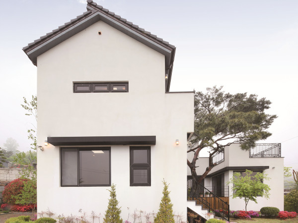 주변 풍경 및 정원과 잘 어우러지는 심플한 주택 ①현관 ②거실 ③주방 ④방 ⑤욕실 ⑥보조주방 ⑦다용도실 ⑧보일러실 주택은 소나무를 꼭 끌어안는 모습으로 형태를 갖췄다.데크로는 따로 진입 계단을 만들어 출입 동선과의 겹침을 피했다. 집이 지어진 지 1년. 처음 어색했던 정원도 그동안 더욱 풍성해졌다. 길게 구성된 현관 복도는 주택 내·외 분위기 전환을 위한 쉼표 역할을 한다.거실에서 주방으로 향하는 동선에 마련된 넓은 식당주방 가구는 동선이나 시야를 방해하지 않게끔 일자로 시원하게 펄쳤다. 주방 쪽 창으로는 가깝게는 정원을, 멀게는 밀양강까지 조망할 수 있다.장인이 손으로 두들겨 만든 단조 난간은 주택의 클래식한 분위기를 만드는 데 일조한다.넓게 퍼진 소나무 가지는 테라스의 그늘을 만들어주는 고마운 존재다. 2층 가족실과 방 천장에는 보와 서까래를 닮은 굴곡을 내어 한옥의 감각을 주고자 했다. 비 오는 날 산을 넘어가는 구름과 물안개가 연출하는 절경은 2층 가족실에서 누리는 최고의 전망이다.