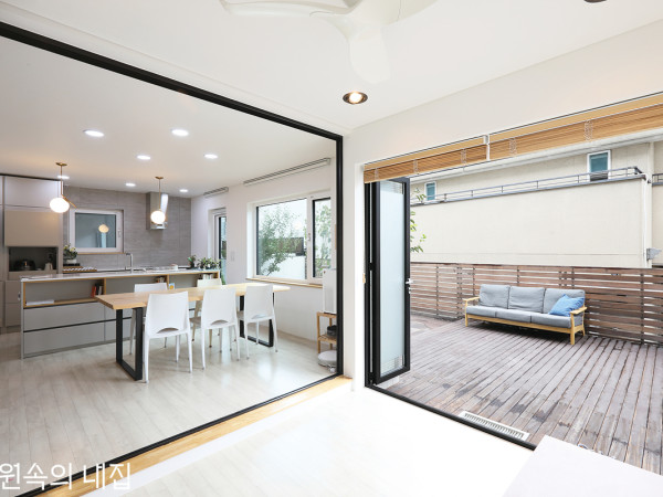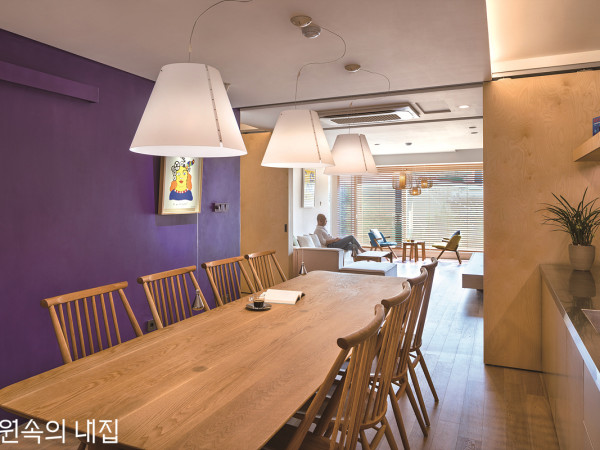하나부터 열까지 전문가의 손길이 필요한 낡은 아파트 리모델링. 그동안 많은 집을 설계해온 베테랑 건축가에게도 결코 쉽지 않은 작업이었다.JMY architects 윤재민 소장 가족 현재 국내 아파트의 문제점을 보완하여 새로운 주거 유형을 만들다Q. 그동안 많은 집을 설계하셔서 당연히 주택에 거주하실 줄 알았는데, 리모델링한 아파트라니 의외였어요집을 짓고 싶었지만, 그러지 못할 여러 가지 사정이 있었어요. 일단 저를 포함한 중학생 딸, 아들이 지금까지 자라온 추억 많은 동네라 이곳에 대한 익숙함과 주변인들의 관계성 등을 고려했을 때 쉽게 떠날 수가 없더라고요. 조부모님이 같은 동네에 살고 계시기도 했고요. 그래도 직업이 건축가이다 보니 언젠가 우리 집은 꼭 내가 설계해보고 싶단 생각을 늘 가지고 있었어요. 현실적인 문제를 고려할 때 주택 신축은 언제가 될지 모르는 미래의 일이라서 이번 프로젝트는 리모델링이긴 하지만, 어느 정도 소원 성취는 했다고 볼 수 있죠(하하).INTERIOR FINISHED - 흰색 도장을 바탕으로 피부와 접촉이 있는 부분(바닥, 일부 붙박이 가구와 여닫이문)은 화이트오크 원목, 자작나무 합판 등 목재를 사용했고, 시각적으로 중요한 벽은 기능에 따라 색에 변화를 주었다. 타일은 크게 3종류인데, 아이들이 주로 쓰는 곳은 밝은 아이보리빛 타일, 안방은 짙은 회색 타일, 앞뒤 발코니와 거실 확장 부분에 일부 테라코타 타일을 써, 공간이 풍성해 보이도록 했다. Q. 40년 된 아파트라 손댈 곳이 많았겠어요한마디로 이대로 쭉 살기는 불가능한 상태였죠. 주방과 거실 중심의 방 배치 구조는 40년 전과 크게 다를 것 없지만, 밖으로 맞닿아 뚫린 창 없이 모든 실이 앞뒤 발코니를 통해 간접적으로 외부와 연결된 상황이었어요. 수납공간 부족으로 어느 순간부턴 짐과 먼지가 동시에 쌓이기 시작했고, 쾌적한 주거 환경은 커녕 주 생활인 먹고 자고 대화하는 기본적인 활동조차 제약을 받으니 점점 스트레스가 극에 달하더라고요. 잦은 설비 고장으로 단열이 제대로 되지 않아 각 실의 활용도도 크게 떨어져 있었죠.HOUSE PLAN대지위치 ▶ 부산광역시 사하구|거주인원 ▶ 4명(부부 + 자녀 2)|건축면적 ▶ 129㎡(39.02평)|단열재 ▶ 압출법보온판 가등급 1호 50mm|창호재 ▶ 프레임워크 135mm 알루미늄 시스템창호|에너지원 ▶ 도시가스, 시스템 에어컨, 에코윈 복사냉난방시스템|내부마감재 ▶ 벽 - 석고보드 위 올퍼티 친환경 수성 페인트 뿜칠 마감(벤자민 무어 페인트), 스텐헤어라인 평판 / 바닥 - 거실·방 : Material&Design(머테리얼앤디자인) 수입 원목마루 MND OAK NAT, 발코니·다용도실 : Material&Design 수입 테라코타 타일 SANT'AGOSTINO I CHIOSTRI Cotto|욕실 및 주방 타일 ▶ 벽, 바닥 - Material&Design 수입 이태리산 포세린 타일 / 안방 욕실 - COEM I SASSI Grigio Scuro Nat / 거실 욕실 - COEM I SASSI Bianco Nat / 주방 - KEOPE SUITE Grey Nat|수전 등 욕실기기 ▶ 아메리칸스탠다드|주방 가구·붙박이장 ▶ 우레탄 무광 도장 마감 세로미가구 주문 제작|조명 ▶ 일반 조명 - 원룩스(제작 조명), 에어텍 LED T5 / 타켓 조명 - 동명전기 DDS-27600 / 펜던트 - 루체플랜 코스탄자(ALL WHITE w/diffuser), forestier Bamboo light|중문 ▶ 중앙토탈 주문 제작|방문 ▶ 영림도어, 자작나무 슬라이딩 도어|시공 ▶ 콘크리트공작소 & 그린아이디|설계 ▶ JMY architects 윤재민 051-244-4134 www.jmy.krQ. 오래된 연식에 리모델링 과정도 쉽지 않았을 텐데아파트의 세대 수가 작고 평상시 이웃 관계가 원만한 편이었지만, 그럼에도 불구하고 역시나 철거과정과 공사 소음으로 인한 민원이 제일 힘들었어요. 처음에는 단순 인테리어 공사 정도로 생각하고 철거를 시작했는데, 천장을 뜯어보니 아파트 준공 당시 설치되었던 엄청난 양의 중앙집중식 난방용 배관이 발견되었죠. 게다가 바닥 면은 울퉁불퉁하고 실마다 높이차가 심해 어쩔 수 없이 기본 골조와 일부 벽을 제외한 전부를 철거해야 했어요. 그러니 공사 기간은 약 한 달 이상 길어지고, 아무리 노력해도 비용 상승을 피해 갈 수 없었죠.1,2 - 발코니를 확장한 넓은 거실. TV 시청을 위해 벽은 짙은 회색으로 칠했다. 기존 주방을 이전하고 확장한 식당에는 미니바와 수납공간이 마련되었다.Q. 처음 계획에서 차질은 없었는지계획 초기 목표는 거실, 주방, 화장실 등 단순히 노후한 시설 일부를 기능적이고 청결하게 만들어 좀 더 나은 삶의 환경을 개선하는 정도였어요. 하지만 직업병 탓인지 조금씩 욕심이 나기 시작했고, 급기야 범위가 골조를 제외한 내부 공간 전체로 자연스럽게 확장되었죠.Q. 바뀐 공간에 대해 설명해주세요우선 공간 구조상 크게 변화된 부분은 앞뒤 발코니 확장으로 넓은 거실을 확보하고, 주방을 아무 기능이 없던 방 쪽으로 이동시켜 3m의 식탁이 수용되는, 기존에 없던 식당 공간이 생겨난 점입니다. 그리고 거실과 주방에 미닫이문을 설치하여 각각 독립된 기능에 충실함과 동시에 상황에 따라 전체 및 가변적 활용이 가능하도록 고안했어요. 발코니 확장으로 기존의 공간이 강화되거나 새로운 공간이 생겨 집의 활용도가 높아진 것도 흥미롭지만, 자연채광 및 통풍이 가능해졌고 동시에 외부 공간으로 뷰가 생겨