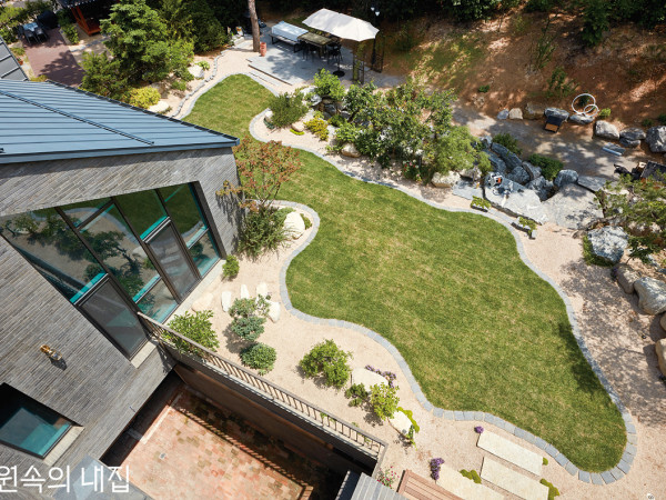사람 챙기길 좋아하는 가족이 집을 지었다. 자연을 품은 듯 가만히 정원을 감싼 주택은 꼭 그들을 닮았다.오랫동안 로망으로만 품어온 단독주택 생활. 건축주 안병모 씨는 10년이 넘는 시간 동안 과장을 조금 보태어 안 가본 데 없이 땅을 찾으러 다녔다. 그만큼 입지를 중요하게 생각한 그가 비로소 선택한 곳은 광교신도시의 작은 공원을 마주한 땅. 남북으로 사다리꼴 형상의 대지는 북측으로는 진입로가, 남측으로는 도로보다 한 층 위 높이의 평지가 공원을 병풍 삼아 펼쳐진다.SECTION ①차고 ②기계실 ③창고 ④복도 ⑤취미실 ⑥현관 ⑦거실 ⑧욕실 ⑨게스트룸 ⑩서재 ⑪주방/식당 ⑫다용도실 ⑬침실 ⑭세탁실 ⑮ 드레스룸 16 가족실밖에서 잘 보이는 전면에 계단실을 두어 프라이버시를 보호하고자 했다. 최상층 창문 상부는 지붕과 경사를 나란히 주어 조형미를 살렸다. HOUSE PLAN대지위치 ▶ 경기도 수원시 대지면적 ▶ 333㎡100.73평) 건물규모 ▶ 지하 1층, 지상 3층 | 구성원 ▶ 4명(부부 + 자녀 2) 건축면적 ▶ 154.83㎡(46.84평) | 연면적 ▶ 403.64㎡(122평) 건폐율 ▶ 46.50% | 용적률 ▶ 75.75% 주차대수 ▶ 3대 | 최고높이 ▶ 12.2m 구조 ▶ 기초 - 철근콘크리트 매트기초 / 지상 – 철근콘크리트 단열재 ▶ 벽 - 비드법단열재 2종1호 110mm + T32 열반사단열재 + T20 공간 / 지붕 - 비드법단열재 2종1호 100+200(mm) + T13 열반사단열재 + T20 공간 외부마감재 ▶ 외벽 – 현무암 벽돌, 송판무늬 노출콘크리트, 박판세라믹 / 지붕 – 징크(JARDEN ZINC Ocean Blue) 담장재 ▶ 노출콘크리트 위 발수 코팅 | 창호재 ▶ 이건창호 T35 알루미늄 시스템창호(삼중양면로이유리) 에너지원 ▶ 개방형 지열시스템(옥수개발) | 조경석 ▶ 현무암 판석, 강원도 강돌 조경 ▶ ㈜다원특수조경 전기·기계 ▶ ㈜정명기술단 기술사사무소 | 설비 ▶ ㈜코담기술단 구조설계 ▶ 지우구조기술사사무소 시공 ▶ 건축주 직영공사 설계 ▶ 플라잉건축사사무소 02-6013-5063 www.flyingarch.co.kr시원스레 뻗은 1자형 계단과 복도의 모습. 현관에 들어서면 돌아가지 않고 거실과 주방, 2층으로 각각 바로 통하도록 동선을 계획했다. 신재생에너지 활용, 생태면적률 의무 적용 등 지켜야 할 지구단위계획 지침이 적지 않았지만, 그 모든 것들을 감수할 만큼 마음에 드는 곳이었다. 땅은 마치 운명과도 같아 한눈에 알아볼 수 있다는 말이 병모 씨에게도 통한 걸까. 땅을 본 바로 그날, 그는 10년간의 여정에 마침표를 찍었다.POINT 1 - 개방형 지열시스템 신재생에너지 활용구역인 주택에 7.5RT 용량의 개방형 지열시스템을 설치해 온수·냉방·정원수 등에 활용한다. POINT 2 - 생태면적률 대지면적의 40% 이상을 생태적 기능 및 자연순환기능이 있는 토양 면적(생태면적)으로 채워야 했다.높은 층고의 거실. 등산로에서 보이는 남측 대신 마당을 향해 창을 크게 내었다. 가족과 손님 모두가 함께 쓰는 공간인 1층에는 이태리 수입 타일을 깔아 집에 적당한 긴장감과 무게감을 더했다. 설계는 플라잉건축사사무소 서경화 소장이 맡았다. 건축뿐만 아니라 이후의 생활까지 고려한 집에 대한 철학이 서로 통했다. 서 소장은 “대지 위치는 최상의 조건이었지만, 등산로에서 집이 보이는 부분과 손님이 자주 오는 라이프스타일에 대한 대안을 제시해야 하는 고민이 있었다”며 이를 단서로 삼아 설계를 시작했다. 그 결과 외부의 시선이 바로 만나는 주택의 남측 전면부는 ‘열려있되 보이지 않는 공간, 혹은 봐도 무방한 공간’인 계단실이 배치되었다. 여기에 접객을 위해 거실과 주방을 양쪽으로 분리하면서 주택의 형상은 자연스레 두 팔을 벌려 환영하는 듯한 모양새가 되었다. 사람을 좋아해 늘 손님으로 가득한 이 집에 ‘Welcome House’라는 이름이 붙게 된 순간이다.1층은 가족과 손님이 함께 하는 공간을 콘셉트로 잡고, 2층은 오직 사적인 영역들로 채웠다. 지하층에는 넉넉한 주차장과 취미실을, 옥상 휴게공간에는 오직 가족만을 위한 전용 가족실을 두었다.주방은 넓은 상판의 아일랜드와 다이닝 테이블이 데크까지 이어지는데, 미닫이문을 단 다용도실에서는 냄새나는 음식을 조리할 수 있다. 3층 가족실에서 바라본 마당 전경. 비정형적인 잔디 정원 주위로는 왕마사를 깔고, 향나무, 매화나무, 구상나무, 장미 등을 심었다. 지하 주차장에 주차 후 외부 계단을 통해 현관으로 진입할 수도 있지만, 썬큰을 거쳐 건물 안으로 들어와 지하에서 지상으로 올라갈 수도 있다. 특히 이 집의 백미는 모든 메인 공간이 외부와 연결된 전이공간이 있다는 점이다. 마당과 다이닝룸을 자연스레 이어주는 데크, 외부 시선은 차단하면서 풍경은 오롯이 누리는 각방 발코니, 지하층임에도 충분한 채광과 환기를 보장하는 썬큰 등은 집 안팎을 풍성하게 만들어주는 장치다.INTERIOR SOURCE내부마감재 ▶ 벽 - LG하우시스 벽지(방), 안티스터코 및 벤자민무어 친환경 도장(거실, 주방) / 바닥 – 인도네시아 수입 원목마루(방) 상아타일(거실, 주방) 욕실 및 주방 타일 ▶ 상아타일(이태리 수입 타일 RUNA _ GRIGIO/SCURO, RUNA _ NERO,NOON-03) 수전 등 욕실기기 ▶ 아메리칸스탠다드, INUS 주방 가구 ▶ 엔뉴(맞춤가구) 조명 ▶ 비츠조명 제작(볼 타입, 
