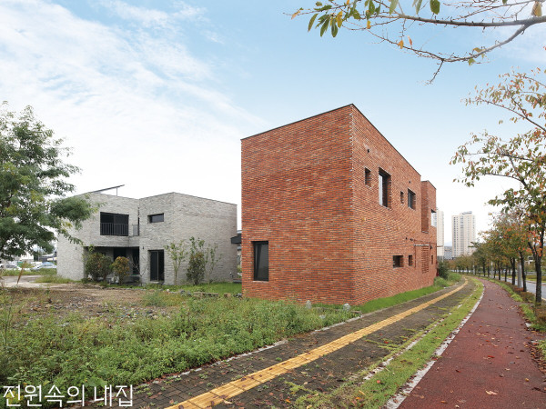 함께 집을 짓는다는 건 장점이 많은 한편, 결코 쉬운 일이 아니다. 원하는 것과 조율할 것을 분명히 구분한 세 친구의 ‘따로 또 같이’ 집짓기 스토리1 - 사이마당집에 모인 (왼쪽부터)건축주 박상선, 문병삼, 박성호 씨. 각기 취향이 다른만큼 설계·시공자 찾기도 쉽지 않았다.진주혁신도시의 택지지구에 들어선 비슷한 분위기의 벽돌집 세 채. 직장 동료이자 친구인 세 사람이 ‘취미를 위해’, ‘층간 소음 때문에’, ‘가족 구성원이 늘어서’라는 서로 다른 이유로 주택행을 결심했고, 용감하게 집짓기에 도전한 결과다. 혼자는 어려워도 함께라면 두려울 것이 없었던 덕분이다. 항공우주산업 종사자인 이들은 설계의 중요성을 누구보다 이해했고, 세 채를 한꺼번에 시공하는 것이 어렵다는 것도 잘 알고 있었다.2 - 산책로에서 바라본 하늘마당집(좌)과 안마당집(우). 여러 채를 한꺼번에 짓기 때문에 규모의 경제를 활용해 자재 및 시공 비용을 절감할 수 있었다.다행스럽게도 무탈한 과정 끝에 지난 9월 입주를 마친 세 가족. ‘전문가들을 잘 만난 덕분’이라며 만족감을 드러내는 이들의 집 내부는 외관과 달리 그들의 취향과 기호만큼 개성이 넘친다.HOUSE PLAN대지위치 ▶ 경상남도 진주시 대지면적 ▶ 1호 – 268.0㎡(81.07평), 2호 – 275.60㎡(83.36평), 3호 – 260㎡(78.65평) 건물규모 ▶ 지상 2층 건축면적 ▶ 1호 – 118.82㎡(35.94평), 2호 – 98.19㎡(29.70평), 3호 – 120.12㎡(36.33평) 연면적 ▶ 1호 – 149.29㎡(45.16평), 2호 – 155.32㎡(46.98평), 3호 – 162.24㎡(49.07평) 건폐율 ▶ 1호 – 44.33%, 2호 – 35.62%, 3호 – 46.20% 용적률 ▶ 1호 – 55.70%, 2호 – 56.35%, 3호 – 62.40% 주차대수 ▶ 2대 최고높이 ▶ 7.35m 구조 ▶ 기초- 철근콘크리트 매트기초 / 지상 – 철근콘크리트 단열재 ▶ 비드법단열재 2종1호 100mm, 180mm 외부마감재 ▶ 벽 - 고벽돌 일면 커팅 위 침투성 발수 2회 / 지상 – 무근콘크리트, 노출우레탄 복합방수 창호재 ▶ 이건창호 70mm, 185mm 에너지효율 1등급 PVC 시스템창호(해든창호) 에너지원 ▶ 도시가스, 태양광패널 구조설계 ▶ 정구조 설비 및 소방 ▶ 우정 ENC 설계 및 감리 ▶ 건축사사무소 studio DoS 황민택 010-4650-1996 www.dosspace.com 시공 및 인테리어 ▶ 민 건축인테리어 055-854-8917 http://blog.naver.com/oki70061호 - 그윽한 커피 향과 벽난로가 있는 안마당집3 - 남북으로 긴 대지 조건을 활용해 길에 면하는 쪽은 담백하게 마감하고, 안마당으로 채광을 확보했다. 4 - 드론, 커피, 음악, 영화 감상 등 재주도 많고 취미도 많은 건축주를 위한 별채의 취미실 INTERIOR SOURCE거주인원 ▶ 4명(부부 + 자녀 2) 내부마감재 ▶ 벽 - LG하우시스 베스띠 실크벽지 바닥 – 화신하우징(1층), 구정마루 프레스티지 블랙오크(2층) 욕실 및 주방 타일 ▶ 화신하우징, 윤현상재, 아줄타일 수전 등 욕실기기 ▶ 아메리칸스탠다드 주방 가구 ▶ 비튼디자인 조명 ▶ 잇츠라이팅 계단재 ▶ 애쉬 원목 현관문 ▶ 캡스톤도어 방문 ▶ 영림도어, 제일도어 중문 ▶ 제일도어 붙박이장 및 욕실가구 ▶ 이케아, 비튼디자인 데크재 ▶ 방킬라이 위 오일스테인세 집 중 유일하게 외벽에 붉은 벽돌을 쓸 만큼 인테리어에도 적극적으로 참여한 안마당 집. 카페에 온 듯 따뜻한 느낌의 인테리어와 함께 본채와 별채 사이의 중정(안마당)이 이 집의 백미다. TV 대신 설치한 벽난로, 윈도 시트, 미니 화장실 등 집 안 곳곳 세세하게 신경 썼으며, 현관을 중심으로 다이닝룸과 중정, 외부로 연결되는 회유 동선이 다양한 이동을 가능케 한다.PLAN①현관 ②거실 ③주방/식당 ④보조주방 ⑤주차장 ⑥서재 ⑦화장실 ⑧게스트룸 ⑨데크 ⑩마당 ⑪안마당 ⑫침실 ⑬드레스룸 ⑭가족실 ⑮취미실1F – 84.62㎡ / 2F - 70.70㎡ 5 - 외부에서도 실내에서도 바로 진입할 수 있는 주택의 안마당. 바닥까지 붉은 벽돌을 연장해 일체화된 느낌을 연출하고, 도로면은 벽돌 영롱쌓기로 경계를 지었다.6,7 - 본채 2층 부부 침실. 도어가 없는 아치 개구부 안쪽으로 블랙 인테리어의 욕실이 자리한다. 맞벌이 부부의 바쁜 출근 시간을 배려해 두 개의 세면 공간을 설치했다.8 - 다이닝룸의 다인용 우드슬랩 테이블은 설계를 시작한 동시에 구입할 정도로 1층 공간의 핵심 요소였다. TV 대신 설치한 바이오에탄올 벽난로는 냄새라는 단점은 없으면서 따뜻한 정서는 살리는 장치다.2호 - 아이들이 마음껏 뛰노는 하늘마당집9 - 채광과 프라이버시, 다양한 외부 공간 등을 고려해 볼륨감 있는 매스로 탄생한 하늘마당집 외관 10 - 실내는 장식이나 기교 없이 깔끔한 스타일로 마감했다. INTERIOR SOURCE거주인원 ▶ 4명(부부 + 자녀 2) 내부마감재 ▶ 벽 - LG하우시스 베스띠 실크벽지 / 바닥 – 구정 프레스티지 블랙오크, 애쉬 브라운 욕실 및 주방 타일 ▶ 윤현상재 수입타일, 화신하우징 수전 등 욕실기기 ▶ 이케아, 아메리칸스탠다드 주방 가구 ▶ 한샘 그레이스 스노우, 부광씽크 조명 ▶ 잇츠라이팅 계단재 ▶ 멀바우 집성목 현관문 ▶ 캡스톤도어 방문 ▶ 영림도어 중문 ▶ 제일도어 데크재 ▶ 방킬라이 위 오일스테인북향의 땅이라 채광과 환기에 불리하지 않도록 마당과 테라스를 배치한 하늘마당집. 건축주 부부는 층간소음에서 자유로운 아이
