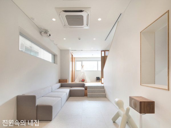 서울 사는 평범한 4인 가족이 탈(脫) 아파트를 감행했다. 응암동 골목 안 4층 집은 상가와 임대 세대, 마당 있는 살림집까지 좁은 땅을 알차게 채운다.ⓒ윤동규대지면적 > 96.49㎡(29.19평)건축면적 > 57.43㎡(17.37평) 가족 구성원 > 부부, 자녀 2 내 가족의 삶에 꼭 맞춘, 마당 있는 집에 대한 꿈. 아주 보통의 30대 부부가 이를 서울에서 실현하기란 쉽지 않음은 분명했다. 박형진, 유미화 씨 부부는 1년여에 걸쳐 적당한 땅을 찾아 다녔고, 두 번의 계약 불발에 이어 마침내 은평구 응암동에서 이 오각형 땅을 만났다. 하지만, 서울의 살인적인 토지 비용과 건축비를 충당하기 위한 대책이 필요했다.“몇 번의 미팅을 거쳐 건축사사무소 H2L와 함께 집짓기를 고민해보기로 했어요. 소장님들이 저희와 비슷한 또래라 말이 잘 통할 것 같았거든요. 실제로도 그랬고요(웃음).”예산 문제는 건축 가능한 4개 층 중 1층에 근린생활시설을, 2층에 임대 세대를 구성해 해결해보기로 했다. 건축비의 효율적인 운용을 위해 임대 면적과 조건이 잰 걸음으로 먼저 확정되었고 그 후 3, 4층 거주 공간의 설계 과정이 긴 호흡으로 이어졌다.BEFORE30평이 채 되지 않는 대지는 경사진 주택가 골목 안, 밀접한 단독주택과 빌라 건물들 사이에 자리한다. 길은 좁았지만, 모퉁이에 위치해 여러 방면에서의 차량 접근이 가능했고 덕분에 공사도 한결 수월했다. 한눈에 연식을 가늠케 하는 노후 건물은 신축을 위해 철거했고, 대지 형태를 그대로 살려 건축 가능한 최대 높이인 4층 건물을 새로 올렸다. SECTIONPLANⓒ윤동규HOUSE PLAN대지위치 ▶ 서울시 은평구 건물규모 ▶ 지상 4층 | 연면적 ▶ 182.74m2(55.28평) 건폐율 ▶ 59.52% | 용적률 ▶ 189.39% 주차대수 ▶ 2대 | 최고높이 ▶ 13.1m 구조 ▶ 기초 – 철근콘크리트 매트기초 / 지상 – 철근콘크리트 단열재 ▶ 경질폴리우레탄단열재 2종2호 90T, 130T 외부마감재 ▶ 벽 - 두라스택 S340 콘크리트 블록 치장쌓기 위 발수코팅 / 지붕 – 비노출 우레탄 방수 위 보호 모르타르 및 분체도장 금속두겁 창호재 ▶ 제작 시스템창호 90mm(에너지효율 3등급) + 24T 복층유리 | 에너지원 ▶ 도시가스 전기·기계·설비 ▶ 우리엔지니어링 | 구조설계 ▶ 제네럴구조 내부마감재 ▶ 벽 – 신한벽지, 수성페인트 / 바닥 – 산들마루 수오미 7.5T 강마루 욕실 및 주방 타일 ▶ 하나세라믹 수전 등 욕실기기 ▶ 대림바스, 비바체 수전 | 주방 가구·붙박이장 ▶ 제작 조명 ▶ 을지로 미스터라이팅, 조명이야기 계단재, 난간 ▶ 자작나무 디딤판 + 20mm 환봉 현관문 ▶ 1층 - 제작 금속유리문 / 2,3층 - 방화 현관문(도장) | 방문 ▶ 예림도어 데크재 ▶ 방킬라이 방부목 19mm 시공 ▶ 디자인그룹 가가 031-273-4885 www.design-gaga.com 설계 ▶ 건축사사무소 H2L(Architects H2L) 02-464-1019 www.architectsh2l.com절제된 선과 차분한 톤, 리드미컬한 창의 배치로 튀지 않으면서도 세련된 느낌을 주는 외관. 1층에는 아내 미화 씨가 베이커리를 운영할 예정이다. 4층 거실 겸 주방에 모여 있는 건축주 가족의 단란한 모습자녀방은 위층과 소통을 위해 개구부 아래 나란히 배치했다. 계단 하부는 수납으로 활용하고, 안쪽 창가에 벤치가 있는 소(小)거실을 만들어 주었다. 건축가는 부부에게 조금 낯선 층별 구성을 제안했다. 현관이 있는 3층에 각 침실을 두고 4층에 거실, 주방 및 식당을 배치하자는 것. 공용공간을 위로 올려 일조권 사선제한으로 생긴 4층 옥상 마당과 연계하고, 층간소음 방지의 효과까지 누릴 수 있는 묘수였다. 다만 현관에서 위층으로 자연스럽게 걸음을 유도하고, 두 층이 쉽게 소통할 수 있는 수직 동선을 형성하는 게 관건이었다.여기서 ‘그물 놀이터’가 열쇠가 된다. 작게 오픈한 4층 슬래브에 그물 놀이터를 설치하고 바로 아래 자녀방을 두어 위층에서 쉽게 소통할 수 있게 했다.“올여름 내내 예봄이는 옥상 마당의 큰 풀장에서 친구들과 신나게 물놀이를 즐겼어요.”아직 어린 동생 예윤이도 머지않아 집 안과 마당을 활보하게 될 터. 용감한 도전으로 새집을 쟁취한 가족에게는 벌써 삶의 변화가 조금씩 움트고 있다.계단실 옆 안쪽에 자리한 큰딸 예봄이의 방 꼭 필요한 것만 둔 안방. 2개의 문을 내어 답답함을 덜고 편의성을 높인 드레스룸이 딸려 있다. SPACE POINT1 옥상 마당 일조권 사선제한으로 후퇴하여 생긴 4층 테라스에 이 집의 넓은 마당이 생겼다. 폴딩도어를 활짝 열면 거실, 주방의 공용부와 바로 이어지는 가족만의 아늑한 휴식처다.2 그물 놀이터 침실, 욕실 등 사적 공간으로 구성된 3층과의 연결성을 위해 4층 거실 슬래브를 오픈하고 그물 놀이터를 설치했다. 예봄, 예윤 자매가 누릴 수 있는 이색 놀이 공간이다.3 천창 그물 놀이터 바로 위에 낸 천창은 아래층 구석구석까지 채광을 확보해주는 역할을 한다. 특히 아이방 앞, 계단 하부를 활용해 마련한 소거실에는 밝고 따뜻한 빛이 바로 닿는다.취재 _ 조고은 사진 _ 변종석, 윤동규ⓒ 월간 전원속의 내집 / www.uujj.co.kr