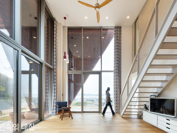 흔치 않은 사선의 붉은 벽돌 외관. 건축주가 오랫동안 바라온 집이 비로소 환한 불을 밝혔다.전면 유리로 되어있는 거실의 남서 코너는 테라스 겉면에 스크린 역할을 하는 벽을 두어 자칫 불편한 시선을 차단한다. 또한, 지면에 가까울수록 좁아지는 벽의 형태는 내부에서 보기에 답답하지 않으며, 환경적인 문제점들을 해결하는 역할을 해 내부가 쾌적하도록 도와준다. 조각, 가구 등에 관심이 많던 건축주는 꼭 한 번 작품이 되는 집을 지어보고 싶었다고 한다. 생활하며 요소요소 보는 즐거움을 누리고 유희할 수 있는 주택. 남들은 배부른 소리라 했지만, 그에겐 그저 집을 바라보는 관점의 차이일 뿐이었다. 같은 비용으로 기능 위주의 집을 짓느냐, 주거로서의 기능을 심미적으로 풀어내느냐. 답을 정하고 나니 건축가와 집을 지어야 할 이유는 더욱 분명해졌다. 이후 나름의 기준을 세워 조건에 맞는 건축가를 물색했다. 그러던 중 눈에 들어온 주택이 있었고, 설계자를 찾았다.“고민 없이 QJARCHITECTURE를 선택하고 제가 요구한 사항은 딱 하나, ‘작지만 힘이 있는 집’이었어요. 은퇴 후 생활을 염두에 둔 주택이었기에 방 2개 30평대이지만, 그 존재감만큼은 남달랐으면 했죠. 사는 사람이 나이 든다 하여 집까지 힘이 빠지는 걸 원치 않았어요.”도로에서 대문으로 진입하는 부분에 난간과 게이트 높이에 맞춰 옹벽 위 개비온을 설치하여 콘크리트의 삭막함을 조금 덜어내고자 했다.집으로 들어가는 입구인 동측면. 벽돌 벽의 코너가 열려 현관이 되었다. 맞은편 집을 고려해 의도적으로 현관을 살짝 가렸다. SECTION①현관 ②거실 ③주방 ④서재 ⑤다용도실 ⑥창고 ⑦화장실 ⑧정원 ⑨주차장 ⑩뒷마당 ⑪안방 ⑫자녀방 ⑬테라스 ⑭홀 ⑮욕실 HOUSE PLAN대지위치 ▶ 경기도 파주시 대지면적 ▶ 400㎡(121평) | 건물규모 ▶ 지상 2층 건축면적 ▶ 97.54㎡(29.50평) | 연면적 ▶ 136.50㎡(41.29평) 건폐율 ▶ 24.39% | 용적률 ▶ 31.31% 주차대수 ▶ 1대 | 최고높이 ▶ 7.4m 구조 ▶ 기초 – 철근콘크리트 매트기초 / 지상 – 철근콘크리트 단열재 ▶ 기초 – 150mm 압출법단열재 가등급 / 벽 – 200mm 비드법단열재 2종1호 / 지붕 – 250mm 비드법단열재 2종1호 외부마감재 ▶ 벽 – 점토벽돌 적색(브릭코 넬리센 로시나), 점토벽돌 회색 아르테(브릭코 넬리센 isofacade 시스템) / 지붕 – 알루징크 담장재 ▶ 평철 난간 + 개비온 담장(자체 제작) 창호재 ▶ 43mm 삼중 로이투명유리, 이건 ESS 190 리프트 슬라이딩, 이건 AWS 70 HI T/T 창문, 이건 FWS 60 SI 커튼월 에너지원 ▶ 가스보일러 조경 ▶ 건축주 직영 구조설계(내진) ▶ 다우 구조설계사무소 시공 ▶ 이디포 건설 설계 ▶ QJARCHITECTURE남측면 테라스에서 서향을 바라본 모습. 아늑하게 가려진 테라스는 비를 맞지 않으면서 밖에 나와 잠시 휴식을 취할 수 있는 쉼의 장소가 되어준다. 창 너머 다이닝 공간이 포근함을 더한다. 2층 영롱쌓기 벽 뒤에는 자녀방 테라스가 있는데, 벽돌 틈 사이로 거실을 볼 수 있다. SPACE POINT|기울어진 벽대지는 콘크리트 옹벽으로 일부 조성된, 약간의 경사를 지닌 땅이었다. 대지 뒤편으로는 이미 주택 3가구가 있었고, 주변 곳곳으로 신축공사가 한창이었다. 대지로의 접근이 이미 동측으로 정해진 상태에서 건축주가 거실과 방에서 즐기고자 하는 풍경은 서쪽을 향해 있었다. 하지만 전망을 위해 서향으로 큰 창을 둘 경우, 실내로 들어오는 늦은 오후의 빛은 눈을 부시게 해 실제로 전망을 바라보는 데 방해가 될 뿐만 아니라 아래쪽으로 신축되고 있는 카페 건물도 보여 불편했다. 따라서 조망과 환경을 모두 만족시키는 설계가 필요한 상황이었다. 이에 대한 해결책으로 환경 소프트웨어와 3D 작업을 통해서 계절별/시간대별로 거실 내부로 들어오는 빛의 양과 질을 분석하여 문제점을 파악했다. 서향 빛을 차단하면서도, 동시에 서쪽의 경치를 바라볼 수 있는 디자인. 여러 디자인 옵션 끝에 건축가는 ‘서측의 기울어진 벽’을 만들어 냈다. 같은 원리의 사선을 이용하여 남향의 창을 통해 빛을 들여 항상 쾌적한 실내 환경을 유지할 수 있도록 하였다. 맞은편 이웃집과의 시선 차단 또한 사선 벽을 이용했고, 이는 집 전체를 일관된 언어의 디자인으로 풀어내는 데 일조했다.높은 천장고를 가진 내부. 2층 자녀 침실에서는 긴 세로창을 통해 거실을 볼 수 있다. 가릴 것은 가려주면서 전망은 충분히 보이게 디자인한 거실. 천장에 설치한 실링팬은 공기를 순환시켜 냉난방의 효율성을 높인다. 펜던트 조명 아래 코너는 건축주가 가장 좋아하는 공간 중 하나라고. 한강과 임진강이 만나는 지점. 도심에서의 답답했던 가슴이 풍경으로 치유되는 그곳에 터를 잡았다. 건축주의 바람대로 외벽은 벽돌로 계획하고 가족의 10년, 20년 후 쓰임까지 고려하여 집을 설계했다. 그렇게 세 번의 계절이 바뀌고 긴 기다림 끝에 세 식구의 벽돌집이 완성되었다. 꾸밈없이 재료의 성질이 온전히 드러나는 노출콘크리트, 목재, 벽돌은 집의 배경이 되어 건축주의 취향이 드러나는 가구, 소품과 함께 공간을 채운다. 내부로 들어와 1층은 규정되지 않은 자유로운 생활을 위한 공간으로, 복층의 거실은 주방, 서재