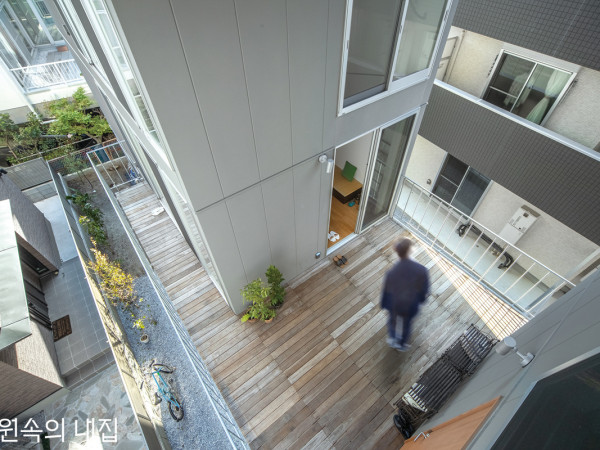 길고 큰 지붕 아래 둥지를 튼 두 가족. 바다 옆 작은 마을에서 그들은 함께 사는 기쁨을 만끽하는 중이다.전면도로에서 본 주택의 동쪽 외관. 주변의 3층 건물로부터 적당한 거리를 두며 본채와 별채가 앉혀졌다. 주택의 이름에서 Omoya(おもや)는 본채, Hanare(はなれ)는 별채를 의미한다. ⓒAkinobu Kawabe2층 테라스는 두 세대 간의 최소한의 프라이버시를 유지해주는 공간이자 동시에 가족의 자연스러운 교류가 시작되는 곳이다. ⓒShinkenchiku-sha 일본 카마쿠라역에서 100년 이상 운행되고 있는 전철 에노덴(江ノ電)을 타고 가옥들 사이로 깔린 선로를 따라 달린다. 5분 정도 지났을까. 바닷가가 인접한 조용한 마을에 다다른다.건축가가 처음 대지를 방문했을 당시, 큰 저택이 있던 넓은 토지는 이미 세분화되어 분양된 상태였다. 그리고 3층 규모의 주택과 아파트 건축이 예정되어 있었다. 도쿄의 일반적인 주택 분양지와 마찬가지로, 이곳 또한 건폐율이 최대한으로 이용되는 상황. 자연스레 건축과 카마쿠라 지역 특유의 외부 환경과의 관계를 어떻게 만들지가 관건이었다.SECTION①현관 ②침실 ③세면실 ④욕실 ⑤복도 ⑥외부 샤워실 ⑦외부 도마 ⑧서재 ⑨응접실 ⑩화장실 ⑪주차장 ⑫주방 ⑬식당 ⑭거실 ⑮테라스 ⑯다목적실 주택 설계는 ‘최소한의 주거공간’ 및 ‘최대한의 외부공간’을 원한, 건축주의 바람으로부터 시작했다. 이 두 가지 요구사항은 건축가에게 흥미롭고 새로운 착안점이 되어주었다.먼저 부모와 자녀세대, 두 가족의 생활공간을 콤팩트하게 계획하여 대지에 앉혀지는 볼륨을 최소화했다. 그로 인해 다소 협소하게 느껴질 내부공간은 주택 전체를 덮는 큰 처마를 설치하고, 생활영역을 외부로 확장시킴으로써 해결코자 했다.이와 함께 세대 간의 적절한 거리 확보도 중요 사항이었다. 먼저 폭 7m, 길이 25m의 땅 위에 크게 두 개로 나눈 볼륨을 이격배치하고 대지의 안쪽은 부모세대(본채), 도로에 면한 쪽은 자녀세대(별채) 영역으로 설정한 다음 그사이에 넓은 완충공간을 두었다. 뿐만 아니라 대지의 단변방향으로 두 볼륨을 어긋나게 놓아 상호 간의 독립성을 갖추는 것도 잊지 않았다.처마는 내·외부의 경계를 모호하게 하며 시각적으로는 실내 공간을 외부로 넓게 확장해주는 기능을 한다. ⓒShinkenchiku-sha 2층 본채의 식당은 야외 테라스와 이어진다. 처마 밑 테라스 너머 별채가 자리하고 있다. ⓒAkinobu KawabeHOUSE PLAN대지위치 ▶ 일본 카나가와현 카마쿠라시 대지면적 ▶ 184.13㎡(55.70평) | 건물규모 ▶ 지상 3층 건축면적 ▶ 81.02㎡(24.50평) | 연면적 ▶ 183.93㎡(55.64평) 건폐율 ▶ 44% | 용적률 ▶ 99.89% 주차대수 ▶ 2대 | 최고높이 ▶ 8.8m구조 ▶ 기초 – 철근콘크리트 매트기초 / 지상 – 중목구조 단열재 ▶ 그라스울 100mm | 외부마감재 ▶ 사이딩 14mm + 리신 뿜칠 창호재 ▶ 알루미늄새시 페어글라스(LIXIL) | 철물하드웨어 ▶ STROOG(수평, 수직 브레이스) 에너지원 ▶ 도시가스 조경 ▶ 타카그린필드 전기·기계 ▶ 이다전기 구조설계(내진) ▶ 타다슈우니 구조설계사무소시공 ▶ 신토시건설주식회사설계 ▶ NAOYA KAWABE ARCHITECTS(카와베 나오야 + 이규범) 1층 별채 서재는 외부 도마를 사이에 두고 본채와 적당한 거리를 유지한다. ⓒAkinobu Kawabe1층과 3층을 연결하는 계단실 ⓒAkinobu Kawabe다음은 실내 공간. 남북측 인접 대지에 지어질 3층 건물을 고려해 대지 동서방향의 실외 공간과 연계시키고, 제한적인 대지 폭의 이용가능성을 넓혔다. 1층 현관과 서재 사이에 위치한 외부 도마(마당과 같은 기능)는 주택 내에서도 공공성이 있는 공간으로, 전면도로에서의 동선과 대지 안쪽 공간을 연결하는 두 세대 외부와의 접점을 가진다. 또한, 2층의 테라스는 두 세대의 거실, 식당과 접하여 각 실의 기능을 확장시켜줄 수 있는 소통의 공간이자 부모와 자녀세대를 서로 분리한다. 계단을 따라 3층으로 오르면 이 주택의 가장 큰 특징 중 하나인 넓은 처마를 볼 수 있다. 이는 전면도로 너머 수목을 차경으로, 반대편 바다 쪽으로는 테라스를 사이에 두고 수평선이 이어지는 아름다운 모습을 조망하게 한다.SITEPLAN①현관 ②침실 ③세면실 ④욕실 ⑤복도 ⑥외부 샤워실 ⑦외부 도마 ⑧서재 ⑨응접실 ⑩화장실 ⑪주차장 ⑫주방 ⑬식당 ⑭거실 ⑮테라스 ⑯다목적실 2층 주방과 3층 다목적실 모습. 보이드에 걸려있는 브레이스(Brace)는 지진의 수평력에 저항하는 중요한 구조재로서, 인테리어에서 보여지는 목구조의 간결함과 소박함에 맞춰 구조부재를 꾸밈없이 노출시켰다. ⓒShinkenchiku-sha층마다 처마 밑 공간의 스케일감이 변화한다. 내부에서는 멀리 이웃의 정원을 차경으로 담아냈다. ⓒAkinobu KawabeINTERIOR SOURCE내부마감재 ▶ 벽 – 벽지 마감(sangetsu) / 바닥 – 스모크오크w120(Atom company), 타일(DAINAONE) / 천장 – 구조용 라치합판 24mm욕실 ▶ 유니트 바스1216(TOTO) | 수전 등 욕실기기 ▶ LAUFEN(Tform) 주방 가구 ▶ 본채 – plain K medium w2100(sanwa company) / 별채 – osso w1800(sanwa company)조명 ▶ DAIKO, PANASONIC, MAXRAY 계단재·난간 ▶ 오크원목 + 도장 / 스틸강관 Ø27.1 + 아연도금 마감 현관문 ▶ 제작(레드시더 + 도장) | 방문·붙박이장 ▶ 제작(올레핀시트) 데크