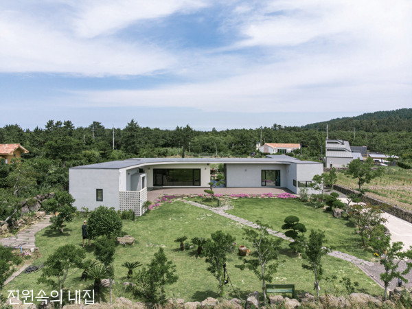 너른 데크와 플랫한 지붕, 독특한 실 구성을 가진 단층집은 제주 풍광에 다소곳이 안긴다. 남다른 형태와 동선이 생활마저 새롭게 이끄는 곳이다.낮은 돌담의 진입로와 너른 잔디 마당 뒤로 세 채의 개별동이 섰다. 각 채들은 고유한 기능을 담고 하나의 지붕으로 이어져 있다.제주도 동쪽, 선흘리 마을은 자연에 푹 파묻힌 중산간 지역이다. 오름 중 유일하게 유네스코 세계자연유산에 등재된 거문오름을 아래 두고 작은 오름들이 주위에 둘러 있다. 은퇴 후 플랜이 확고했던 건축주는 새로운 삶의 터전으로 오래전 이곳을 점찍었다. 5,000㎡가 넘는 전(田)을 구입해 1년여에 걸친 성토 끝에 완만한 땅을 만들었다. 대단위 토목 공사과 여러 인허가들로 지칠 만도 했지만, 그럴수록 건축에 대한 열의는 더욱 강해졌다.직접 가꾼 식재료로 매 끼니를 만들고, 이웃이나 집을 찾는 손님에게 정성된 식사를 대접하는 일상. 그가 새로 짓는 집에서 보내고자 하는, 소소하지만 중요한 삶이었다. 그래서 애초에 원한 공간은 ‘최소의 거주’였고, 집의 모든 중심은 주방과 식당에 두고자 했다. 1층 전체는 주방으로 채우고 위로는 작은 침실이 있는 2층집을 꿈꿨으나, 건축가의 생각은 달랐다.가운데 동은 주방과 다이닝룸이, 좌우로는 주거공간이 이어진 제주쉴로의 외관HOUSE PLAN대지위치 ▶ 제주특별자치도 제주시 조천읍 선교로 159-22대지면적 ▶ 1,650㎡(500평) | 건물규모 ▶ 지상 1층건축면적 ▶ 211.1㎡(63.96평) | 연면적 ▶ 196.37㎡(59.5평)건폐율 ▶ 12.79% | 용적률 ▶ 11.90%주차대수 ▶ 2대 | 최고높이 ▶ 3.6m구조 ▶ 기초 - 철근콘크리트 매트기초 / 지상 – 중목구조단열재 ▶ 기초 바닥 - 비드법단열재 2종1호 100mm / 벽체 – 그라스울(존스맨빌) R11·R19·R30, 비드법단열재 2종1호 70mm / 난방 바닥 - EPS보드 60mm외부마감재 ▶ 테라코코리아 플렉시텍스(그래뉼) S/FLEX307, S/FLEX360지붕재 ▶ 니치하갈바륨(일본단열강판) | 담장재 ▶ 자연석 현무암 겹담쌓기창호재 ▶ 일본 YKKAP APW-430(더블로이유리 41mm, 에너지효율 1등급)철물하드웨어 ▶ 일본 중목구조 LVL목재 / TEC-1, P3철물공법에너지원 ▶ LPG조경 ▶ 제주 하와이 조경전기·기계, 설비 ▶ ㈜우보이엔지 | 구조설계(내진) ▶ ㈜단구조설계 및 감리 ▶ ㈜에이알에이건축사사무소 02-711-0210 www.ar-a.krINTERIOR SOURCE내부마감재 ▶ 벽 - 테라코 스터코 빈티지 / 천장 - 삼화페인트 백색 / 바닥 – 한솔 강마루 헤링본욕실 및 주방 타일 ▶ 국산, 이태리산(제주 한라타일)수전 등 욕실기기 ▶ 대림바스주방 가구 및 붙박이장 ▶ 멀바우 집성목 현장 제작조명 ▶ 건축주 직구현관문 ▶ 일본 YKK AP 베네토중문 ▶ 재현하늘창 알루미늄 3연동 | 방문 ▶ 재현하늘창 ABS 도어각 동을 이어주는 지붕은 한여름 햇빛을 가리고 비가 오는 날에도 야외를 한껏 쓸 수 있게 해 주는 고마운 처마를 만들어 낸다.유려한 곡선의 지붕선PLAN①현관 ②주방 ③거실 ④욕실 ⑤테라스 ⑥침실 ⑦세탁실 ⑧공용식당 ⑨보조주방 ⑩구들방 ⑪작업실 ⑫드레스룸 ⑬파우더룸㈜에이알에이건축사사무소 측은 굳이 2층집으로 지어 마을에서 돋보이기 보다 단층의 낮은 집이 제주 구릉지에 잘 어울린다고 여겼다. 진심 어린 설득에 건축주는 마음을 바꿨고, 자연에 순응하는 집의 초안이 그려졌다.건축가는 최소한의 기능적인 실을 먼저 나누고 이를 동선, 기능, 채광과 환기, 프라이버시 유무 등 여러 요소에 맞추어 조닝을 반복했다. 건축주가 원한 바 대로, 주방과 식당을 메인에 두고 나머지 실들을 기능에 맞춰 흩트리다 보니 세 개의 개별동이 생겼다. 가운데 주방+다이닝 공간을, 동쪽에 작업실이 딸린 본채와 남쪽에 게스트만을 위한 별채를 세우니, 마치 세 개의 섬이 하나의 지붕 아래 이어진 듯하다. 한옥의 지붕선과 제주의 전통주택에서 영감을 얻었다는 처마, 그리고 각 동을 잇는 넉넉한 데크 역시 제주의 변덕스런 날씨에도 야외 생활을 가능케 하는 공신이 되었다.DIAGRAM본채의 취미실 겸 침실. 창문을 통해 보이는 전경을 프레임에 담고자 했다.모든 가구는 공간에 맞춰 현장에서 제작되었다. 좌식 소파 역시 건축주의 아이디어다.게스트룸의 공용 공간 모습. 전면창을 통해 정원 풍경이 한눈에 들어온다.지역 특수성 때문에 애초 철근콘크리트로 설계된 집은 중목구조로 변경되었다. 혹시 모를 하자에 대비해 평지붕은 약간의 경사를 두고 방수 및 부자재 연결에 많은 공을 들였다. 시공 당시 지붕의 각 지점 경사도를 3% 이상으로 모델링하고, 부재의 완벽한 치수를 뽑아내는 등 건축가의 부단한 수고가 더해졌다. 각 동의 출입구는 사용성을 확장시키는 동선으로 배치하고, 각각의 독립성을 보장하는 데 주력했다.다이닝동 내부는 메인 주방과 식당, 보조주방으로 구성하고 키 큰 책장 앞으로 좌식 평상을 만들었다. 방문객은 자연스럽게 입식과 좌식을 넘나들며 열린 공간을 공유한다. 본채와 별채에는 주변 풍광을 창에 어떻게 담아내느냐에 주력하고, 가구들은 대부분 주문 제작해 소재와 톤을 맞췄다.건축주는 얼마 전부터 제주 여행객과 집을 공유하고 있다. 돌담을 쌓고 꽃을 가꾸고, 방문객들을 위해 아침상을 차리는, 그가 정말 원했던
