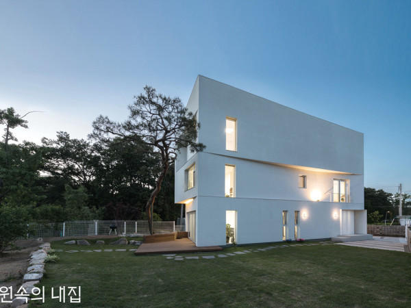 새벽녘, 은은한 조명에 의해 드러나는 집의 형태는 낮 시간 태양 아래에서 강렬한 선을 보여주는 볼륨과는 사뭇 다른 부드러운 느낌이다.위에서 내려다본 건물 전경. 층별로 각기 다른 형태의 볼륨이 대지 위에서 균형을 이루며 자리 잡고 있다. 경기도 파주에 운정동이라는 작은 마을이 있다. 어릴 적 러시아로 이민 가서 생활했던 가족들이 하나둘 한국으로 되돌아오면서, 이 마을에 모여 한 지붕 아래 정착하고자 한다. 부모님, 딸 둘, 그리고 다섯 마리의 강아지가 함께 살아갈 이 집은, 서로 떨어져 지내왔던 시간이 길었던 만큼 가족의 ‘집’을 마련한다는 것과 ‘집’이라는 한 공간에서 함께 한다는 사실에 설렘 반 걱정 반이었다.각기 다른 성격, 취향 그리고 개성을 가진 이 가족의 구성원은, 아버지(사업가), 어머니(주부), 큰딸(피아니스트), 작은딸(회사원)이다. 가족들이 가장 중요시한 사항은 강아지들이 함께 지낼 수 있는 공간과 개인 피아노 연습 및 레슨을 위한 공간, 기존에 심겨 있던 소나무의 보존이었다. 또한, 개인의 사생활이 가족 구성원 내에서나 이웃으로부터 존중되었으면 했고, 다양한 각도에서 경치를 즐길 수 있는 창, 마지막으로 간결하지만 힘 있는 집의 형태를 통해 이곳에서 다시 시작하는 가족의 존재가 새롭게 재정의되기를 바랐다.앞마당으로 이어지는 아늑한 돌담길가장 넓은 면이지만, 이웃과 마주 본다는 점을 고려해 적재적소에 창과 문을 배치했다. HOUSE PLAN대지위치 ▶ 경기도 파주시대지면적 ▶ 443㎡(134평) | 건물규모 ▶ 지상 3층건축면적 ▶ 88.56㎡(26.78평) | 연면적 ▶ 241.86㎡(103.41평) 건폐율 ▶ 19.99%(법정 20%) | 용적률 ▶ 54.88%(법정 80%) 주차대수 ▶ 2대 | 최고높이 ▶ 10.95m 구조 ▶ 기초 – 철근콘크리트 매트기초 / 지상 – 철근콘크리트 단열재 ▶ T125 비드법보온판 2종2호 가등급, T260 비드법보온판 1종2호 나등급 외부마감재 ▶ 스터코, 석고보드 2겹 | 담장재 ▶ 콘크리트블록 창호재 ▶ LG하우시스 시스템창호 에너지원 ▶ 도시가스 전기 ▶ 석우전기 | 기계 ▶ 도울 이엔지구조설계(내진)·시공 ▶ ㈜가운건설 설계담당 ▶ 이민식, 김병수설계 ▶ GEBDESIGN. 이창규 INTERIOR SOURCE내부마감재 ▶ 거실, 피아노실 – 보티치노 이태리 타일 / 방 – 동화자연마루 욕실 및 주방 타일 ▶ KCC 타일, 수입 타일 수전 등 욕실기기 ▶ 아메리칸스탠다드주방 가구 ▶ 카르텔, 공방 주문 제작 조명 ▶ 필립스 조명계단재·난간 ▶ 30mm 자작나무 합판 위 무광 래커, 12mm 강화유리 현관문 ▶ 철문 + 미송 주문 제작 중문·방문·붙박이장 ▶ 자작나무 합판 주문 제작 데크재 ▶ UPM 팀버 3층 데크 공간은 남쪽을 향해 틀어 주변으로부터 가족의 프라이버시가 보호된다. 이웃과의 관계에 의해 닫힌 벽과 작은 열림으로 만들어진 운치 있는 공간 먼저 가족에게 하나의 통일된 건축적 언어를 사용하여 단순·간결하지만, 힘 있는 볼륨감을 가진 ‘ZIG-ZAG HOUSE’를 제안하였다. 외부는 기본적으로 심플한 바(Bar) 형태를 가진 세 개의 볼륨을 쌓고, 그 내부에는 가족의 바람을 명료하게 넣어 표현하였다.같은 크기로 쌓은 볼륨들은 법적·지형적 조건, 거주자의 요구사항을 균형 있게 반영하여 볼륨 간의 섬세한 움직임으로 풀어냈다. 각각의 모서리가 맞닿는 선을 기준으로 각기 반대 방향으로 들어가고 나오며, 그 작은(Subtle) 움직임들이 모인 후 빛을 만나 그림자와 함께 강렬한 선을 만들어 낸다. 이러한 움직임으로부터 만들어진 선들은 다양한 방향성과 형태를 제시하여 선택적인 경치를 제공한다. 또한, 이웃과의 관계를 흥미롭게 만들어낼 뿐만 아니라 자칫 지루하게 느껴질 수 있는 ‘집’이라는 공간이 시간, 계절, 위치에 따라 매일 다르게 느껴질 수 있도록 한다.SECTION①현관 ②욕실 ③보일러실 ④강아지방 ⑤주방 ⑥거실 ⑦안방 ⑧세탁실 ⑨드레스룸 ⑩복도 ⑪방 ⑫피아노실 ⑬가족실 ⑭보조주방 ⑮테라스PLAN①현관 ②욕실 ③보일러실 ④강아지방 ⑤주방 ⑥거실 ⑦안방 ⑧세탁실 ⑨드레스룸 ⑩복도 ⑪방 ⑫피아노실 ⑬가족실 ⑭보조주방 ⑮테라스외부로부터의 접근을 살짝 등지듯 틀어져 자리 잡은 1층 현관의 볼륨은 주변으로부터의 시선을 차단해주는 동시에 강한 입구성을 갖는다. 집으로 들어서면 천으로 둘러싸인 듯 나열되어있는 하얀 금속 루버들이 내·외부를 부드럽게 경계 짓는다. 현관을 중심으로 오른쪽에는 손님방과 강아지 방, 계단실이 위치하고, 2층에서 수직으로 떨어지는 빛을 따라 몇 개의 계단을 내려가면 주방과 거실이 나타난다. 거실 창 너머로 백 년 된 소나무가 보이고, 그 뒤로 펼쳐진 넓은 정원에서는 강아지들이 마음껏 뛰놀 수 있다. 저 멀리 마을을 둘러싸고 있는 심학산도 집의 멋진 풍경이 되어준다.주방과 다용도실을 감싸듯 올라가는 계단을 따라 두 개의 다른 방향으로 틀어진 볼륨의 2층에 다다르면, 부모님 방과 작은딸 방을 연결해주는 복도가 나온다. 복도에는 걸어오는 방향에 따라 마을과 산의 다른 풍경이 보이는 정사각형 ‘창’이 있다. 2층 두 개의 방은 남서쪽으로는 사계절 산과 들의 풍광을 담아내고 남동쪽으로는 마을이 내려다보인다. 특히 방들은 모두 호텔식 