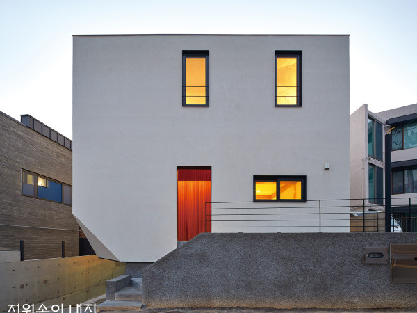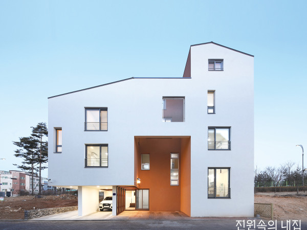 밝고 모던한 건물에 가까이 다가가자 오렌지빛 반전이 기다리고 있다. 퍼즐처럼 서로 다른 내부 구성에서는 건축가의 고민이 전해진다.경사지붕과 평지붕, 솔리드와 보이드, 무채색과 비비드 컬러가 균형을 이루는 외관손잡이가 없는 붙박이장 가구를 TV와 함께 짜넣었다. 벽면과 같은 깨끗한 수납 구성이 돋보인다.20년간 대학교에서 학생들에게 건축을 가르친 문선욱 교수. 다년간의 실무 경험, 건축·장식미술·도시 설계 등의 전공 학위, 각종 심의위원회 위원 등의 경력이 있지만, 그녀 역시 오랜 기간 남이 지은, 비슷하게 생긴 모양과 평면의 아파트에서 살아왔다.본인은 충남 홍성에 있는 학교로 출강하고, 남편은 출장이 잦았다. 대학에 진학한 자녀들이 학교 근처로 주거지를 옮기면서, 집의 의미가 서서히 달라짐을 체감했고, 변화의 필요성을 느꼈다.그렇게 본인의 집을 짓기로 결심한 문 교수는 10년 넘게 살아온 생활 근거지인 파주 내 택지지구에 땅을 샀다. 온 가족이 함께 모이는 때가 많지 않아 큰 집 대신 노후대책을 겸해 다가구주택으로 방향을 잡았다. 교육자로서 이왕이면 보통의 임차인도 시중에 공급되는 판에 박힌 유형의 집이 아닌 개성 있는 공간을 경험케 하고자 한 바람도 있었다.SECTION①주차장 ②현관 ③주방 ④거실 ⑤방 ⑥파우더룸 ⑦욕실 ⑧다락 ⑨옥상 정원대지는 선형 완충녹지에 인접해 환경과 조망에 유리하다. 도로 건너편으로는 학교가 있어 안전한 한편, 새로이 큰 건물이 들어설 염려가 적고 가족이 주로 머무는 밤이나 주말에는 인적이 드물어 프라이버시를 보장한다.매스는 배면의 경사지 지형을 살려 절토와 성토를 최소화하고 각 실을 스킵플로어로 배치했다. 덕분에 3층에 있는 집도 2층을 오르듯 가뿐하게 진입한다. 제한된 조건 안에서 모든 집이 빛과 바람이 원활하도록, 다른 공간에서 새로운 삶을 계획할 수 있도록 평면은 모두 다르게 구성했다.구조나 단열, 방수는 보수적으로 접근하되 창호를 비롯한 내·외장재는 가성비를 1원칙으로 삼아 전 세대에 동일하게 적용했다. 대신 색채에 주목해 전체 외관은 아이보리색이 감도는 미장으로 마감하고, 집의 얼굴이 되는 안쪽 스킨에 오렌지색을 칠해 따뜻한 느낌을 주었다.내부 인테리어는 화이트톤을 주조로 하고, 짙은 빨간색을 칠한 주방 벽면, 청록색의 소파 등으로 컬러 포인트를 주었다.가족이 가장 자주 모이는 다이닝 공간. 아일랜드가 널찍해 주방 일을 도와주는 사람도 마주보며 동선의 꼬임 없이 수월하게 자리 잡을 수 있다.(위, 아래 사진)주방 뒤편으로 계단을 오르면 마주하는 옥상 테라스. 주방과 가까워 야외에서 치르는 손님 맞이에 용이한 동선이다.HOUSE PLAN대지위치▶ 경기도 파주시 |대지면적▶ 267.1㎡(80.79평) |건물규모▶ 지상 3층 + 다락건축면적▶ 157.41㎡(47.61평) |연면적▶ 331.35㎡(100.23평)건폐율▶ 58.93% |용적률▶ 124.05%주차대수▶ 6대 |최고높이▶ 12.8m구조▶ 기초 - 철근콘크리트 매트기초 / 지상 – 벽, 지붕 : 철근콘크리트단열재▶ 비드법단열재 2종3호 120mm(외단열) + 내단열외부마감재▶ 외벽 – 스터코플렉스 / 지붕 – 컬러강판|담장재▶ 구조목 담장창호재▶ 예림 PVC 이중창호(에너지등급 2등급) |에너지원▶ 도시가스, 태양광전기·기계▶ ㈜지엠엔지니어링구조설계▶ ㈜퀀텀엔지니어링설계▶ 문선욱(청운대학교), 건축사사무소 FM스페이스시공▶ ㈜칸하우스총공사비▶ 7.5억원 (인테리어, 조경 및 토목공사비 포함, 설계비 및 감리비 제외)POINTPOINT 1 - 전면부 보이드와 색채 사용계단실의 채광을 위해 전면부에 보이드를 내고 안쪽엔 채도가 높은 오렌지색으로 마감해 생기 있는 주택의 이미지를 연출했다.POINT 2 - 내외부 넘나드는 순환 동선주방에서 시작되어 두 개층의 테라스를 건너 다락까지 연결되는 순환 동선은 실용적인 동선 활용도를 선사하는 동시에 공간 활용에 재미를 준다.DIAGRAM실내의 불빛이 은은하게 새어나오는 주택의 야경완충 녹지에 면해 있어 택지지구 내 다른 주택에 비해 프라이버시와 환경적인 면에서 유리하다.그러나 시공은 결코 만만치 않았다. 깐깐하게 시공팀을 대하기보다 비위를 맞추고, 돈을 제때 안 주면 재료를 누락할까봐 비용을 미리 지불하는 등 선의를 보였지만 돌아온 건 날림 공사와 어긋난 일정이었다. 심지어 계단 높이가 달라도 그냥 넘어가자고 할 정도였다. 결국 처음의 시공사와 타절을 하고 새 시공자를 섭외해 상당 부분을 걷어낸 후 다시 작업해야 했다.이상과 현실의 괴리를 뼈아프게 경험하며 우여곡절 끝에 집을 짓고 난 후 건축가로서도 새로이 마음을 다잡게 되었다는 문선욱 교수. “이사를 오고 난 후 삶의 질이 달라졌다”는 둘째 딸과 “보기 드문 공간 구조라 집에 빨리 오고 싶다”며 만족하는 임대세대의 응원 덕분에 그래도 집짓기 잘했다고 소감을 전한다.이 집을 통해 가족과 임대 세대 모두 새로운 미래를 꿈꾸는 계기가 되길 바라는 마음으로 그녀는 ‘소풍채(소망이 풍성한 집)’라 이름을 붙였다.PLAN①주차장 ②현관 ③주방 ④거실 ⑤방 ⑥파우더룸 ⑦욕실 ⑧다락 ⑨옥상 정원문선욱 교수의 아늑한 서재 공간가중평균 높이를 맞추기