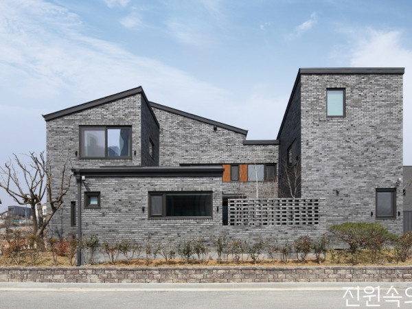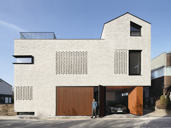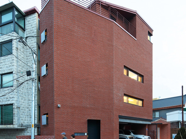 건물의 둥근 모서리가 오가는 이들의 발걸음을 멈춰 세운다. 막연히 떠오르는 집의 이미지를 탈피한, 조금 남다른 주택을 만났다.가로변 북쪽(정면) 입면. 단순한 매스에서 벽과 테라스의 깊이감을 곡면과 경사면으로 표현했다. 남쪽의 온실은 3면이 개방되어 다용도 공간으로 활용된다.부부와 아이 2명이 사는 집. 보통 ‘아이들이 사는 집’, ‘평창동 주택’이라고 하면 떠올리는 이미지가 있다. 평창동 벽돌집은 일단 그 두 가지 이미지로부터 벗어나고자 했다. 어린아이가 좋아할 만한, 뛰며 자라날 수 있는 장소와 동선을 만들면서도 어른들도 함께 사는 곳임을 잊지 않았다. 부모가 행복한 것을 보면서 자녀도 그런 어른으로 자랄 수 있는 집을 바랐다. 아이들을 위한 배려, 예를 들어 낮은 창대와 세면대, 넓은 욕조, 순환하는 재미있는 동선, 천장과 바닥의 높이 변화 등이 곳곳에 있으면서도 어른들이 사는 세상 속 품위가 있고 편리한 집을 만들려 했다.SECTION ②거실 ③주방/식당 ④다용도실 ⑦화장실 ⑩침실 ⑪발코니사선과 곡면으로 만들어진 매스는 보는 각도에 따라 얇고 부드럽게 느껴지기도, 두껍고 강하게 느껴지기도 한다. 테라스는 사적인 거주 공간과 공적인 도로 사이에서 전이 공간으로 작용한다.HOUSE PLAN대지위치 ▶ 서울시 종로구 평창동 | 대지면적 ▶ 314㎡(94.98평)건물규모 ▶ 지상 3층건축면적 ▶ 111.2㎡(33.63평) | 연면적 ▶ 275.77㎡(83.42평)건폐율 ▶ 35.41% | 용적률 ▶ 87.82%주차대수 ▶ 2대 | 최고높이 ▶ 11.60m구조 ▶ 기초 – 철근콘크리트 매트기초 / 지상 – 철근콘크리트단열재 ▶ 비드법단열재 2종1호 200mm(외벽), 비드법단열재 1종1호외부마감재 ▶ 외벽 – 백고벽돌 / 지붕 – 컬러강판담장재 ▶ 백고벽돌(불식쌓기) | 창호재 ▶ 이건 알루미늄 시스템창호 43mm 삼중이면로이유리, KCC PVC 시스템창호 삼중이면로이유리에너지원 ▶ 도시가스 | 전기·기계·설비 ▶ 승진설비토목 ▶ 현준토목 구조기술사사무소 | 구조설계(내진) ▶ 김앤이구조컨설턴트시공 ▶ 이노 앤 테크 이원우 010-2030-6693총공사비 ▶ 6억7천만원(설계비 및 가구 제외)설계 ▶ 준 아키텍츠 건축사사무소 김현석직사각형만으로 구성된 정원 쪽(남측) 입면은 기능적이면서 안정적이다. 데크는 거실과 연계되어 실내·외 생활을 이어준다.세 가지 다른 느낌의 외관이 주택만의 특징 중 하나는 보는 시각에 따라 다른 느낌을 준다는 것이다. 중심 잡힌 다양한 선들과 예각, 둔각, 원, 대각선이 이어져 만들어지는 건물 매스(Mass)의 묵직함은 보는 이에게 고요함과 동시에 역동감을 준다. 두 길이 만나는 입구 쪽의 곡선으로 크게 떨어지는 부드럽고 둥근 모서리는 반대쪽 각진 입면과 대조되어, 다른 방향의 길에서 각기 다른 느낌을 들게 한다. 둥근 모서리를 향해 흘러내리는 듯한 박공 형태의 지붕은 차분했던 건물 전체에 리듬감을 더해준다.2층 홀. 축의 엇갈림은 단순한 통로에 풍성한 공간감을 만든다. 아이방의 문은 수납장과 같은 재질로 제작해 평소에는 깔끔한 벽면으로 보인다.바닥에서 조금 내려간 거실은 아늑하고 개방적인 분위기를 동시에 주며, 같은 높이의 외부 데크로 연속된다.INTERIOR SOURCE내부마감재 ▶ 벽 – 친환경수성페인트(뿜칠) / 바닥 – 온돌마루(이건), 모자이크타일욕실 및 주방 타일 ▶ 윤현상재 수입타일(이탈리아)수전 등 욕실기기 ▶ CRESTIAL(독일), 대림바스주방 가구·붙박이장 ▶ 렉스가구 강채중조명 ▶ 국제조명계단재·난간 ▶ 화이트오크 원목현관문 및 방문 ▶ 제작데크재 ▶ 울린 방부목아일랜드식의 11자 주방과 식당. 식당의 창은 윈도우시트(Window Seat)로 사용된다.남쪽의 창과 동쪽의 테라스를 가진 안방. 테라스는 모서리 영롱쌓기로 다각의 빛이 벽돌 사이를 투과하여 내부까지 자연스레 스며든다.PLAN ①현관 ②거실 ③주방/식당 ④다용도실 ⑤주차장 ⑥온실 ⑦화장실 ⑧데크 ⑨드레스룸 ⑩침실 ⑪발코니 천장고 3.2m의 드레스룸은 많은 수납이 가능하다.온 가족이 함께 목욕할 수 있는 커다란 욕조가 있는 2층 욕실. 아이를 위해 낮은 높이의 세면대를 두었고, 세면대와 파우더 공간을 일체화시켜 깔끔하다. 작은 외부 공간방마다 있는 발코니들은 안팎을 이어주는 매개체 역할을 하는 동시에, 외부를 오가는 사람들과 사생활 침해 없는 소극적 교감을 만들어 낸다. 다양한 모양과 형태의 많은 창들은 자칫 답답할 뻔 했던 건물 전체에 해방감을 준다. 그와 더불어 때로는 둔각으로, 때로는 원으로 다양하게 꺾이는 창틀은 리듬감을 자아내는 동시에 사람들의 시선을 안으로 끌어들인다. < 글 :김현석>욕실과 공유하는 3층 작은 테라스는 외부와 내부를 연결한다.곡면과 사선으로 만들어지는 침실의 공간감이 테라스와 함께 특별한 느낌을 준다.1층 북쪽 테라스는 거실과 연계해 아이들의 실내놀이를 바깥으로 연장시킨다. 여름에는 시원한 그늘마당이 된다.건축가_김현석[준 아키텍츠 건축사사무소]연세대학교 건축공학과, 파리 라빌레트 국립고등건축학교에서 건축 및 도시설계를 전공하고 프랑스건축사(DPLG)와 한국건축사를 취득했다. 프랑스의 아뜰리에 리옹 파리본사와 서울지사에서 실무를 했으며, 201