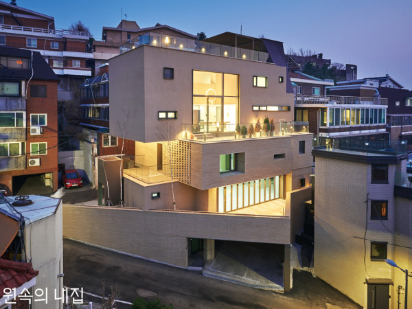 남산의 사계절 풍경을, 그것도 층마다 다른 느낌으로 조망할 수 있는 집. 각 층의 역할을 볼륨에 담아 쌓고 테라스와 연결 지은, 대지에 대한 현명한 답이다.서북쪽 파사드는 여러 가지 형태의 프레임으로 다양한 남산의 뷰를 조망할 수 있다.집이 지어지는 주변 환경은 모두 다르다. 자녀 교육에 훌륭한 입지, 단지 중심 그리고 수직적인 고도 차이만 있는 획일화된 성격의 대다수 아파트와 달리, 특정 용도의 독립 건축물은 사회적 배경 장치가 다를 수밖에 없다. 장점도 있고, 단점도 있다.복합 공간인 ‘리틀 발코니’는 남산 북쪽 방향 수직 고도의 위치적 정점에 있다. 산 반대편 남쪽 방향의 동일 고도 집들이 한강을 내려서 조망할 수 있는 최적의 위치라면, 북쪽의 이 사이트는 남산을 적당한 거리에서 즐길 수 있는, 최고의 도심 뷰를 가진다. 비스타(Vista)는 취향이겠지만, 개인적으로는 계절의 변화를 느끼고 시선을 올려다 볼 수 있는 마운틴 뷰를 선호한다.SECTION①주차장 ②B1F 근린생활시설 ③화장실 ④테라스 ⑤침실 ⑥거실 ⑦아일랜드 주방 ⑧다이닝룸 ⑨화장실 ⑩서재 ⑪현관 ⑫리프트 ⑬파우더룸 ⑭복도 ⑮옥상건축적 산책로의 하이라이트인 옥상정원에서 바라 본 야경남산을 중심으로 한 마운틴 뷰라면 그 중심인 타워와의 조망 거리가 얼마나 적정한가로 그 위치적 가치가 결정된다고 볼 수도 있다. 너무 멀지도, 가깝지도 않은 최고의 적정한 거리가 감성의 극치를 선사한다. 남산 비스타로는 최고의 입지였다. 이로써 이 집은 넓게 펼쳐서 남산을 바라볼 수 있도록, 이미 대지에서부터 공간 방향이 결정되었다고 볼 수 있다.건축 프로그램은 아주 간략하게 정리되었다. 1, 2층 근린생활시설과 2, 3, 4층 복합 주거층. 자주 접하게 되는 꼬마빌딩의 형식이지만, 그 공간적 느낌은 각기 다르도록 계획했다. 북서향의 놀라운 뷰를 최대한 살리면서 남향의 빛을 끌어들이고, 동향의 아침 햇살을 그림자로 더 도드라지게 만들고자 블록 겹쳐쌓기로 입면에 필터링을 주었다. 뷰와 빛, 이 자연의 현상을 집으로 끌어들이는 것만으로 설계의 절반 이상이 채워졌다.2층 테라스와 큐블록 겹쳐쌓기의 블러(Blur) 기능적 형태의 볼륨이 쌓여 건물 디자인의 비례감을 완성한다.HOUSE PLAN대지위치 ▶ 서울시 용산구 대지면적 ▶ 244㎡(73.94평) | 건물규모 ▶ 지하 1층, 지상 4층 건축면적 ▶ 144㎡(43.63평) | 연면적 ▶ 568㎡(172.12평) 건폐율 ▶ 59.23% | 용적률 ▶ 148.31% 주차대수 ▶ 6대 | 최고높이 ▶ 12m 구조 ▶ 철근콘크리트 단열재 ▶ LG하우시스 PF보드(페놀폼 보드) 외부마감재 ▶ 두라스택 큐블록, 금속, 스터코 | 담장재 ▶ 큐블럭 창호재 ▶ 이건창호 AWS 70mm 에너지원 ▶ 도시가스 조경 ▶ 플로라랩 설계 ▶ 장순각(한양대학교 교수), 제이이즈워킹건축사사무소 이창만 소장 감리 ▶ 제이이즈워킹건축사사무소DIAGRAM직사각형 볼륨 내에서 공간의 수평적 배치를 읽을 수 있다.안방에서 본 4층 공간의 깊이감공간 축은 자연스럽게 남산타워 방향의 경관축과 2중 도로의 축으로 다분화되었고, 이를 고려하여 창의 형태를 결정하고 테라스를 배치했다. 각 층은 모두 테라스로 이어진 반외부 상황을 중심으로 공간감을 극대화한다. 바람을 맞으며 남산을 느낄 수 있었으면 하는 바람이 1층 정원, 2, 3층의 테라스, 4층과 연결된 옥상정원의 결과물에 고스란히 담겼다.대지와 연계된 매스 디자인은 각각의 기능을 가진 볼륨의 형태를 도출했다. 지상 정원이 가능한 1층의 긴 직사각형 공간은 위층 같은 면적에 주방과 테이블을 구성했을 때 최적의 사이즈로 가로·세로 길이가 정해졌고, 주거와 근린생활시설의 하이브리드 기능을 하는 2층은 정사각형의 중성적 공간이자 무방향성을 가진다. 3, 4층 주거 공간 역시 거실의 기본 X축 방향 사이즈(소파 1,100mm, 사이공간 300mm, 테이블 1,200mm 그리고 65인치 TV가 최적으로 느껴지는 A/V Wall의 최적 거리 등)를 정하고, 이를 기반으로 주방, 복도, 아일랜드 테이블, 홀, 다용도 빅테이블, 복도, 창호, 테라스의 순서로 사이즈를 미리 계산하여 볼륨 크기를 정했다. 이것은 그대로 2층 위에 얹혀졌다. 훌륭한 테라스가 나왔고, 중앙의 보이드 공간은 적절한 크기로 외부 빛을 실내로 끌어들인다.현관부 수납장과 파티션4층 보이드를 거쳐 바라본 뷰PLAN①주차장 ②B1F 근린생활시설 ③화장실 ④테라스 ⑤침실 ⑥거실 ⑦아일랜드 주방 ⑧다이닝룸 ⑨화장실 ⑩서재 ⑪현관 ⑫리프트 ⑬파우더룸 ⑭복도 ⑮옥상다이닝룸에서 느껴지는 수직과 수평적 확장감4.2m 층고를 가진 계단실 재료의 조합4층에서는 건축적 산책로의 하이라이트라고 볼 수 있는 옥상정원으로 가는 전이공간을 만난다. 계단의 층간 높이를 그대로 살린 높은 층고는 수직 공간을 이동할 때 느낄 수 있는 심리적 지루함을 덜어내고, 긴장감을 선사한다. 자연석, 목재, 흰 벽, 그리고 거친 노출 콘크리트의 조합으로 재료의 대비감이 이를 증폭시킨다. 이러한 공간의 압축과 팽창은 3층 거실의 편백나무 숲의 보이드 공간과 그 볼륨적 맥락을 같이 한다. 가지런한 루버의 비례감과 선적인 미가 도드라지는 이곳이, 가족들이 가장 오랜 시간 머무는 장소다.더불