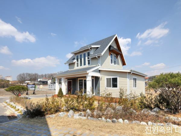 전국 어디든 한걸음에 갈 수 있는 거리, 우리나라 중심이라 불리는 '생거진천'에서 제2의 전원생활을 위한 딱 맞는 주택을 찾았다.서울과 1시간 반(진천IC 4㎞, 북진천 IC 10㎞) 거리진천 읍내 2㎞ 거리로 편의 시설은 지척에예로부터 충북 진천은 전국 어딜 가도 가까운 교통망과 자연 재해가 없는 명당 지역으로 알려져 있다. 이중에서도 진천 시내와 지척이면서 자연과도 가까운 터에 옹기종기 전원마을이 들어서 있다. 여느 주택 단지처럼 가파른 경사가 없고, 넉넉한 품새가 한눈에 들어오는 평지 마을이라 더 눈길이 간다.집은 토목과 도로, 기반 시설이 모두 끝난 평지 안에 개별 주차장과 단독 마당을 갖추고 있다. 기반 시설을 모두 지중화한 곳이라 시선에 걸림이 없어 쾌적한 느낌이다. 국내 최고의 목조주택 기술력으로 지어진 과감한 웨스턴 스타일의 외관이다.정통 북미식 목조주택의 포치를 강조한 이국적인 외관목구조 공법에 최적화된 마감재, 내구성까지 높여80평 남짓한 땅에 2층까지 총 32평 면적으로 지어진 집. 일반적인 전원주택에 비해 콤팩트한 사이즈지만, 외관에서 풍기는 인상은 정반대다. 데크 위 처마를 지지하는 포치 기둥 장식, 높은 층고가 만들어 낸 2층의 큰 세로창이 웅장한 분위기를 풍긴다. 특히, 다양한 지붕선으로 역동미를 내는 대신, 톤다운 된 컬러의 사이딩과 싱글을 택해 중심을 잡아주고 있다.안방 쪽에서 바라본 현관 출입구와 거실. 통창으로 외부 풍경이 한아름 담긴다. 현관부에서 바라본 거실. 안방 옆으로 외부 세면공간과 손님용 화장실이 이어진다.실내는 30평대 아파트 생활에 익숙한 실수요자의 취향을 정확히 반영했다. 1층은 거실, 주방, 손님용 화장실, 다용도실, 그리고 내부 욕실과 드레스룸이 딸린 안방으로 구성되었다. 2층은 서재형 복도와 방 2개로 배치해 4인 가족이 지내기 충분하다. 각 방마다 충분한 면적의 수납가구를 짜, 생활의 편의도 높였다.밝은 그레이톤으로 구성한 주방. 벽면의 웨인스코팅과 조화를 이루는 로맨틱한 분위기다. 다이닝룸에서 2층으로 오르는 계단. 계단실은 넉넉하게 구성해 동선에 불편이 없게 했다. 창을 통해 늘 환한 빛이 들어오는 1층 메인 침실 1층 및 2층 평면도건축개요주택 총 면적 :108.16㎡(32.77평) 1층 - 70.96㎡(21.46평) / 2층 - 37.20㎡(11.25평) 공법 :기초 - 철근콘크리트 단열줄기초 + 매트기초 / 지상 - 경량목구조 구조재 :벽 - 2×6 구조목 / 지붕 - 2×10 구조목+지붕트러스 지붕 :컬러 이중그림자싱글 단열재 :벽 - 수성연질폼 140㎜, 지붕 - 수성연질폼 235㎜ 외벽마감재 :컬러 시멘트사이딩 창호재 :삼익산업 시스템창호 담장재 : 디자인블록 철물하드웨어 :심슨스트롱타이, 메가타이 에너지원 :LPG 설계 및 시공 :리플래시하우스ZOOM IN _ 이 집에 적용된 선진 목조주택 기술, 트러스 공법진천 별밭마을 조감도이 주택은 공장에서 사전 제작해 현장에서 조립하는 패널라이징으로 목구조 트러스 공법으로 지어졌다. 트러스는 삼각형 모양으로 접합한 공학적 골조로, 큰 하중을 분산시켜 중간에 별도의 기둥이나 내력벽을 설치하지 않고, 긴 경간의 공간을 만들 수 있다. 국내에서는 충북 음성에 공장을 둔 리플래시기술㈜에서 자동화 시스템을 통해 목구조 트러스를 생산하고 있다. 리플래시기술은 이러한 패널라이징 기술을 적용해 경기도 양평 별밭마을, 충북 진천 별볕마을에 이어 충북 충주에 세 번째 별밭마을을 조성 중에 있다.www.refreshhouse.co.kr계단을 올라서자마자 만나는 2층 공간은 높은 층고로 압도감을 자아낸다. 일반 아파트에서는 상상도 할 수 없는 개방감에 적재적소의 키큰 창으로 자연 채광도 한가득. 계단실과 구획짓는 난간은 책장 형식으로 제작해 활용도를 높였고, 복도 끝에 위치한 욕실 역시 큰 창과 유리형 샤워부스로 외국의 한 호텔 같은 느낌을 자아낸다.지붕 경사에 딱 맞춰 버리는 공간 없이 수납장을 짠 2층방. 다른 한 개의 방은 목재루버로 내부를 마감하고 복층 다락을 제작해 아이의 상상력을 자극하는, 아지트 같은 공간을 만들었다. 이들은 모두 높은 층고였기에 가능한 구성이었다.인테리어내부마감재 :LG하우시스 벽지, 동화 강마루 욕실 및 주방 타일 :대림타일, 대보타일 수전 등 욕실기기 :아메리칸스탠다드 주방 가구 :한샘 #7000 베니스그레이 조명 :코콤 LED 외 계단재, 난간 :애쉬 집성목 현관문 :캡스톤도어 중문 및 방문 :예림 3연동, ABS도어 붙박이장 :한샘 데크재 :방킬라이블록 담장안에 아기자기하게 조성한 데크와 그네. 주택 둘레로 화단과 산책길이 빙 둘러 나 있다. 집은 땅을 포함해 건축까지 총 2억8천만원 정도 비용. 같은 면적으로 본다면, 인근의 충북 진천・음성 혁신도시의 신규 아파트 분양가와 비슷한 수준이다. 아이에게 층간소음에서 해방되어 땅을 밟는 즐거움을 주고, 은퇴 후 텃밭을 가꾸며 건강하게 사는 여생을 위한다면, 아파트와는 결코 비교할 수 없는 금액이지만.지금까지와는 다른 삶을 살고 싶다면, 공간을 옮기는 것이 최고의 방법이 될 수 있다. 진천 별밭마을의 주택은 그런 이들에게 아주 괜찮은 선택지가 될 것이다.취재_이세정| 사진_변종석ⓒ 월간 전원속의 내집 www.uujj.co.kr