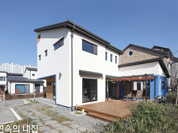 지나가는 사람들의 시선을 한눈에 끌어당기는 주택.건축주의 뚝심과 전문가의 재치가 만나 외부부터 실내까지 유쾌함이 가득하다.마당쪽으로 떨어지는 편경사 지붕을 적용해 도로에서는 사각의 모던한 인상을 줬다.파란 포인트 외벽이 눈길을 사로잡는 집, ‘장한채’에서 만난 건축주는 “집짓기는 어쩌면 이미 정해진 순리였을지도 모른다”며 이야기를 풀었다. 어릴적 주택 생활의 향수를 가지고 있던 건축주는 세 마리 고양이, 두 마리 개와 살며 주택에 대한 필요가 커지던 중이었다. 그러다 우연히 아산 지역에서 활동하는 ‘휴먼홈’의 최통일 대표가 지은 집들을 만나면서 본격적으로 집짓기에 나섰다. 주택의 장점만큼이나 겪었던 단점도 컸기에 망설이기도 했지만, 최 대표의 ‘요즘 주택’은 단열이나 기밀에 대한 편견을 깰 수 있는 기회가 되었다.“바로 공사에 들어간 건 아니었고 2년 정도 의견을 나누며 목표를 구체화하는 과정을 거쳤습니다. 돌이켜보면 고객이 될 지 안될지도 모르는 예비 건축주를 꾸준히 도와준 것도 참 고마운 일이었네요.”한편, 평생 한 번 있을지 모르는 집짓기이기에 건축주는 좀 더 재밌게 지어보고 싶었다. 남들같은 식상한 집 대신 취향과 아이덴티티가 담뿍 담긴 집을 원했다. 그렇게 둘은 집이라는 목표에 의기투합했다.2층 안방에 배치된 창문은 거실을 조망하며 서로 소통하는 통로로 기능한다.‘독특한 디자인’이란 목표로 시작했지만, 예산이라는 현실을 외면할 수는 없었다. 그래서 건축주와 최 대표가 머리를 맞댄 차별화 포인트는 고급 소재 대신 ‘컬러’였다. 처음에 건축주가 자유롭게 컬러를 제안했을 때 최 대표는 만류했지만, 건축주의 의지는 강했다.“타성에 젖어 무난한 디자인을 먼저 제안했던 것도 사실이었지만, 건축주와 함께 하면서 잠시 잊고 있던 도전의식이 살아나더군요.”그 결과 장한채는 오렌지, 블루 등 공간에 맞춘 각각의 아이덴티티 컬러를 가질 수 있게 되었다.SECTION①현관 ②거실 ③주방 겸 식당 ④팬트리 ⑤방 ⑥세탁실 ⑦반려동물실 ⑧욕실 ⑨안방 ⑩드레스룸 ⑪다락세탁실, 식당과 바로 접하는 데크는 전동 루프 어닝과 결합해 편의성과 활용도를 크게 높혔다.손님방과 식당 겸 주방으로 구성된 단층 매스는 파란색 스터코를 적용해 뚜렷한 구분감을 준다.외관의 발랄한 분위기는 하늘색 중문을 통해 안으로도 이어진다.출입문 앞은 캔틸레버를 적용해 포치처럼 바깥과 실내의 전환을 편리하게 한다.독특한 컬러와 마당의 녹음이 포인트인 식당. 가족 전용 카페의 역할을 톡톡히 한다.HOUSE PLAN대지위치▶ 충청남도 아산시 |대지면적▶ 286.1m2(86.69평) |건물규모▶ 지상 2층 + 다락건축면적▶ 95.49m2(28.93평) |연면적▶ 130.37m2(39.50평)건폐율▶ 33.38% |용적률▶ 45.57%주차대수▶ 1대 |최고높이▶ 8.59m구조▶ 기초 - 철근콘크리트 매트기초 1,150mm(동결심도 700mm) / 지상 - 벽 : 경량목구조 2×6 J-Grade 구조목 / 장선 - 2×12 S.P.F 구조목 / 지붕 - 2×8 J-Grade 구조목 + 레인스크린 이중지붕단열재▶ 기초 - 네오폴 단열재 나등급 120mm + 비드법단열재 2종1호 50mm / 외벽 - 그라스울 R21 + 비드법단열재 2종3호 50mm / 지붕 - 그라스울 R32 + 열반사단열재 6T, 비드법단열재외부마감재▶ 외벽 - 무절적삼목, 외단열 스터코 마감 / 지붕 – 이중그림자싱글 창호재 ▶ 삼익산업 INOUTIC 3중유리 독일식 시스템창호철물하드웨어▶ 심슨스트롱타이, 홀다운, 메가타이에너지원▶ 도시가스 |조경석▶ 현무암 판석 + 고흥석 판석전기·기계▶ ㈜다보이엔지 |설비▶ 설비장이실시설계▶ 천우인종합건축사사무소계획설계 및 시공▶ 휴먼홈 1811-7995 https://cafe.naver.com/no1tongil공간 배치에서도 최 대표는 몇 가지 모험을 제안했다. 남향에 침실이나 가족실을 주로 배치하는 것과 달리 세탁실에 남향을 전적으로 양보한 것. 덕분에 빨래 동선 효율이 높아져 건축주의 만족도가 특히 컸다. 또한, 주방 겸 식당은 거실과 분리해 공간이 달라지며 펼쳐지는 극적인 분위기 반전과 함께 별채나 카페 같은 독립 공간의 느낌을 줄 수 있었다. 반려동물 전용 공간은 위생관리가 쉬운 타일로 바닥 마감했고, 1층 욕실로 바로 이어지는 출입문을 추가로 놓아 동선을 효율적으로 구성했다.한편, 주택에 모든 면에는 크고 작은 창을 배치했다. 시야의 갑갑함을 피하고자 했던 건축주의 의도가 작용한 결과였는데, 덕분에 사면에서 풍경과 햇빛을 받아 들여 밝은 분위기를 연출한다.측면이 아닌 집 한가운데 계단을 배치해 현관으로부터의 동선 효율화, 실내 입체감을 둘 다 잡았다.그레이 컬러로 차분한 분위기를 내는 안방. 화장대와 서랍장은 거실 쪽으로 살짝 빼 생긴 자리에 배치했다.시선이 어디에 닿든 그 곳에 창문이 있다. 프라이버시를 조금 희생해도 채광과 풍경을 최대한 담고자 했던 건축주의 의지였다.PLAN①현관 ②거실 ③주방 겸 식당 ④팬트리 ⑤방 ⑥세탁실 ⑦반려동물실 ⑧욕실 ⑨안방 ⑩드레스룸 ⑪다락 1F – 90㎡ /2F - 40.37㎡ /ATTIC – 24.63㎡최 대표는 준공 후 감상에 대해 묻자 건축주를 보며 “어려운 건축주였고, 쉽지 않은 프로젝트였다”고 웃으며 이야기했다. 쉽지 않은 도전 과제를 연