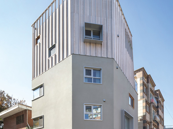 BEFORE28평 남짓한 대지는 단독주택과 저층 빌라들이 혼재된 동네의 삼거리에 위치하며, 원경으로 북한산의 수려한 풍경이 보이는 곳이었다.SECTIONB1F~1F카페·펍, 주차장 + 마당 + 현관RC기둥, 보구조 + 유리: 구조로부터 자유로운 1층의 벽을 투명하게 계획하여 협소한 카페·펍 공간이 동네를 향해 열려있도록 하고, 보이드 공간을 만들어 지하층과 지상층이 서로 확장될 수 있게 했다.2F~3F본채 주방 + 거실 + 침실 + 안방 + 드레스룸, 별채 현관 + 침실RC벽, 플랫슬래브구조 + 스터코: 외벽인 RC벽이 구조적인 역할을 하므로 주택 내부의 평면을 원하는 대로 구성할 수 있었다. 제한된 높이 안에서 층고를 최대한 확보하기 위해 플랫슬래브구조를 택했다.* 플랫슬래브(FLAT SLAB) : 슬래브가 보의 지지 없이 직접 철근콘크리트 기둥에 접하고, 여기에 직결된 2방향 이상의 배근을 갖는(휨에 안전하게) 철근콘크리트 슬래브4F~ATTIC별채 주방 + 욕실, 테라스 + 다락경골목구조, 중목구조 + 목재사이딩: RC구조의 부담을 줄여주기 위해 상부는 목구조로 시공했다. 목조 벽체 안에 단열재를 포함할 수 있기 때문에, 단열재 두께만큼의 공간을 추가로 확보할 수 있었다. 또한, 열린 평면에서 구조적인 역할까지 하는 중목구조로 자칫 밋밋할 수 있었던 집에 재료적 특성을 부여했다.‘지하서재’에 앉은 아버지와 아들. 카페·펍 인테리어는 아버지를 예전부터 잘 알던 지인이 맡아 가족의 취향을 온전히 담은 공간으로 만들었다. 유명한 예술가가 많이 오갔던 지역인 만큼, 앞으로 이곳에서 일어날 다양한 문화 활동을 구상 중이다.지하층과 1층을 연결하는 보이드 공간+WHERE제한된 예산 범위 내에서 두 가구의 생활공간을 마련하고 카페 등으로 활용이 가능한 최소한의 공간을 확보하기 위해서는 토지 매입 단계에서부터 신중해야 했다. 주거와 카페·펍으로서의 대지의 위치, 건축 가능한 면적, 예상 공사비 등을 건축가와 함께 의논하여 토지 매입을 결정했다. 작지만 ‘삼거리’라는 입지는 동네에서 좋은 역할을 할 가능성이 컸다. 건축주는 새로운 집이 동네 풍경에 보탬이 되면서 특유의 고유함으로 사랑받는 공간이 되길 바랐다.+WHO아파트에서의 삶에 만족하던 건축주가 집짓기를 결심하게 된 계기는 크게 두 가지였다. 자가(自家)를 보유하지 않은 주거 불안정과, 작은 공간이라도 가족이 함께 운영할 카페·펍을 겸한 문화공간의 마련. 3代가 같이 거주하며 가업을 영위해 나가는 집으로, 근대 이전 주거와 생산이 함께 이루어지던 시절의 ‘거주(居住)의 의미’를 회복하고자 했다. 각각의 생활공간과 일하는 공간을 분리함으로써 세대별 독립성과 휴식공간으로서의 안락함은 유지된다.+HOW협소주택인 만큼 설계단계에서부터 치수를 민감하게 생각했다. ‘협소’주택이지만 협소‘주택’이기 때문에, 생활공간은 ‘주거’로서 온전히 편안함을 느끼는 치수를 확보하려 했다. 따라서 일부 기능적 공간은 최대한 콤팩트하게 해결하고, 1~2cm의 시공 오차도 부담스러운 상황에서 내벽은 상대적으로 오차가 적은 건식 벽체로 계획했다. 두 가구와 카페·펍, 세 개의 독립된 공간의 특성과 도시의 다원성을 표현하기 위해 장소마다 구조와 재료를 모두 다르게 해석하였다.지하 1층부터 지상 4층까지 5개 층으로 이뤄진 주택. 계단에 대한 부담으로 처음에는 아들 세대가 상층부를 사용할 계획이었지만, 다락과 테라스에 애정이 컸던 부모님의 바람을 수용해 아들 세대가 2~3층, 부모님 세대가 3층 일부와 4층 및 다락을 쓰고 있다.아들 부부의 의견에 따라 계획된 툇마루와 긴 식탁이 있는 거실. 차도 마시고 아이와 책도 읽는 활용도 높은 공간이다. 집을 짓게 된 원동력이 되었던 딸(손녀)은 이사 후 매일 집 그림을 그릴 정도로 이곳을 좋아한다고.HOUSE PLAN대지위치▶ 서울시 성북구 |대지면적▶ 94㎡(28.43평) |건물규모▶ 지하 1층, 지상 4층 + 다락건축면적▶ 56.35㎡(17.04평) |연면적▶ 190.74㎡(57.69평)건폐율▶ 59.92% |용적률▶ 167.93%주차대수▶ 2대 |최고높이▶ 13.79m구조▶ 기초 – 철근콘크리트 매트기초 / 지상 – 철근콘크리트 기둥 + 보 구조(B1F~1F), 철근콘크리트 벽식구조(2F~3F), 목구조(4F, 다락, 지붕)단열재▶ 비드법보온판 가등급, 에코필 가등급, 그라스울외부마감재▶ 벽 – 스터코, 무절적삼목 사이딩 / 지붕 – 컬러강판담장재▶ 노출콘크리트, 두라스택 큐블록 Q6창호재▶ 필로브 시스템창호철물하드웨어▶ 심슨스트롱타이, ㈜경민산업 제작 철물 |에너지원▶ 도시가스전기·기계▶ 동호전기, 태성설비 | 토목 ▶ 우리토건구조설계(내진)▶ 모산이엔씨㈜시공▶ 지음재건설설계▶ ㈜솔토지빈건축사사무소 조남호 02-562-7576 www.soltos.kr3층 침실은 단차가 있는 좌식 형태로, 자연스러우면서도 편안한 느낌을 준다.2층과 3층을 연결하는 계단. 작은 창 위 아이 손이 닿을 높이에 책장을 두었다.3년 전만 해도 집을 지어 살리라고는 생각도 못 했다는 가족. 그저 공동주택에서의 삶이 편했고 그곳에서 만족스러운 일상을 보냈다. 그러다 ‘집짓기’라는 큰 사건이 예고도 없이 찾아왔다. 임대 기간에 맞춰 거처를 옮겨야 하는 불안정한 주거에 지쳐갈 때쯤, 부