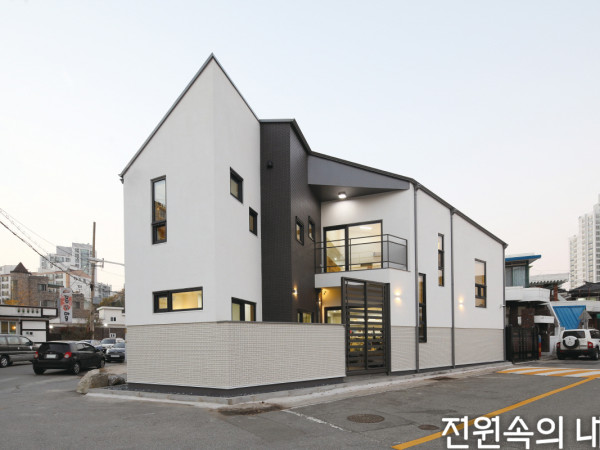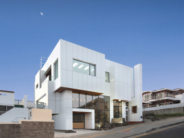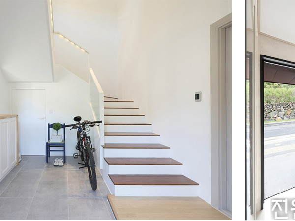 멀리 범섬이 바라보이는 주택가에 새하얀 건물 한 채가 놓였다. 퇴직 후 새로운 삶을 꿈꾸는 부부의 첫 주택 살이.* 집의 이름 ‘enllun’e’는 프랑스어로 ‘달빛을 받은’이란 뜻이다.1 - 입체적인 새하얀 외관의 주택 전경 2 - 멀리 범섬이 보이는 창가에 앉은 건축주. 아름다운 풍경 덕분에 집에서 가장 오래 머무는 공간이기도 하다.“40여 년의 공무원 생활을 마감하고, 여행을 떠났어요. 그곳에서 건축에 관한 이야기를 나누는 한 부녀(父女)의 모습이 눈에 들어왔죠. 이전까지 말 한 번 나누지 못했는데, 무슨 용기였는지 무얼 하시는 분이냐 대뜸 물었어요.”그것이 인연의 시작이었다. 낯선 타국에서 만난 건축가 가족과는 여행 후로도 서로에게 말벗이 되어주며 연락을 이어갔다. 그러던 어느 날, 건축주는 문득 집을 짓고 싶단 생각이 들었다고 한다. ‘늘 마음에 담아왔던 집짓기를 더 늦기 전에 실현해야겠다’ 그 뜻은 건축가에게도 고스란히 전달됐다.아파트를 벗어난 삶, 그리고 작은 갤러리가 있는 카페에 대한 동경. 집짓기라는 큰 결심을 하게 된 계기는 거창하진 않았다.HOUSE PLAN대지위치 ▶ 제주특별자치도 서귀포시 │ 대지면적 ▶ 294.8㎡(89.17평) │ 건물규모 ▶ 지상 2층 건축면적 ▶ 175.74㎡(53.16평) │ 연면적 ▶ 333.03㎡(100.74평) │ 건폐율 ▶ 59.61% 용적률 ▶ 112.97% │ 주차대수 ▶ 3대 │ 최고높이 ▶ 8.9m 구조 ▶ 기초 – 철근콘크리트 매트기초 / 지상 – 벽, 지붕 : 철근콘크리트 단열재 ▶ 외부 – 열반사단열재 6T + 비드법단열재 2종2호 70mm / 내부 – 비드법단열재 2종2호 30mm 외부마감재 ▶ 외벽 – 알루미늄 복합패널, 삼목사이딩 / 지붕 – 알루미늄 징크, 평지붕(우레탄방수 노출형) 창호재 ▶ 베카시스템창호 82mm PVC 3중 유리(로이+알곤충진+그린, 에너지등급 2등급), 더존창호 알루미늄 단열바 60×150(모짜바), 청림샤시 에너지원 ▶ LPG │ 조경석 ▶ 제주돌 │ 전기·기계 ▶ 대우전기 │ 설비 ▶ 천우설비 시공·토목 ▶ 화담파트너스 설계 ▶ 화담건축사사무소3 - 9m의 높이 제한으로 평지붕을 택했다. 4 - 앞으로 카페 겸 갤러리가 자리할 1층 내부. 경사지라는 악조건을 극복하고자 다양한 레벨을 적용해주었다.SECTION1 근린생활시설(카페&갤러리) 2 데크 3 화장실 4 주차장 5 입구(주거) 6 현관 7 거실 8 주방 9 다용도실 10 욕실 11 서재 12 안방 13 드레스룸 14 방 15 베란다 16 창고 17 다락PLAN2F - 173.22㎡ (ATTIC – 15.21㎡)1F - 159.81㎡5 - 2층 거주 공간으로 연결되는 계단실퇴직한 만큼 앞으로 새로운 무언가를 하고 싶단 바람이 컸다. 왜 힘들게 집을 짓냐며 반대하던 남편을 설득하고, 꼬박 두 달 걸려 지금의 터를 찾았다. 서귀포 앞바다 범섬이 한눈에 들어오는 그곳. 고민할 이유가 없었다.“혁신도시로 조성된 곳이라 택지 가격이 많이 오른 상태였어요. 그래서 최대한 공간을 효율적으로 활용하고, 그러면서도 실생활에서 편안한 거주를 보장해줄 수 있길 바랐죠.”설계와 시공에 참여한 화담파트너스 최종원 대표와 화담건축사사무소 조관형 건축사는 일단 경사진 도로에 면한 대지와 9m의 높이 및 층수 제한이 주는 제약을 다양한 레벨을 통해 극복하고, 건축주의 요구사항을 꼼꼼히 설계에 반영해주었다. 덕분에 부부가 꿈꿔온 지역 특성을 고려한 바람 잘 통하는 집, 아름다운 주변 풍광을 바라볼 수 있는 집 등 장점 많은 보금자리를 완성할 수 있었다.“부부가 평생 열심히 살아왔고, 앞으로 멋지게 마무리할 집인 만큼 가족의 역사와 추억이 아로새겨질 집을 가지게 해주고 싶었다”며 두 사람은 제주 첫 프로젝트에 대한 소회를 밝혔다.6 - 외부는 백색 알루미늄 복합패널로 마감하고, 삼목사이딩을 일부 사용해 포인트를 주었다. 1층 앞에 놓인 낮은 돌담이 모던한 건물 속에서 제주 정취를 느끼게 한다.HOUSE POINTPOINT 1 - 열 차단을 위한 외장재 뜨거운 햇빛을 막기 위해 태양광을 반사시키는 백색의 알루미늄 복합패널과 복사열 차단을 위한 열반사단열재를 추가 시공했다. POINT 2 -경사지를 극복한 설계 경사진 대지의 악조건을 역이용하여 1층은 3단의 다이내믹한 공간으로 완성하였다. 추후 갤러리형 카페를 만들 계획이다. POINT 3 - 공간을 활용한 임대세대 2층 건축주의 주거 부분을 제외한 남는 공간을 활용하여 수익형 원룸을 두었다. 사용성을 높이고자 다락을 배치해주었다.7 - 심플함을 기반으로 디자인된 거실. 풍경을 고려해 창을 두되, 결로 방지를 위해 내부 단열을 추가 시공하는 등 거주자의 편의를 배려했다.8 - 계단실의 창은 건물의 채광과 환기를 돕는다. 9 - 거실에서 바라본 주방과 현관 쪽 모습. 주방 우측에는 다용도실이 자리한다. INTERIOR SOURCE내부마감재 ▶ 벽 – DID 벽지 / 바닥 – 이건 강마루 │ 욕실 및 주방 타일 ▶ 수입타일 수전 등 욕실기기 ▶ 아메리칸스탠다드, 계림도기 │ 주방 가구· 붙박이장 ▶ 푸른싱크 조명 ▶ 서귀포 꽃보다 조명 │ 계단재·난간 ▶ 나왕집성 + 각관 제작 난간 현관문 ▶ 청림샤시 제작 │ 중문 ▶ 영림임업 3연동 도어, 망입유리 │ 방문 ▶ 영림도어 데크재 ▶ 천연데크 캠파스 19mm10 - ‘ㄷ’자형으로 배치된 주방은 실용성에 주안점을 두고, 동선 및 수납에 신경을 썼