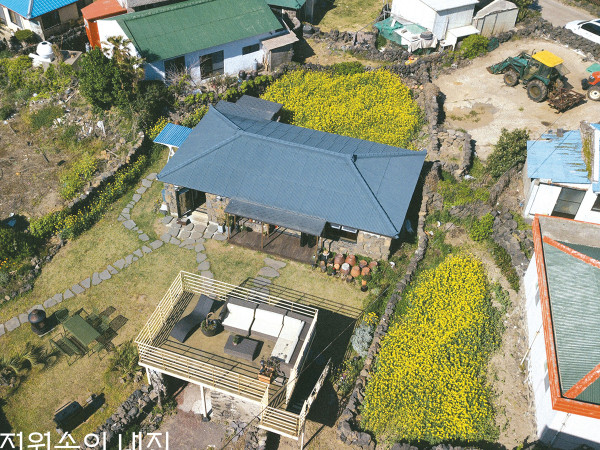 제주도가 고향인 부부가 취향을 담아 고친 돌집. 영화와 음악, 한가로운 바다가 있는 이곳엔 켜켜이 쌓인 시간의 멋, 레트로 감성이 진하게 묻어난다.향수를 불러일으키는 음악과 함께 창밖 마당, 바다와 하늘을 보며 쉴 수 있는 공간. 원형 러그는 아내 김수업 씨가 직접 만든 것이다.곽지해수욕장을 지나 큰 도로에서 골목으로 접어들자마자, 아담한 돌집 한 채가 거짓말처럼 나타난다. 예상치 못한 곳에서 맞닥뜨린 풍경이 마치 일상 속 갑작스레 찾아온 작은 선물 같다.“평소 시골집에 관심이 많았던 터라 부지런히 다녔어요.미용실 갈 시간은 없어도 부동산은 꼭 들를 만큼 발품을 많이 팔았죠. 마음에 드는 집을 아깝게 놓치는 일도 숱하게 겪었는데,덕분에 재빨리 결정할 수 있었던 것 같아요.”이 집의 주인인 임정훈, 김수업 씨 부부는 4~5년 전 처음 이곳을 만났다. 집을 판다는 말을 듣고 가격 흥정할 겨를도 없이 바로 계약서에 도장을 찍었다고.오밀조밀한 공간을 시원하게 튼 내부. 오른쪽에 욕실이 자리하고, 거실 겸 다이닝룸 너머로 주방이 보인다.한동안 비워 두었던 집은 1년 반쯤 전, 부부의 손을 거쳐 독채 펜션 ‘오후만 있던 일요일’로 문을 열었다. 처음엔 인테리어 업체에 리모델링을 완전히 맡겼지만, 마음에 영 들지 않아 공사를 중단했다. 두 팔을 걷어붙이고 나선 건, 직접 인테리어한 맥주펍 ‘LIFE’를 운영하는 남편 정훈 씨. 1980~90년대 감성의 레트로 스타일, 음악과 영화가 가득한 공간은 오롯이 그의 감각과 취향이다.마당과 건물 외관은 고스란히 살리되, 내부는 완전히 재구성했다. 나지막한 천장을 트자 세월의 흔적이 역력한 흙벽과 서까래가 드러났고, 대들보엔 상량문이 그대로 남아 있었다. 답답했던 벽을 헐어 구조를 널찍하게 변경하고, 창문도 적당한 위치에 새로 냈다. 대문 위 바다를 감상할 수 있는 루프톱은 슬레이트 지붕을 걷어내고 야외가구를 놓아 만든 것이다.“오래된 시골집이 한 채 또 있는데, 철거하면서 나온 고재들로 내부 문과 벽 등을 마감했어요. 도둑이 3번이나 들어서 바닥까지 다 뜯어가는 바람에, 쓸 수 있는 고재가 많지는 않았지만요(웃음).”주방에서 바라본 모습. 고재로 마감한 창고형 미닫이문과 천장 벽이 빈티지한 가구, 복고풍 포스터와 어우러져 개성 강한 공간을 완성한다.시간은 좀 걸렸지만, 욕실 문 손잡이, 주방 가구 손잡이 하나까지 직접 구매해 설치할 만큼 집은 부부의 손이 닿지 않은 곳이 없다. 빈티지한 조명과 가구, 소품 등은 대부분 여행길이나 벼룩시장에서 수집한 것들이다. 냉장고, 주방 펜던트 조명, 미닫이문 레일 등은 기존 제품에 외국에서 보내온 우편물에서 떼어서 모아둔 스티커를 붙여 세련된 레트로 스타일로 리폼했다. 할머니께 물려받은 앉은뱅이 찻상에 다리만 새로 달아 재탄생한 침대 협탁도 두 사람의 작품이다.마당과 바다가 보이는 창가에는 푹신한 소파와 턴테이블을 놓았다. 포인트가 된 네온사인 장식은 존 레논의 IMAGINE 앨범 재킷 사진을 모티프로 주문 제작한 것. 주방 벽에 걸린 철제 선반장은 비싸지 않은 물건이지만 칠이 벗겨진 느낌이 빈티지하게 잘 어우러진다. 그 안에는 영화 <화양연화>에서 배우 장만옥이 쓴 찻잔을 비롯해 수업 씨가 그동안 수집한 예쁜 잔들을 차곡차곡 넣어두었다. 찾아온 손님이 이를 알아봐 주고 잘 써주는 것만큼 기분 좋을 때가 없다고 말하는 그녀다.가장 안쪽에 자리한 침실. 꼭 필요한 가구만으로 아늑하게 꾸몄다.인더스트리얼 디자인의 식탁. 창밖으로 보이는 뒷마당에는 필 때를 기다리는 유채꽃이 가득하다.일자로 간소하게 마련한 주방에 서면 청정한 제주 해변이 그림처럼 담긴다.높은 박공지붕 선, 별도의 마감을 하지 않고 그대로 살린 흙벽이 인상적이다. 화창한 날엔 폴딩도어를 활짝 열어 앞마당을 누린다.INTERIOR SOURCELIVING ROOM벽: 던에드워드 페인트 도장, 목재 위 리베론 오일·BIOFA 하드왁스 마감 |바닥: 구정마루 어텀펄시몬 |네온사인: 오름네온 주문 제작 |테이블램프: Kartell |1인용 소파: Art n Craft |턴테이블: Pro–ject Audio |앰프: BOSE spatial reciever |스피커: BOSE 901 Ⅳ |조명 컨트롤: 필립스 Hue 3.0 |TV: 삼성 SERIFKITCHEN주방가구: 리지디자인 |주방후드: 하츠 |냉장고: 대우일렉 구매 후 리폼 |식탁등: 루이스폴센 |타일: 윤&정 타일|식탁·의자: 고트레BEDROOM방문: 자체 제작(고재 마감)|침대·화장대: 고트레|협탁: 리폼 제작|라탄 의자: 세덱 |거울: 고재 자체 제작|펜던트 조명: 스칸디나비아 디자인센터|테이블램프:필립스OUTDOOR폴딩도어: 폴첸|현관문: 엘네마|야외 테이블·의자: HAY|루프탑 야외가구: 선브렐라 |데크재: 방부목 + 씨라데코 우드 스테인뒷마당으로 나가는 출입구. 오묘한 레트로 감성을 살리는 조명과 화분 커버, 올리브 컬러를 칠해 리폼한 에어컨 등이 감각적이다.이른 봄이면 유채꽃이 만발하는 돌집의 전경. 대문 건물 위에 마련한 루프톱에서 감상하는 노을 진 바다 풍경도 일품이라고.TIP제주도 구옥 찾기 노하우시골 오래된 돌집은 부동산보다는 이장님이나 동네 사람들만 알음알음 아는 경우가 많으니, 마을 구석구석 자주 다녀보고 동네 분들과 친해지세요. 요